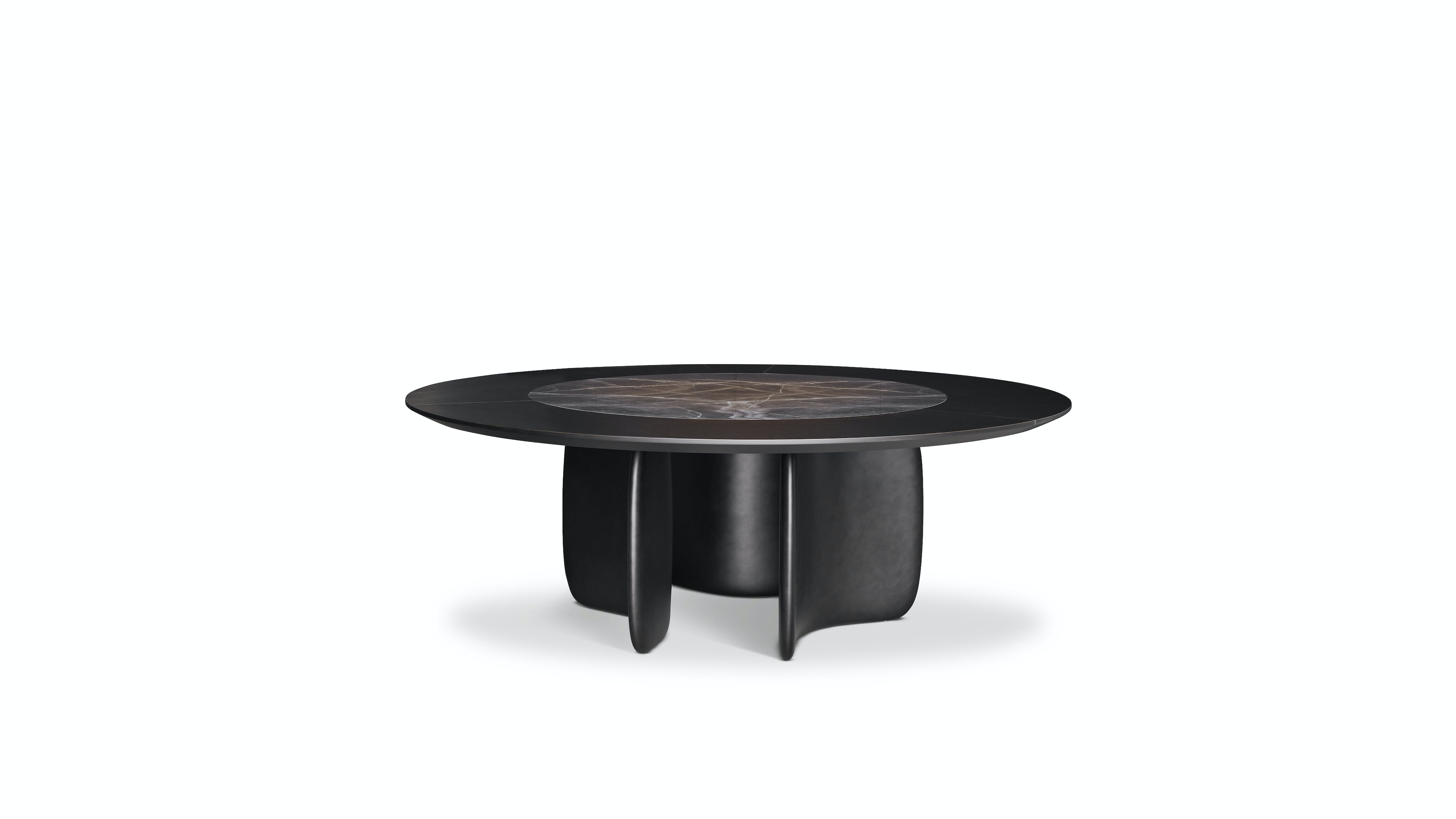 Conceived by Bartoli Design, Mellow features soft curvilinear shapes which are at the same time striking and sculptural. The base is made of curved elements moulded in high density polyurethane which in the new Mellow ST (Swivel Top) version, face outwards. The rounded shape of the base gives the structure a sinuous and balanced appearance, thus allowing the table to interact with the space in which it is inserted. The Mellow ST round design table also stands out on account of a large circular top, made using an external section in wood and a rotating internal ceramic section.
