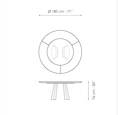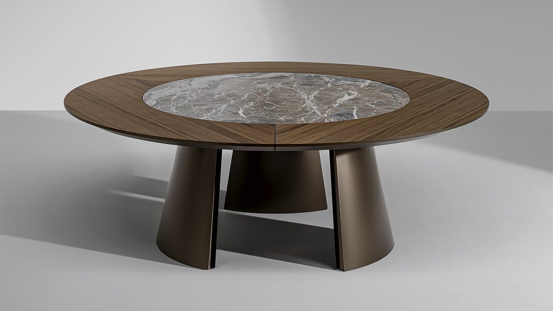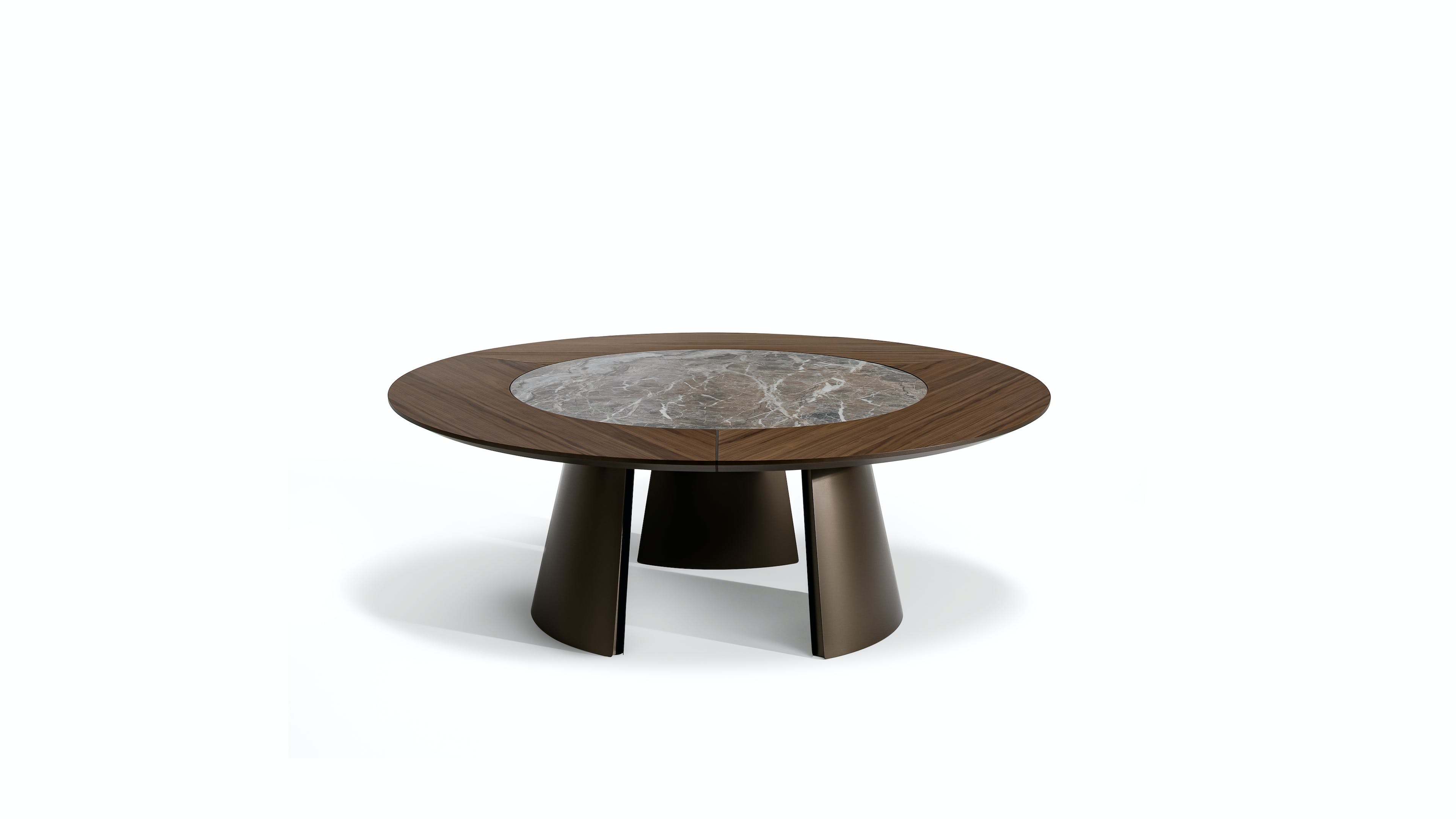 The Torii table designed by Marconato & Zappa clearly demonstrates its exotic inspiration: the slightly inclined metal elements that make up the base recall the entrances to Japanese Shinto shrines from which this round wooden table takes its name. The Torii ST (Swivel Top) version with rotating top catches the eye thanks to the large circular top surface which features an interesting interplay between materials and which combines the outermost wooden frame with a rotating central ceramic section. The result is a contrast of materials and finishes for a table with a significant theatrical presence.