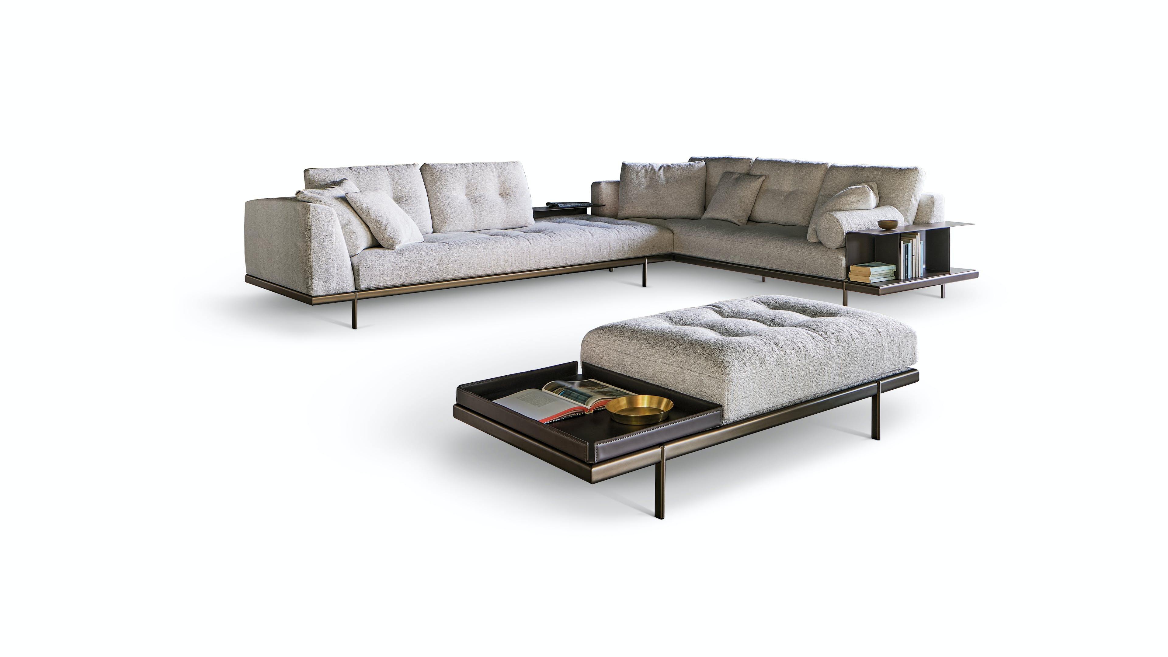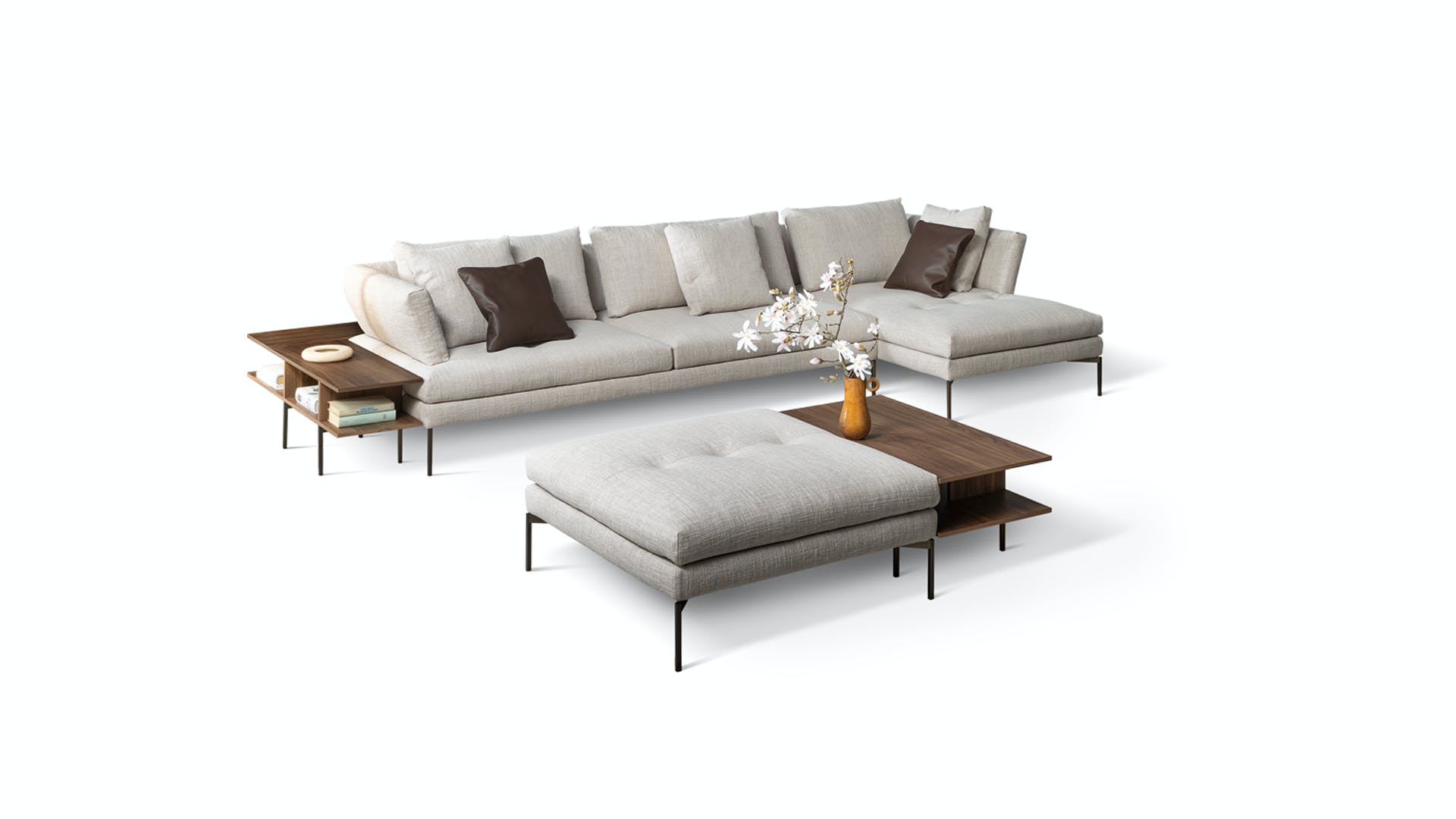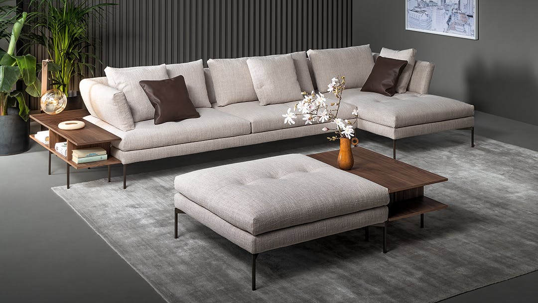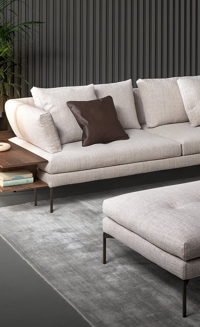 The fabric- or leather- covered frame with slender metal legs matches the cushions and backrests in various sizes, creating a visually light, yet restrained ensemble. The lightness of the ensemble is further emphasized by the slender, minimal shape of the metal feet, available in different colours. Thanks to its versatile elements, the sectional design sofas collection takes on different, interesting configurations for a living area with a focus on customization. The system is completed by the Aliante side tables, available in Canaletto walnut or with a ceramic top and made in different shapes and sizes, accessories that play with the space when positioned laterally, in front of the sofa or between two elements of the composition.