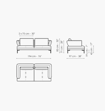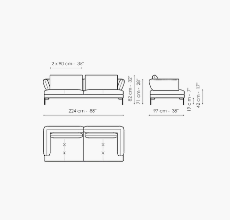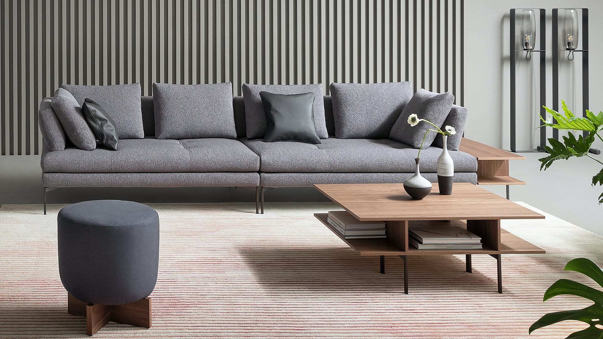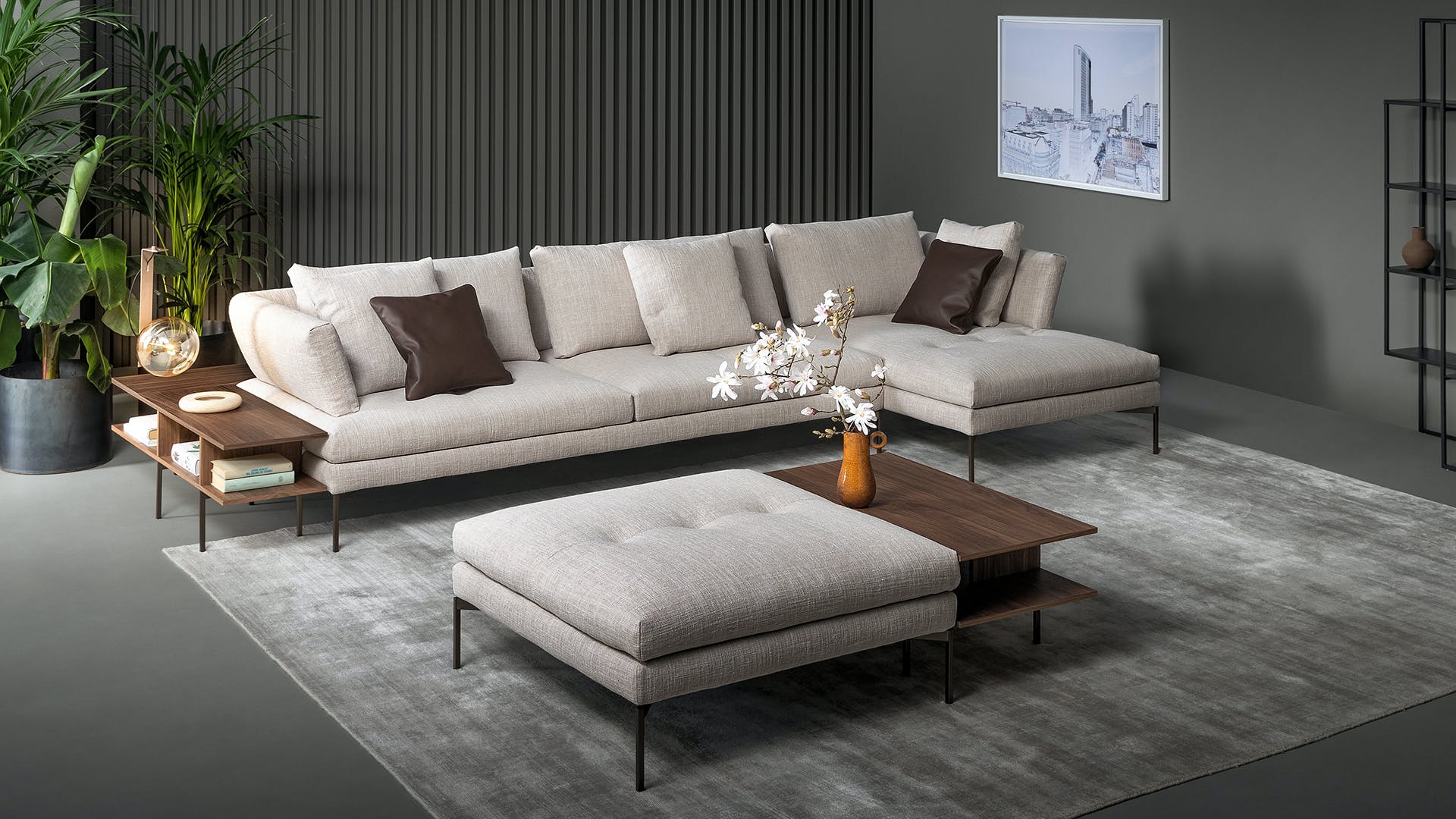 The fabric- or leather- covered frame with slender metal legs matches the cushions and backrests in various sizes, creating a visually light, yet restrained ensemble. The lightness of the ensemble is further emphasized by the slender, minimal shape of the metal feet, available in different colours. Thanks to its versatile elements, the sectional design sofas collection takes on different, interesting configurations for a living area with a focus on customization. The system is completed by the Aliante side tables, available in Canaletto walnut or with a ceramic top and made in different shapes and sizes, accessories that play with the space when positioned laterally, in front of the sofa or between two elements of the composition.