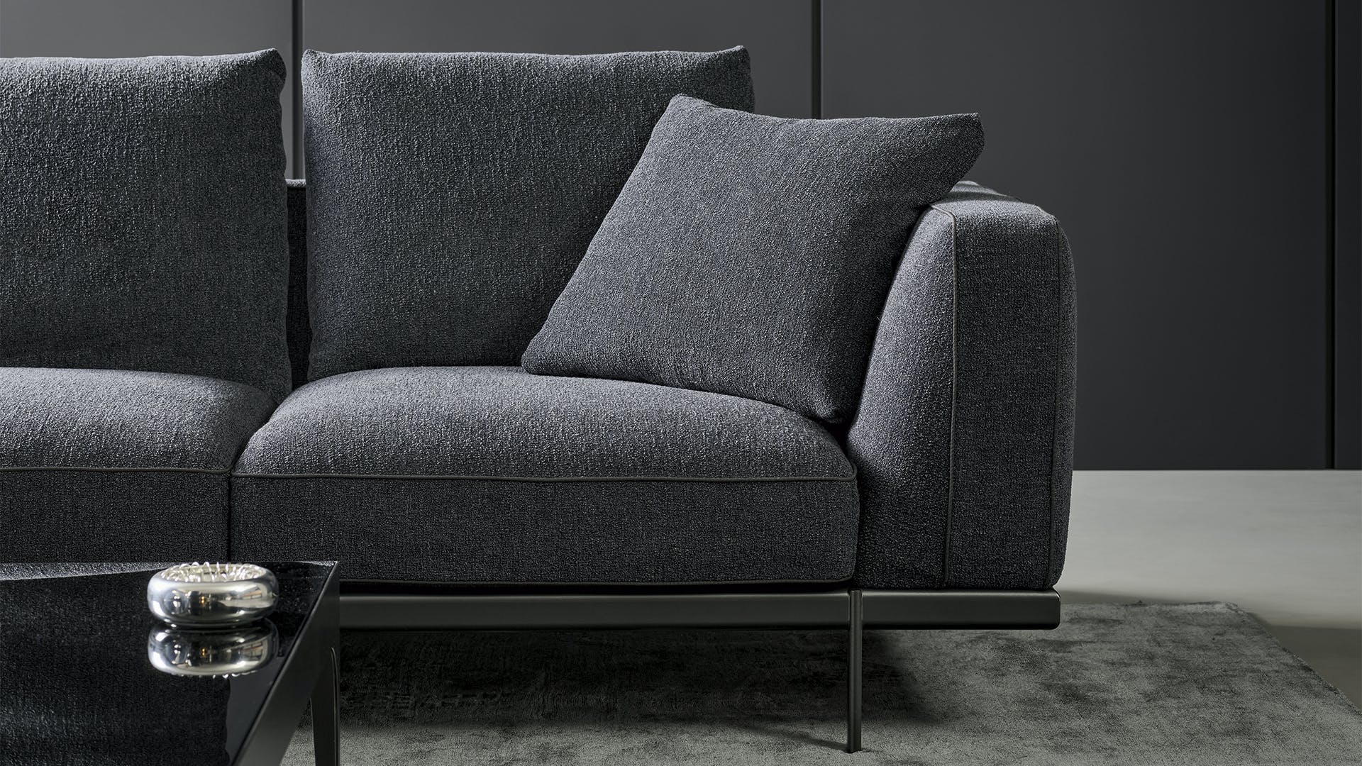 An elegant personality, a frame with a sense of lightness and generous upholstery are the characteristics that make Phil a suitable piece of furniture for any living area. The clean and rigorous lines of this sofa design are best emphasized by the detail present in the profile of the cushions, an original ornamental border in grosgrain which is available either in contrast or tone on tone for a uniform effect. The sofa is full of details and sartorial elements such as armrests, armrests with magazine rack, trays and tops in leather that complete and personalize the sofa, resulting in an elegant and versatile design. The Phil collection is available in the “Casual” version whose back cushions are reduced in size with spaces between them and the “Linear” version with larger back cushions side by side.
