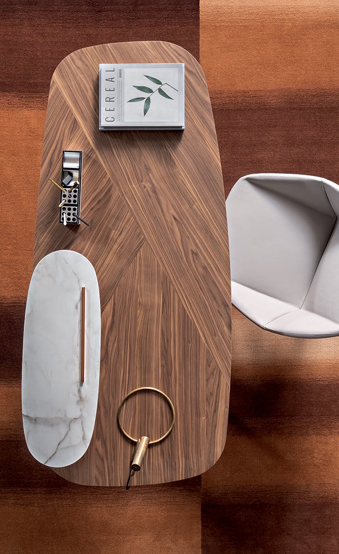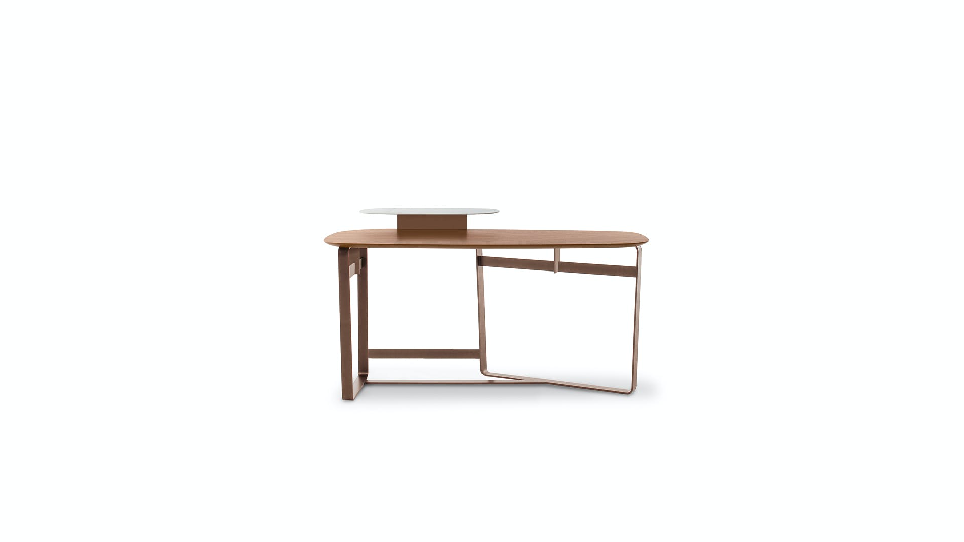 The Gauss modern wood writing desk features a curved, fluid top with no sharp edges, much like the legs, which take on the appearance of metal rings with rounded corners. The distinguishing feature of Gauss is the raised section, which creates a second level for the desk. In addition to the main desk top in wood, Gauss also offers a practical “floating” shelf made from ceramics, which is attached to the main desk via two metal bars. Gauss’s other unique detail is the shape of the legs, which stand in a dynamic, asymmetrical position, creating an irregular structure which lends a youthful, casual quality to the desk. In addition, the veining in the wood of the desk top adds dynamism, increasing the desk’s aesthetic impact. One possibility for customisation is the addition of a concealed round drawer in painted metal.