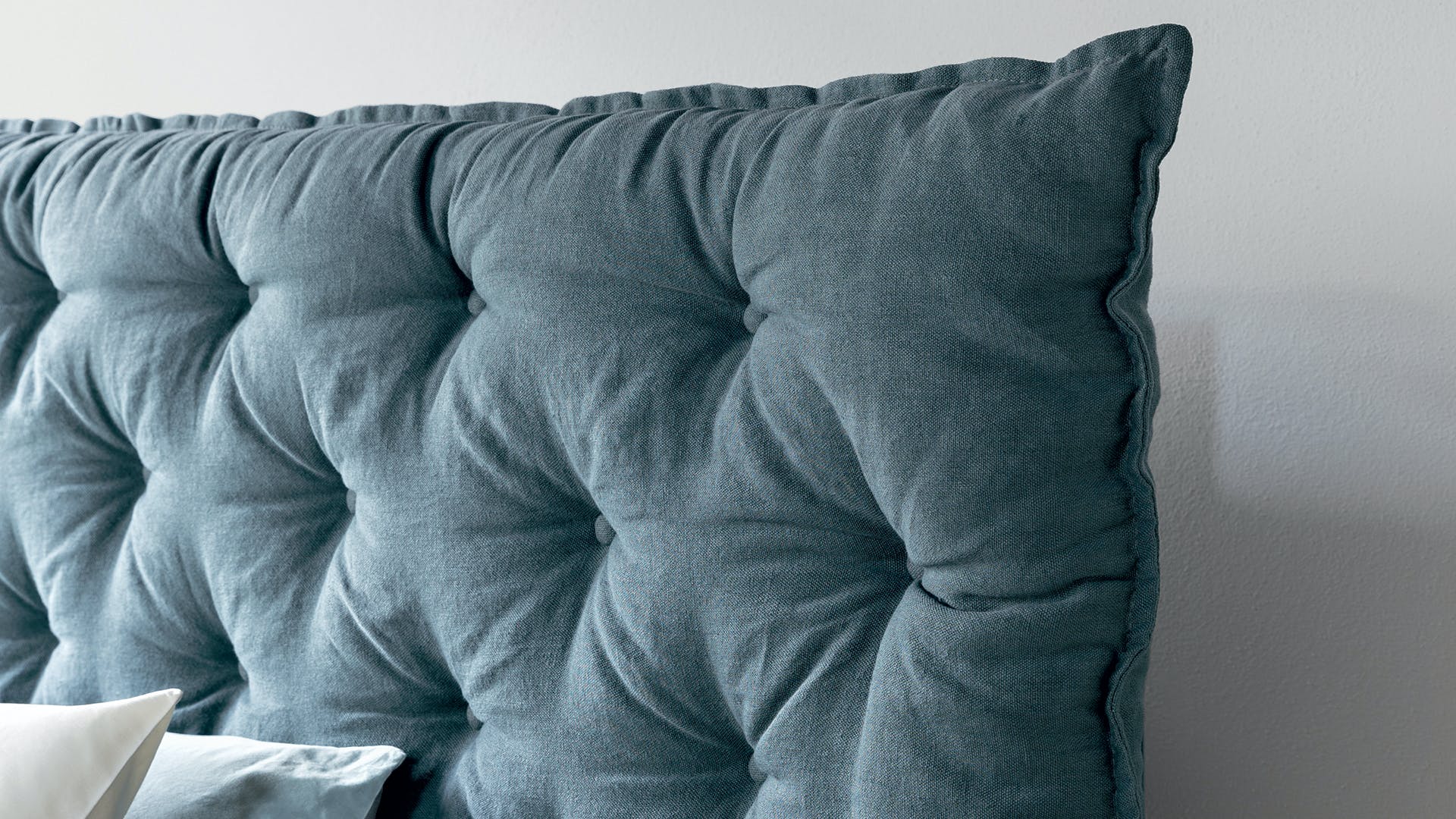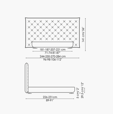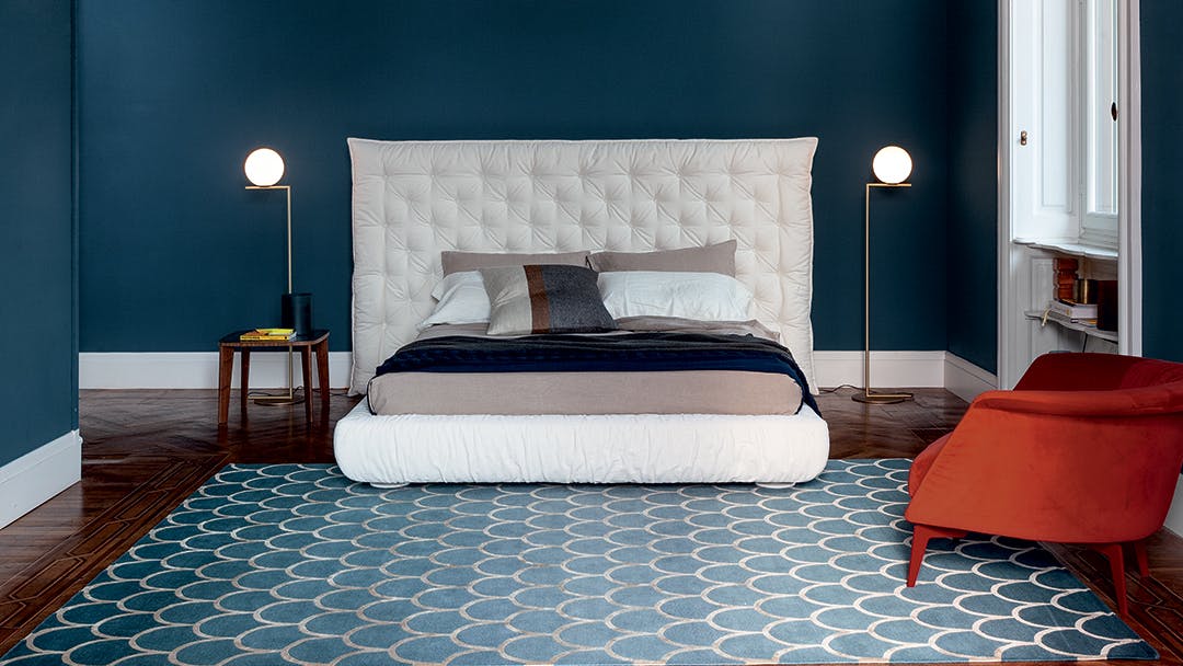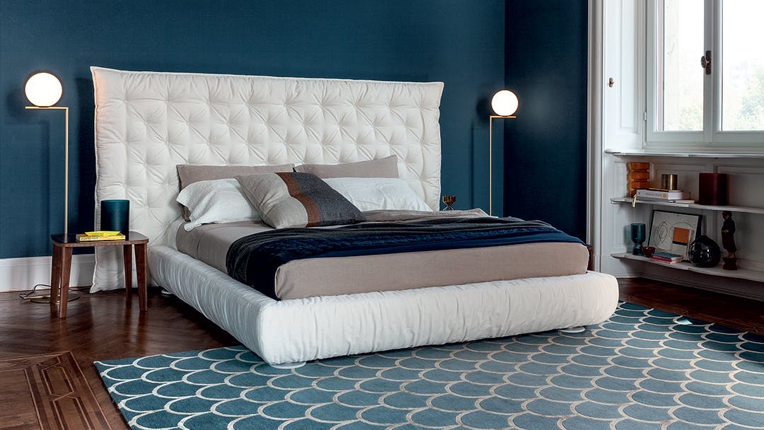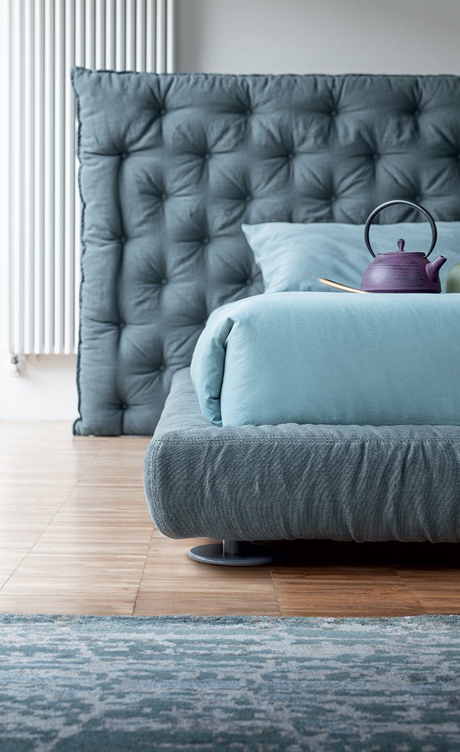 Full Moon is a double design bed with an opulent headboard that, with its sophisticated capitonné padding, frames the bed and provides a sense of abundance and softness, underlined by the draped bed frame. The version with the higher headboard (Full Moon hi) is also available with storage space (Full Moon hi open), which provides additional space for storing covers, cushions and everything necessary for the bedroom. Additional distinctive details are the painted metal circular feet, available in a series of colour variations. This bed, the name of which recalls the night, and specifically an evocative full moon, is the perfect companion for encouraging the sweetest and most relaxing dreams.