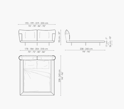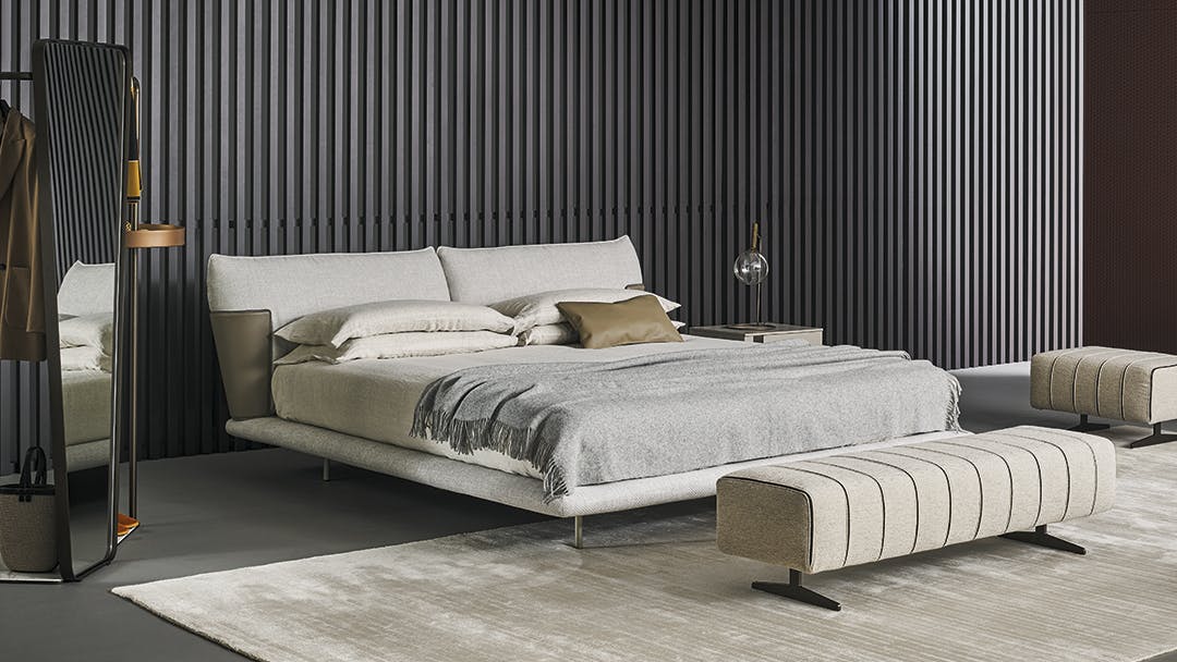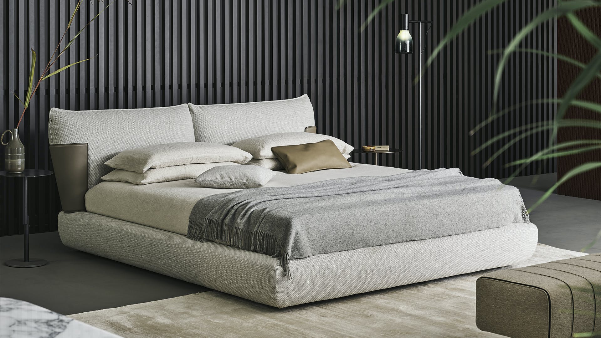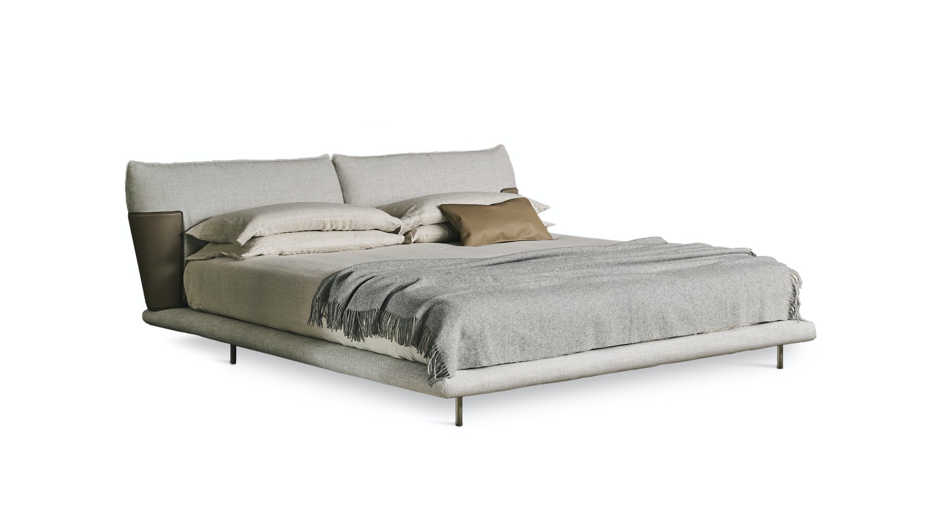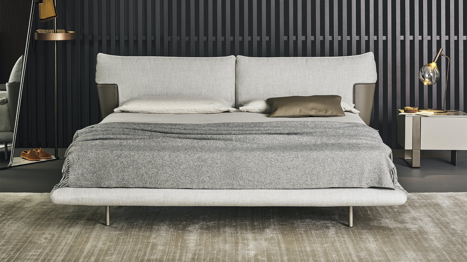The modern Blend bed: a strong and distinctive item. A headboard that plays on the combined design of an emery leather section and the softness of the cushioning. The composition of the structure adds value to the upholstered section, creating a rigorous line that widens upwards from the bottom, merging with the welcoming padded headrest, consisting of two big cushions. The overall effect is of a solution characterised by an elegant image and gentle composition. The emery leather section is an important aesthetic feature, a sort of frame that uses research into materials to create shapes that share a contemporary, elegant, dynamic, welcoming and soft feel.