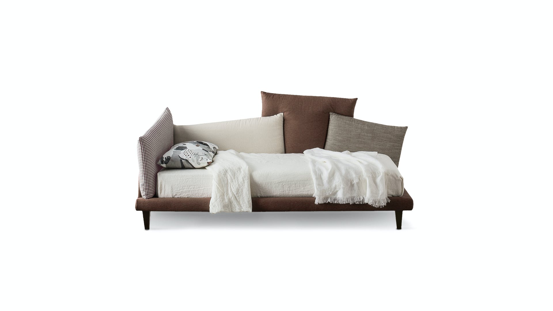 A disorderly combination of cushions that manages to be decorative and functional, discreet yet spectacular: this is the Picabia headboard, the corner single bed design with unusual lines that offers those who choose it numerous options for personalisation, giving maximum space to creativity for a unique result and effect. The covers of the cushions that make up the headboard and one side can be monochromatic, with graded effect or in contrast, in line with personal tastes, thereby giving the bed a completely different character depending on the selected combinations. The removable cover is made of fabric or leather. The wooden feet are available in grey anthracite or walnut wood or made of matt painted metal. Picabia is available in double or single versions