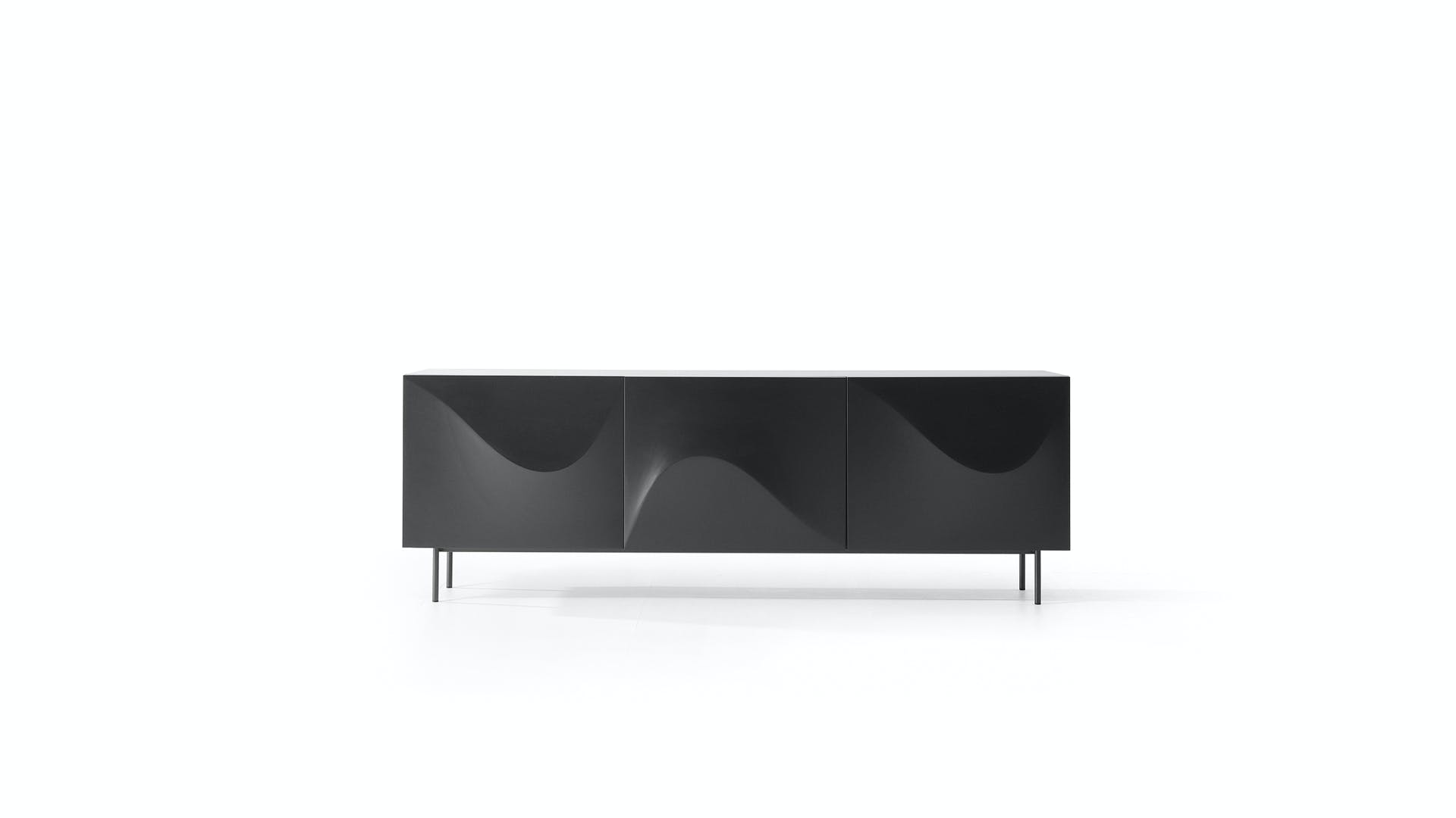 Inspired by the poster for Alfred Hitchcock’s film of the same name, the Vertigo design sideboard is distinguished by the soft wave that characterizes the front doors, creating a flow of movement on the surface that softens the rigorous design of the unit. The metal base consists of four seemingly slender feet that give the entire unit a sense of lightness. The Vertigo sideboard is available in three different colour combinations: white lacquered wood outer frame, white lacquered structural polyurethane doors, white metal base or matt bronze lacquered wood outer frame, bronze lacquered structural polyurethane doors, bronze metal base or matt lead lacquered wood outer frame, lead lacquered structural polyurethane doors, lead metal base.