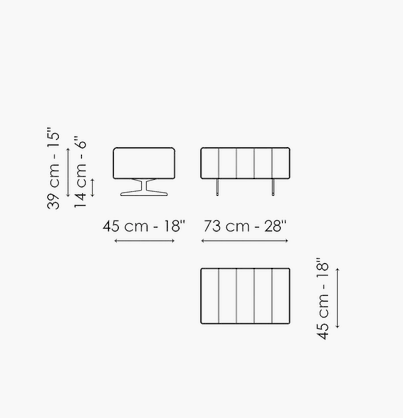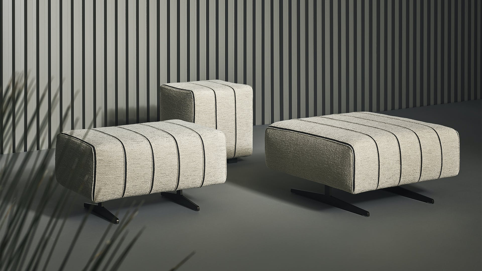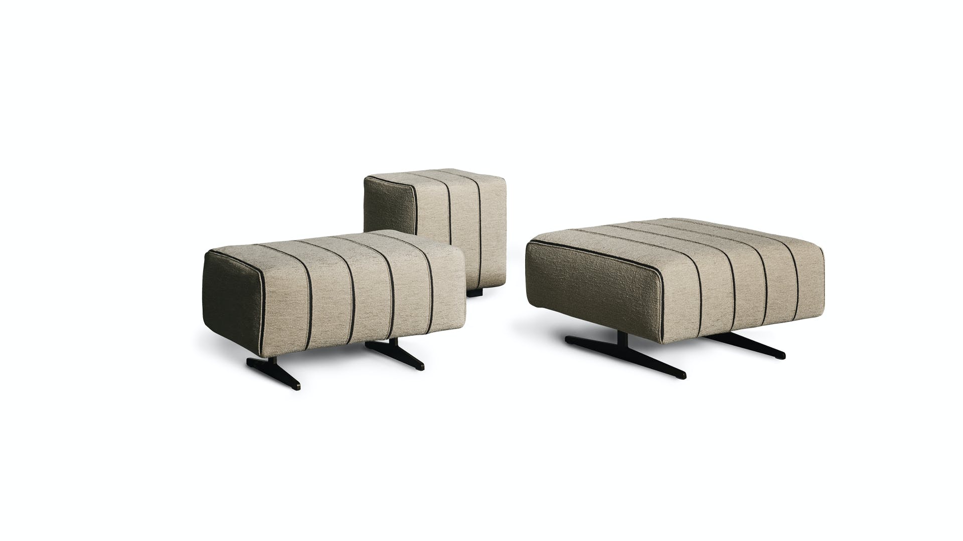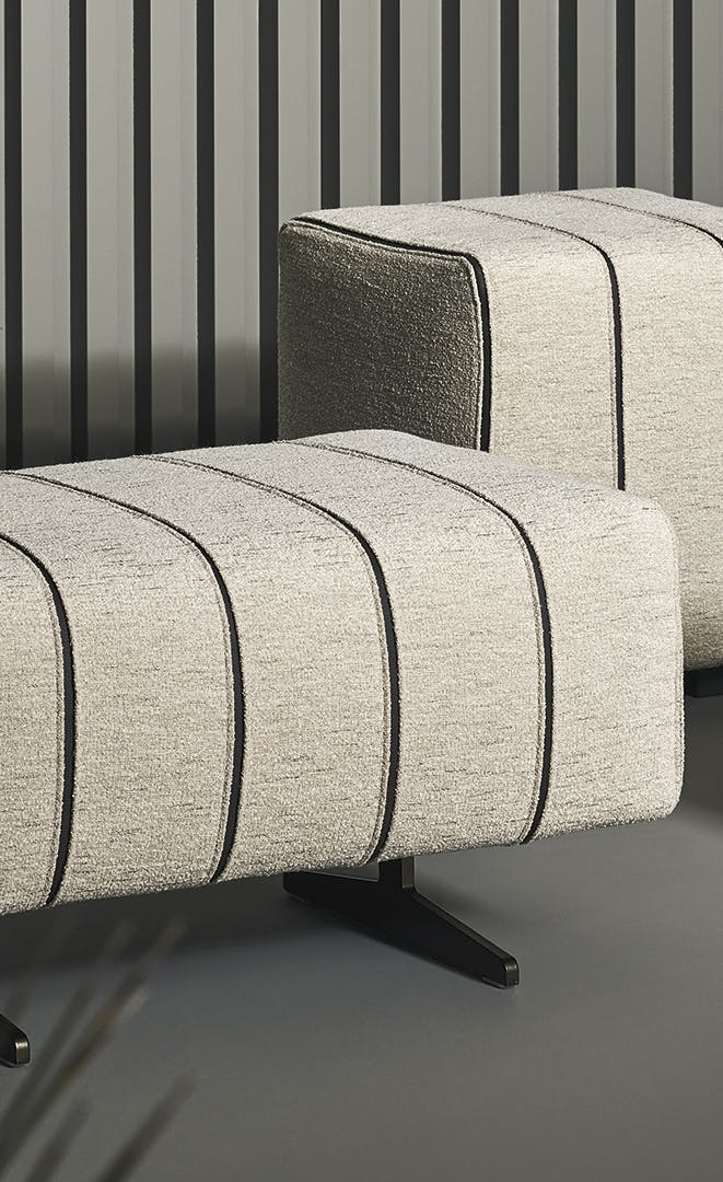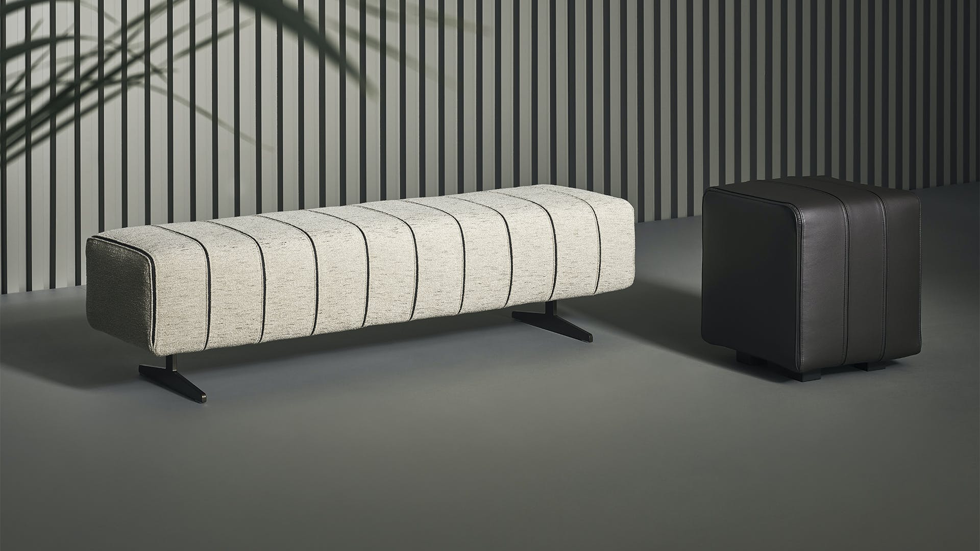 Mark is a collection of accessories for living and sleeping areas. Available both as a pouf and as a bench seat raised from the ground thanks to an unusual metal base, they are a triumph of tailoring, emphasised by the priceless details that characterise the entire collection. The striped pattern with double stitching is an indication that gives a speci?c aesthetic identity to the object, whether you choose an upholstery with contrasting stitching or a tone-on-tone one. The cover of the living room footstool and bench, available in numerous colour variations, is made of fabric or leather and is completely removable.