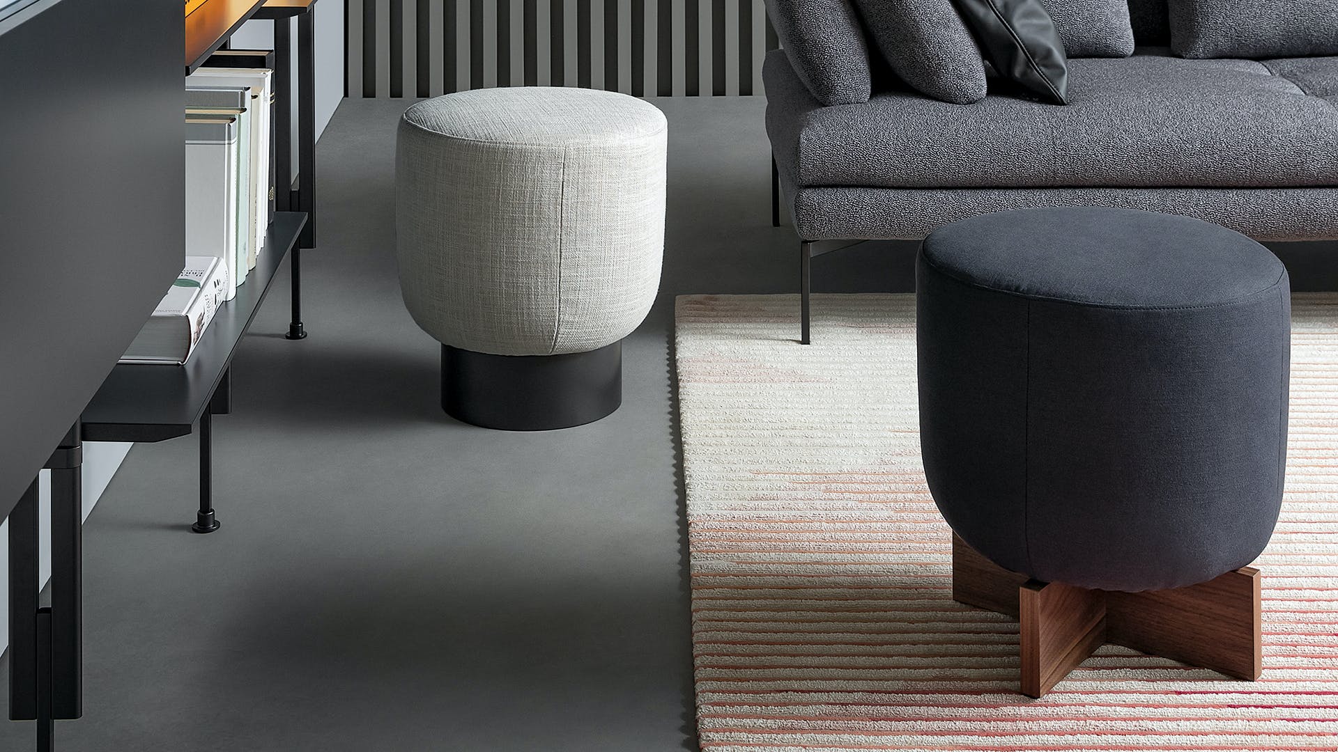 The padded top section is the same in both Belt and Cross modern footstools, with no straight lines but just curved surfaces that gently complement each other, gracefully floating on their base. They are distinguished by their bases, which give each of them a distinct personality: the Belt pouf’s round metal base plays with the concept of stability, while the Cross’s cross-shaped wooden base is the detail that makes this accessory immediately recognisable. While their similarities make them ideal for pairing together, like two members of the same family with opposing personalities that complement each other, it is their differences and the variety of possible combinations that create a dynamic, lively and constantly changing environment.