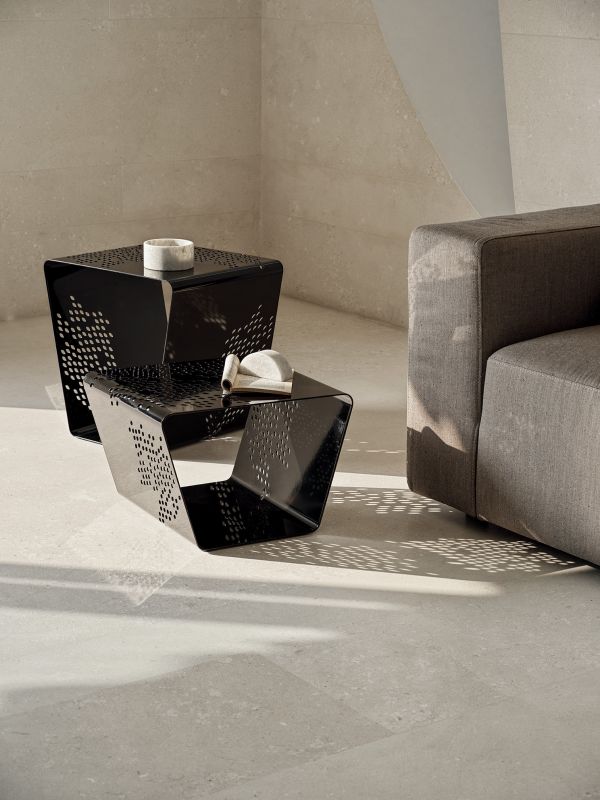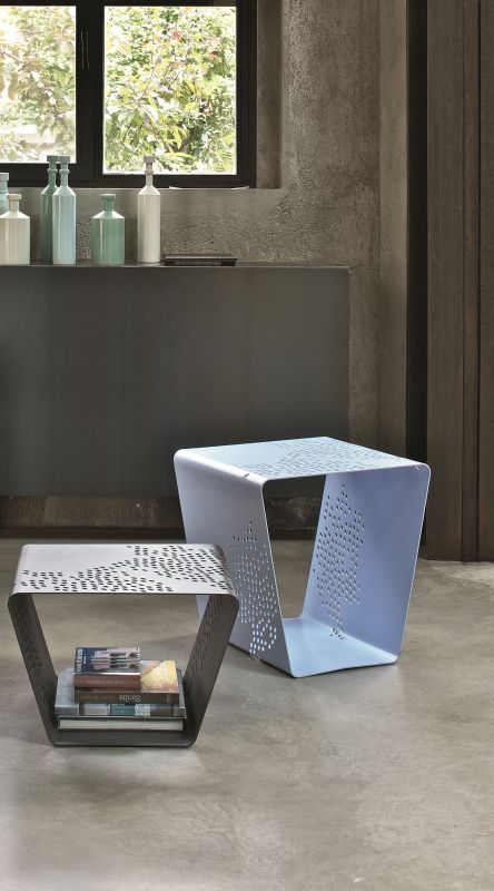Coffee table/ottomans/magazine rack in patterned lacquered Metal frame.