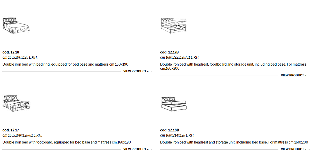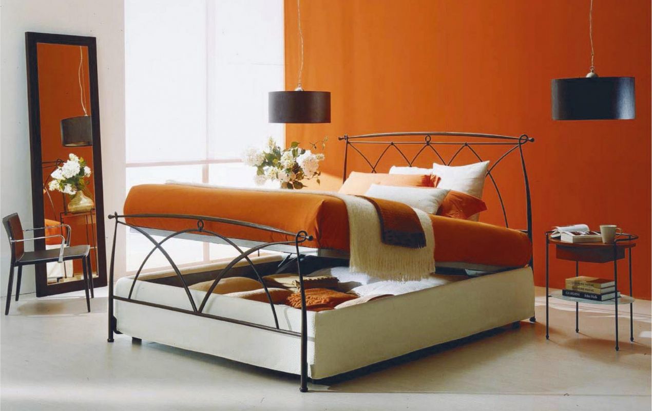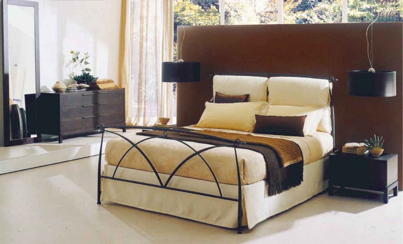 Iron bed in lacquered or hand-coated metal frame, in double version, with footboard, bed ring or storage unit.