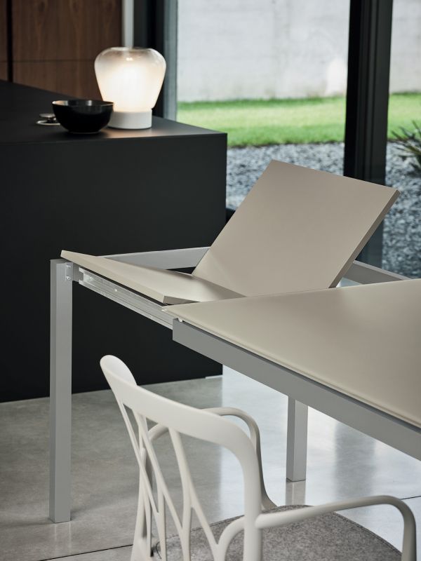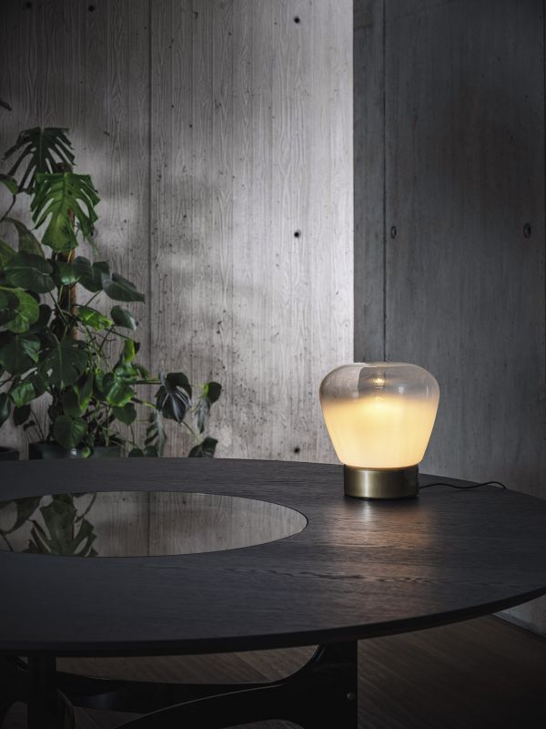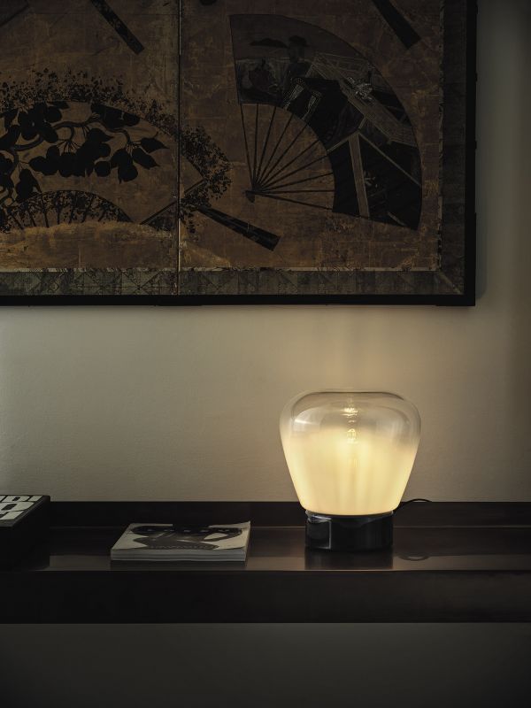 Table lamp floating glass white nuanced. Lacquered metal base.