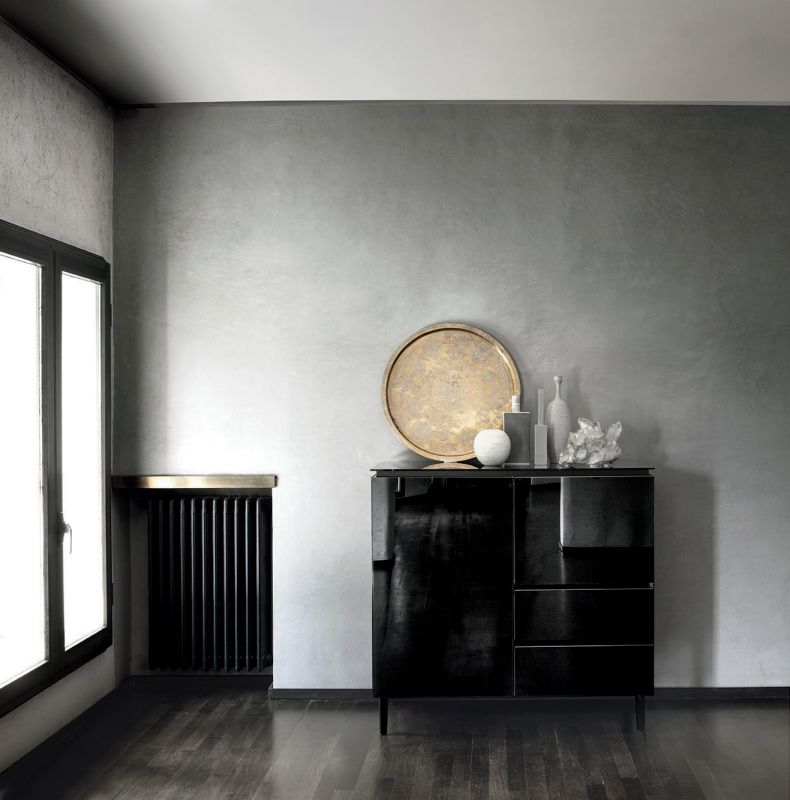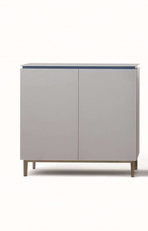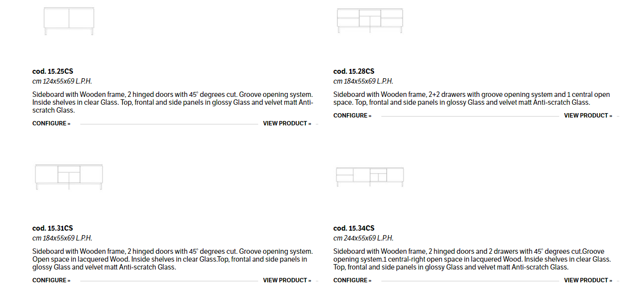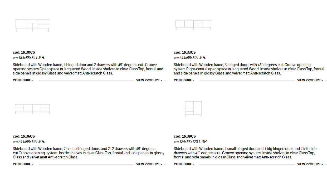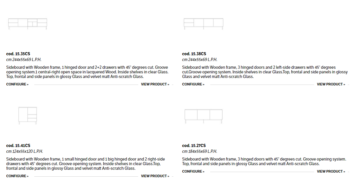 Wooden storage unit available with doors, drawers, baskets or open spaces. Groove opening system. Inside shelves in clear Glass. Top, frontal and side panels in glossy Glass and velvet matt Anti-scratch Glass.