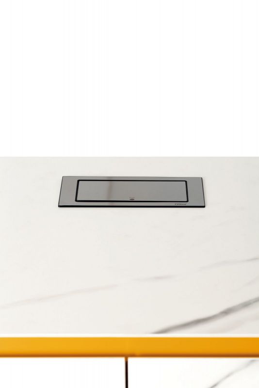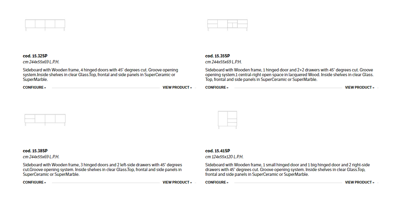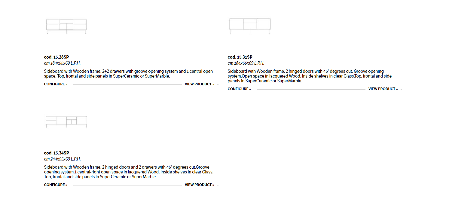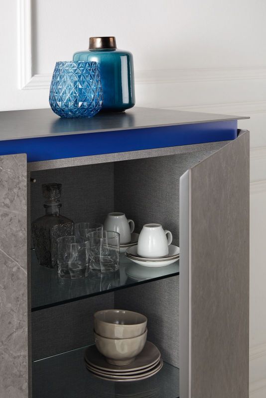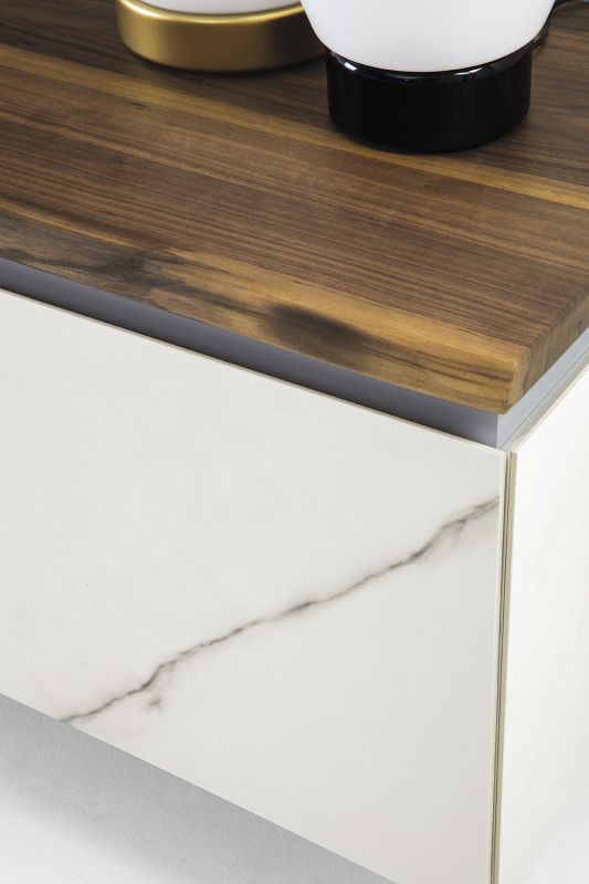 Wooden storage unit available with doors, drawers, baskets or open spaces. Groove opening system. Inside shelves in clear Glass. Top, frontal and side panels in SuperCeramic or SuperMarble.