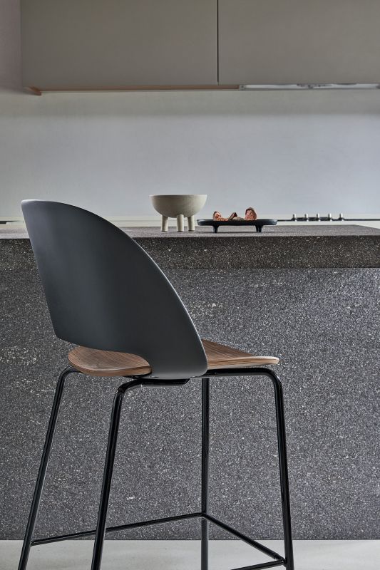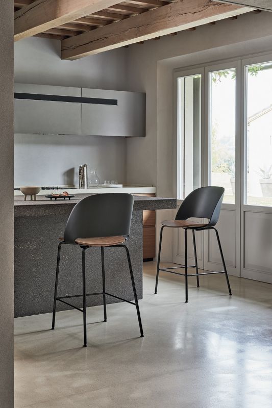 Low barstool with metal frame. Back in polypropylene and seat in solid wood or upholstered and covered seat in Eco Leather, Technical velvet, Mambo and Lulù fabric, Waterproof Nabuk, Waterproof printed Nabuk, Pure Virgin Wool, Velvet, Decò fabric, Kvadrat Field fabric, Coda Fabric and Premium Leather.