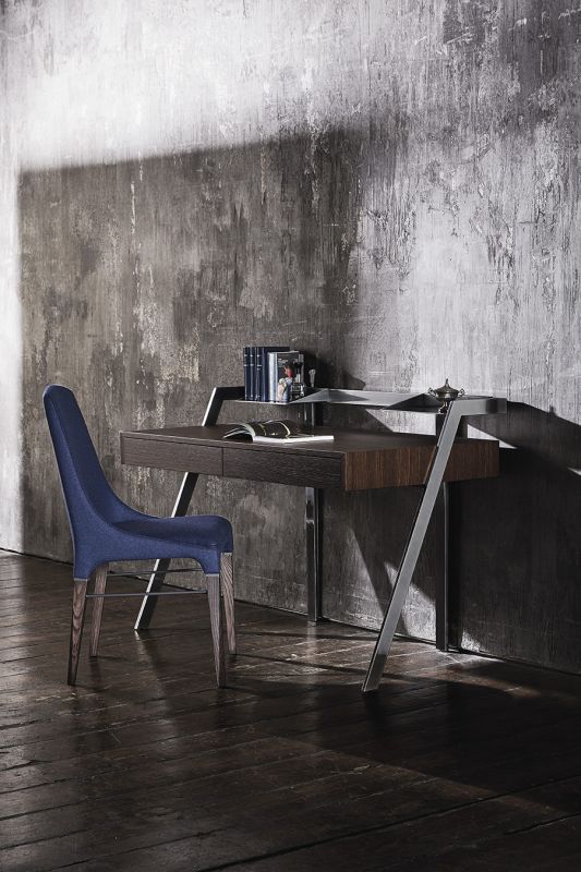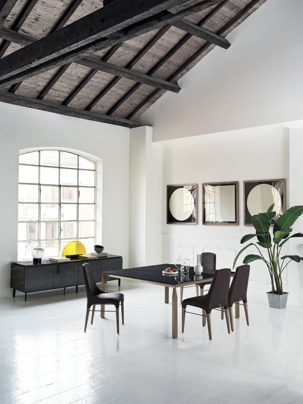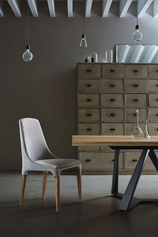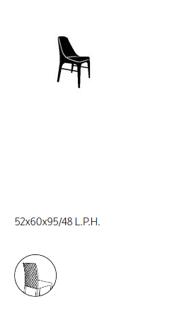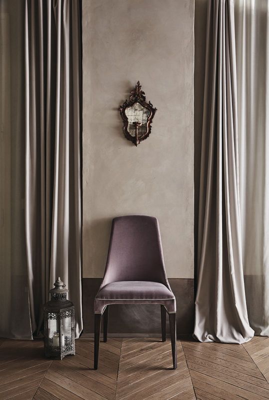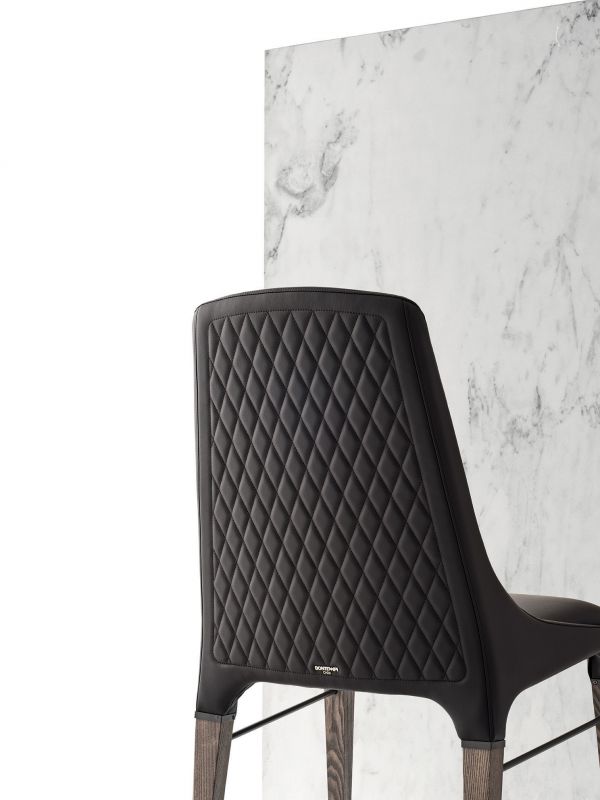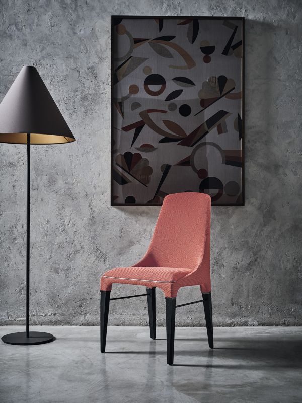 Chair with solid Wood frame and frame details in Metal, upholstered and covered in Eco Leather, Technical velvet, Mambo and Lulù fabric, Waterproof Nabuk, Waterproof printed Nabuk, Pure Virgin Wool, Velvet, Decò Fabric, Fvadrat fabric and Premium Nappa Leather. Piping can be in matching colour or contrast colour. Also available in the version with quilted backrest (only for Waterproof Nabuk, Eco leather and Premium nappa leather).