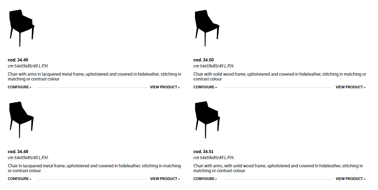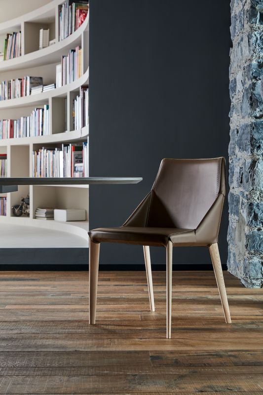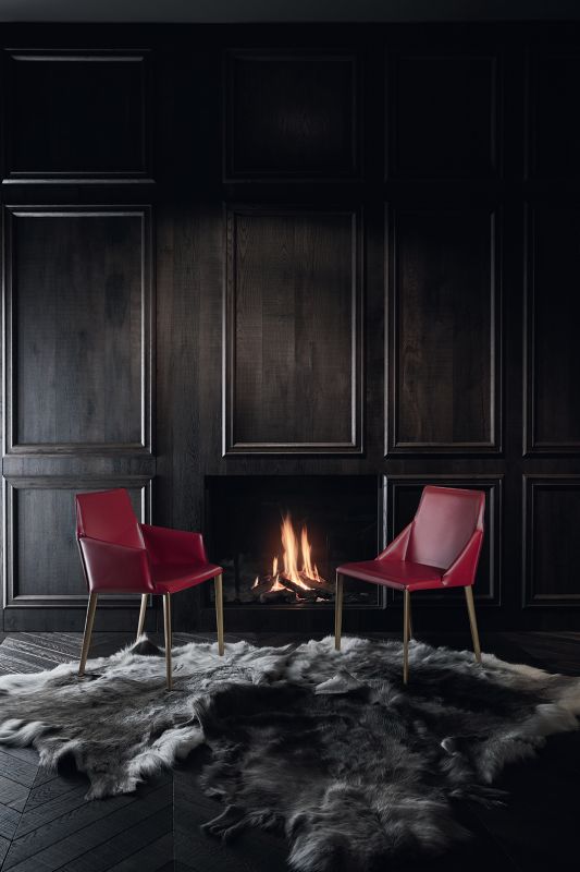 Chair and chair with arms, with metal or solid wood frame, upholstered and covered in hideleather