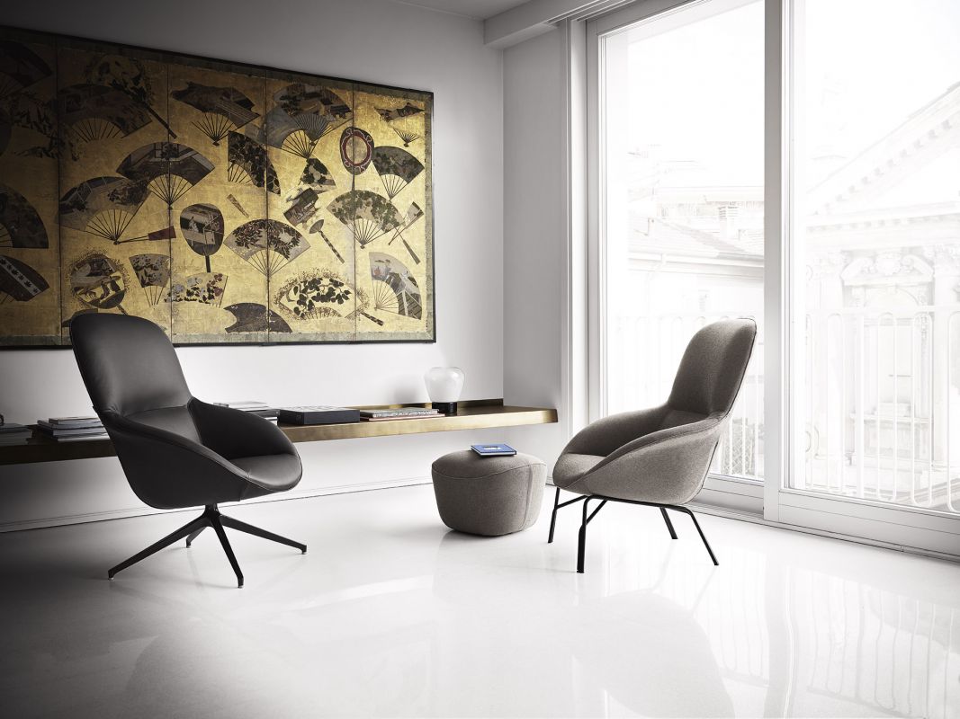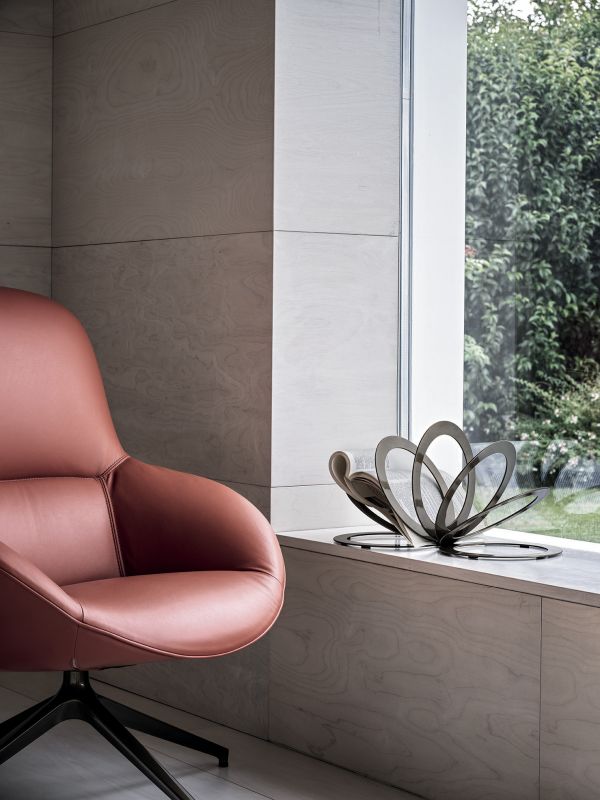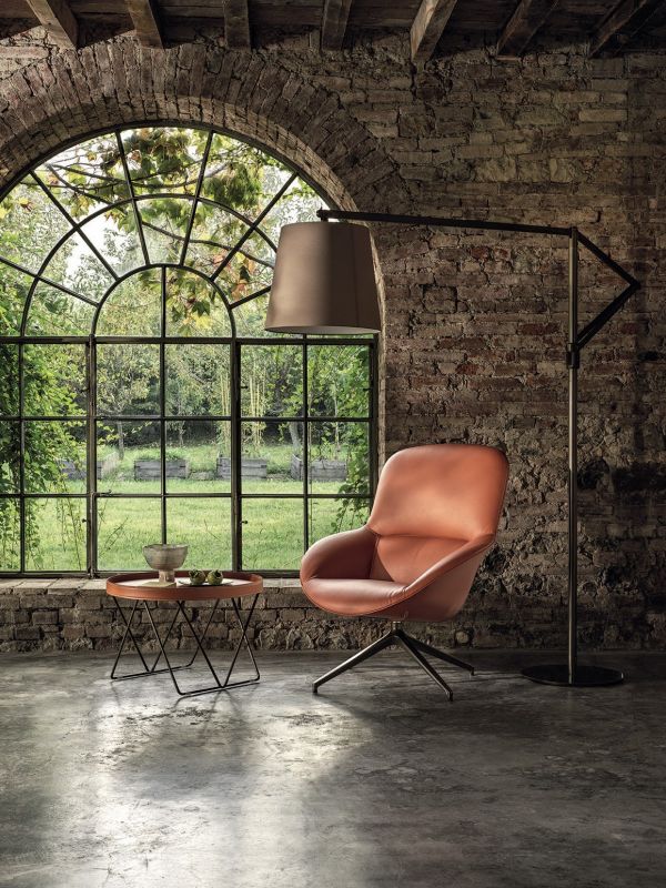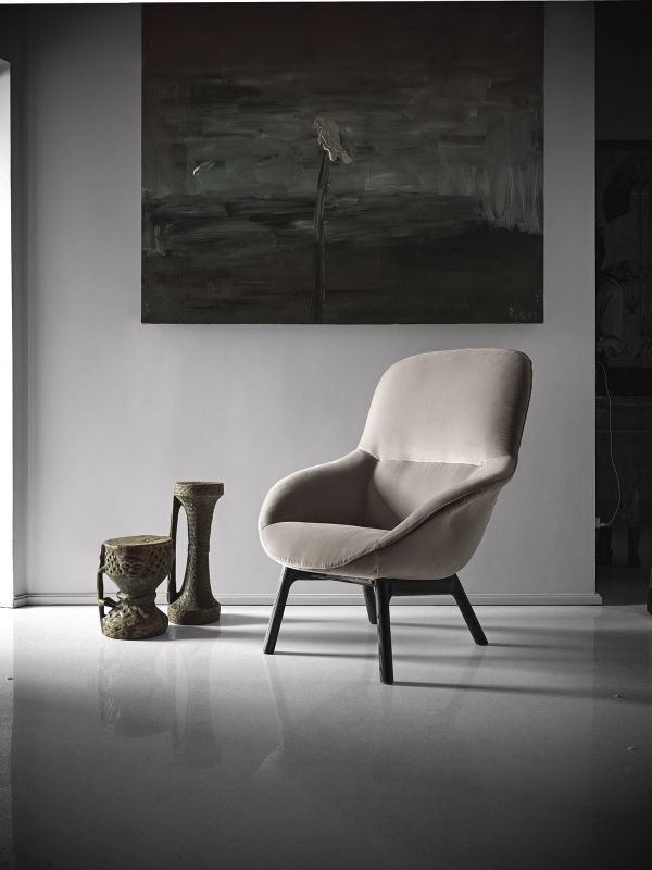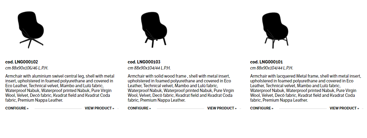 Armchair with three different frames, shell with metal insert, upholstered in foamed polyurethane and covered in Eco Leather, Technical velvet,Mambo and Lulù fabric, Waterproof Nabuk, Waterproof printed Nabuk, Pure Virgin Wool, Velvet, Decò fabric, Kvadrat field and Kvadrat Coda fabric, Premium Nappa Leather.
