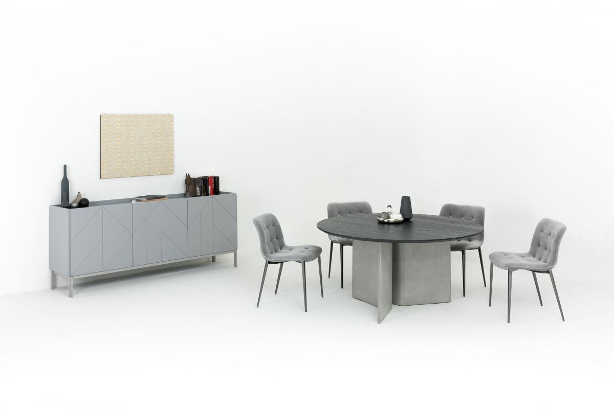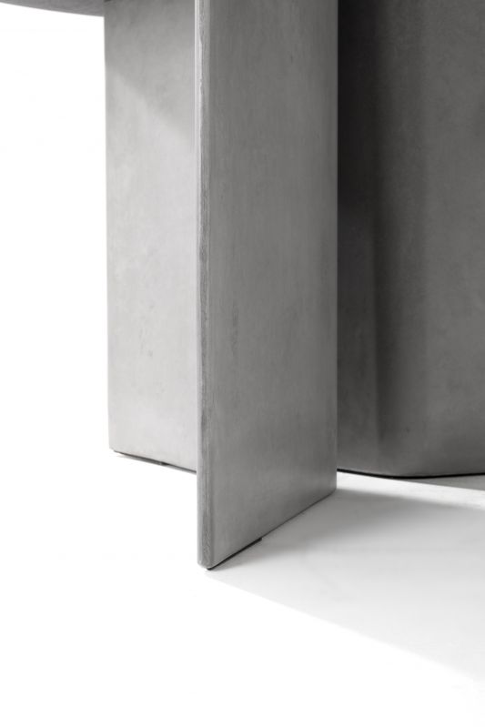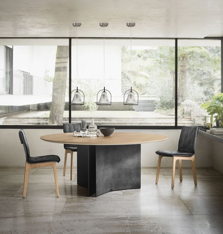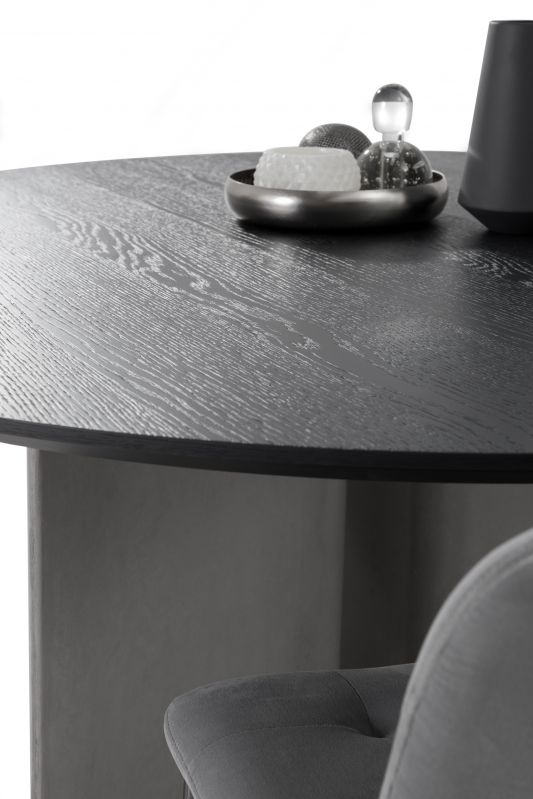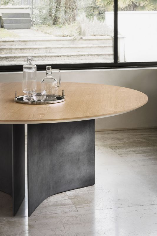 Fixed round table, concrete base and top in veneer wood, glossy glass, matt anti-scratch glass or SuperMarble.