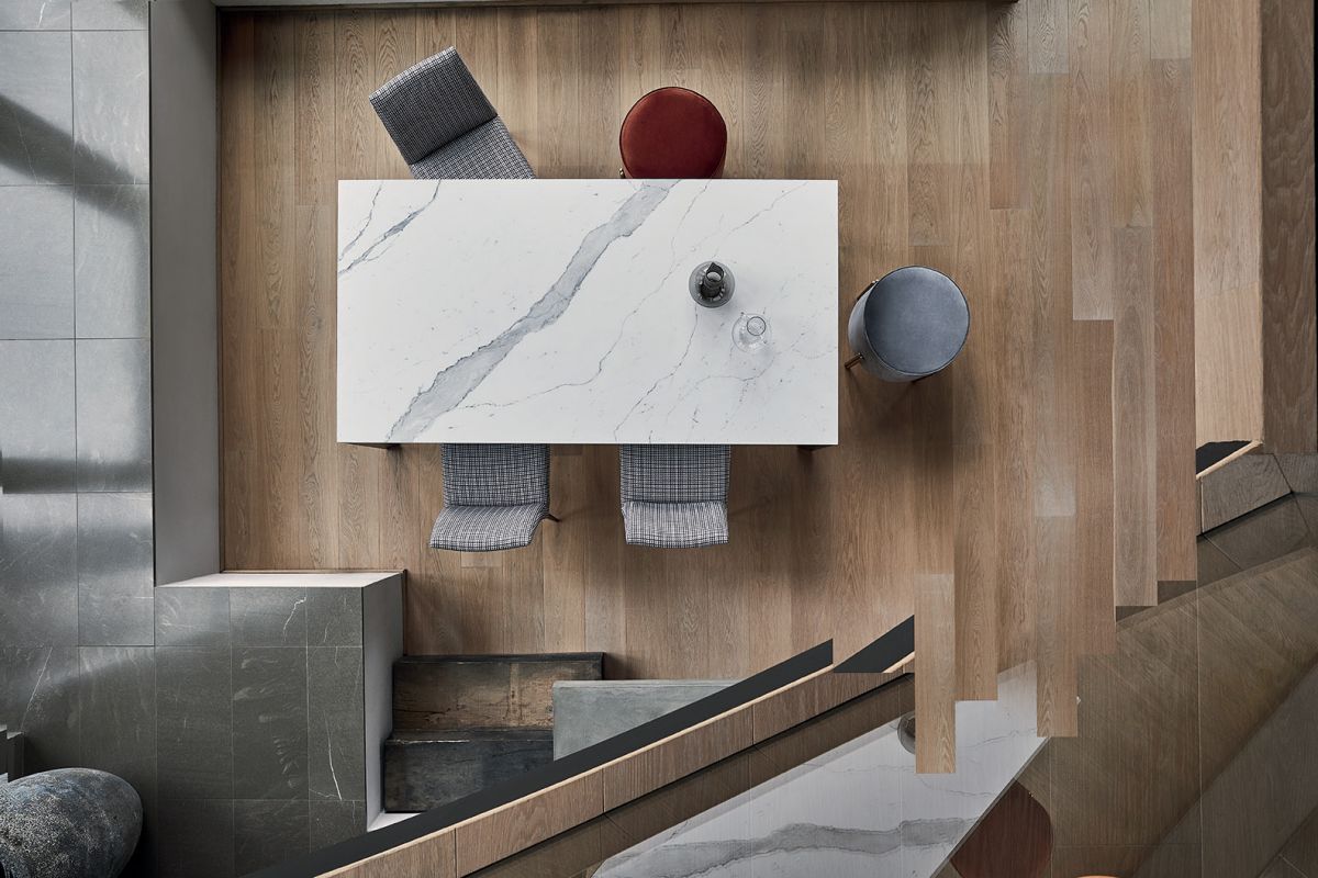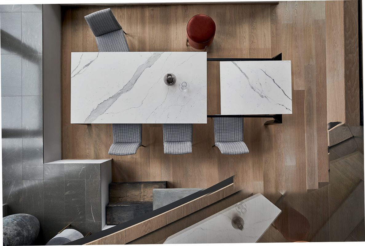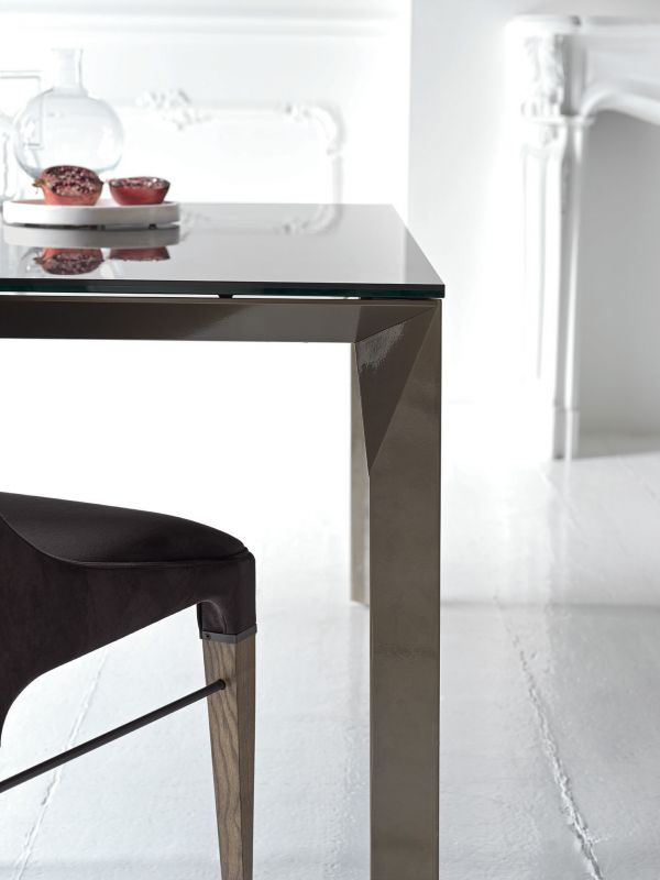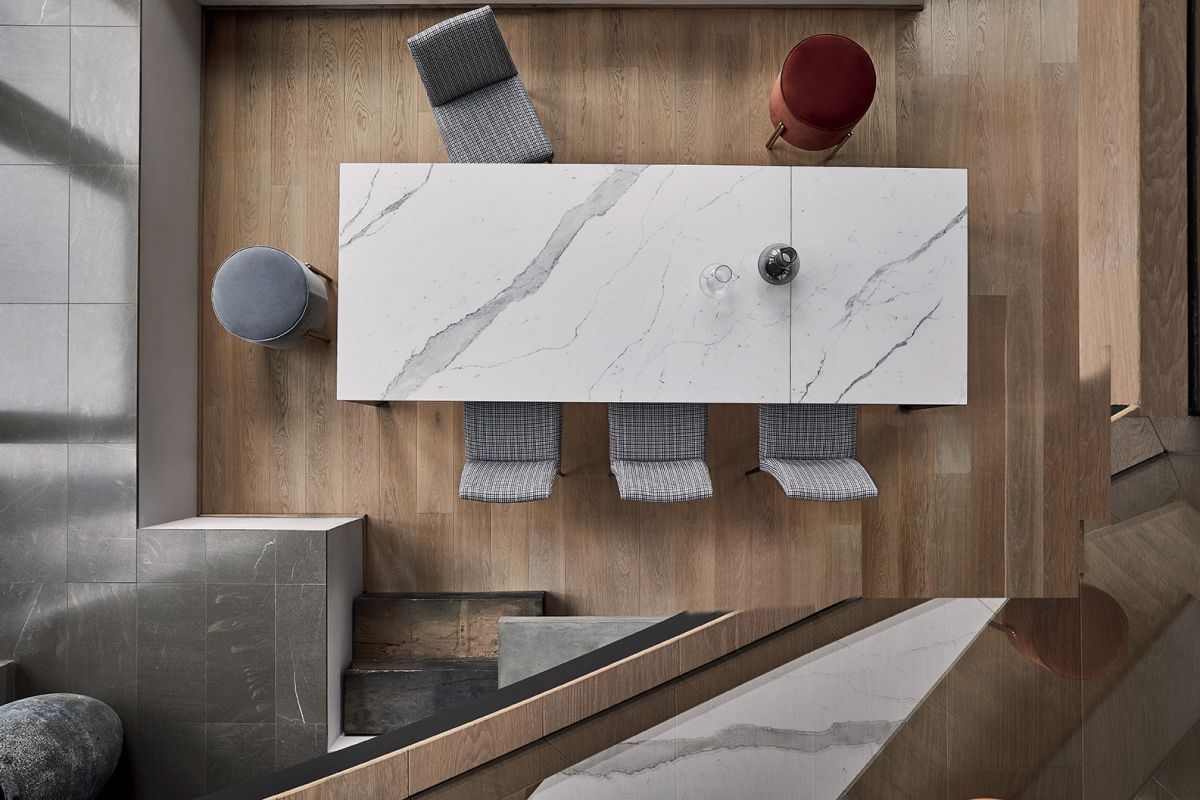 Fixed and extendable table with lacquered aluminium frame. Top in veneer wood, glass, SuperCeramic and SuperMarble.