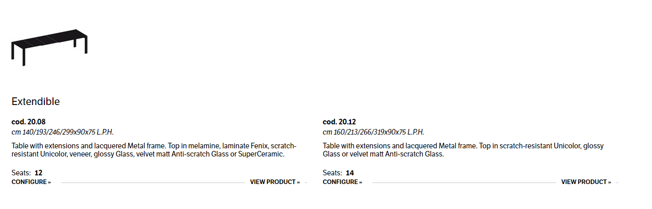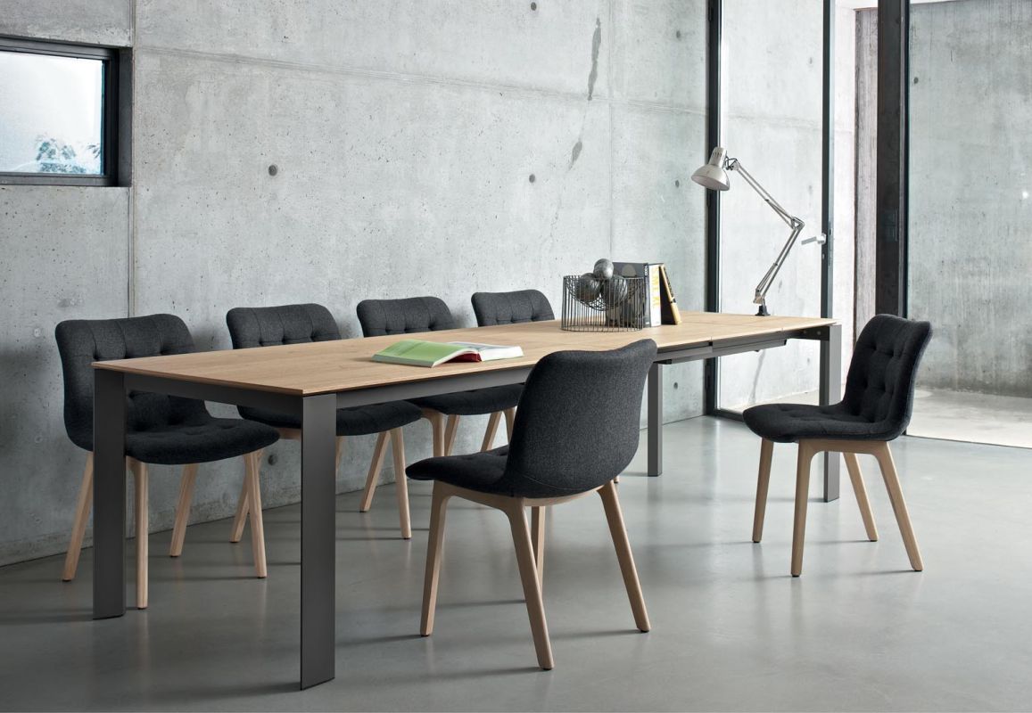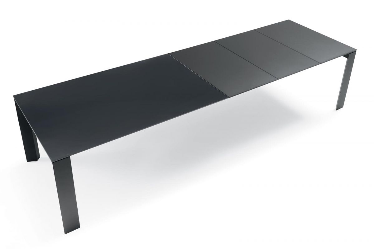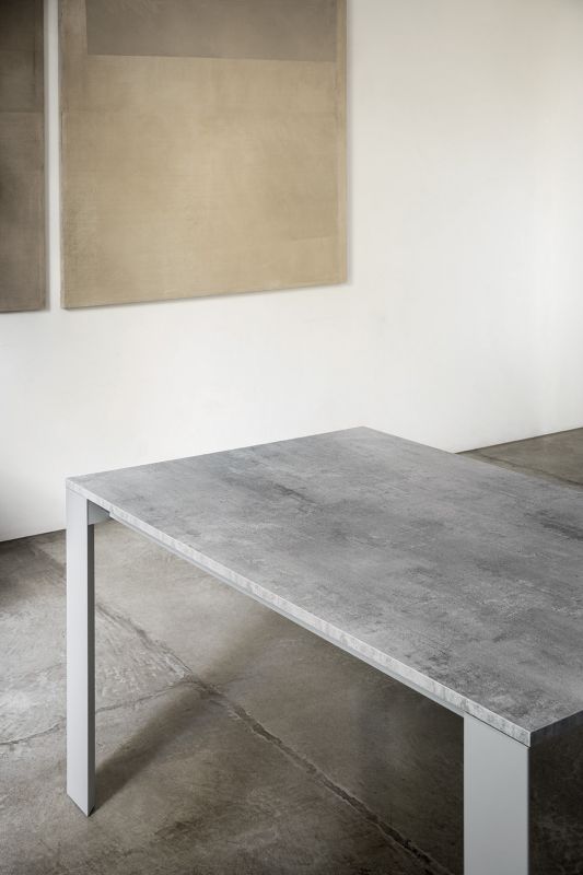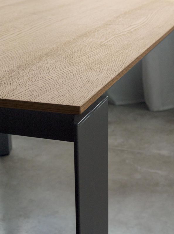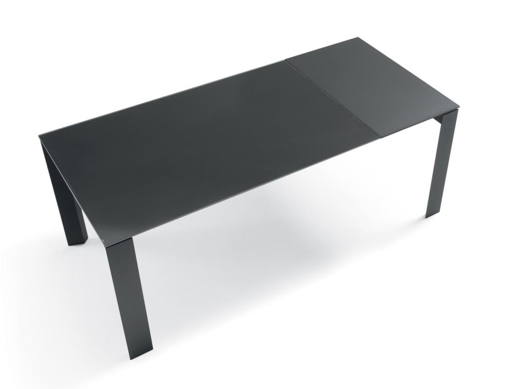 Table with extensions and lacquered Metal frame. Top in melamine, laminate Fenix, scratch-resistant Unicolor, veneer, glossy Glass, velvet matt Anti-scratch Glass or SuperCeramic.