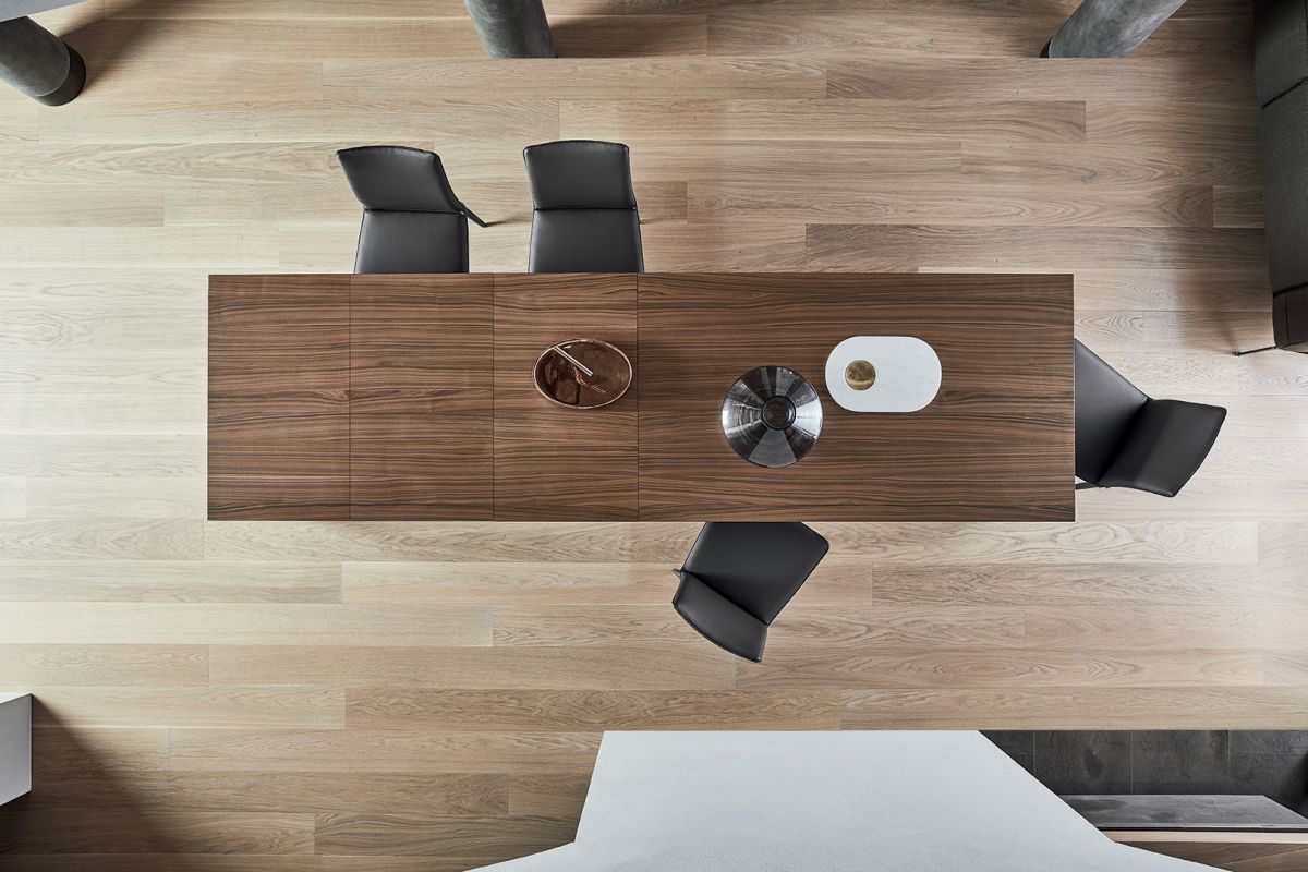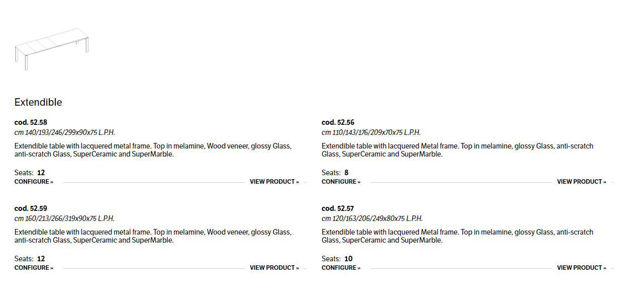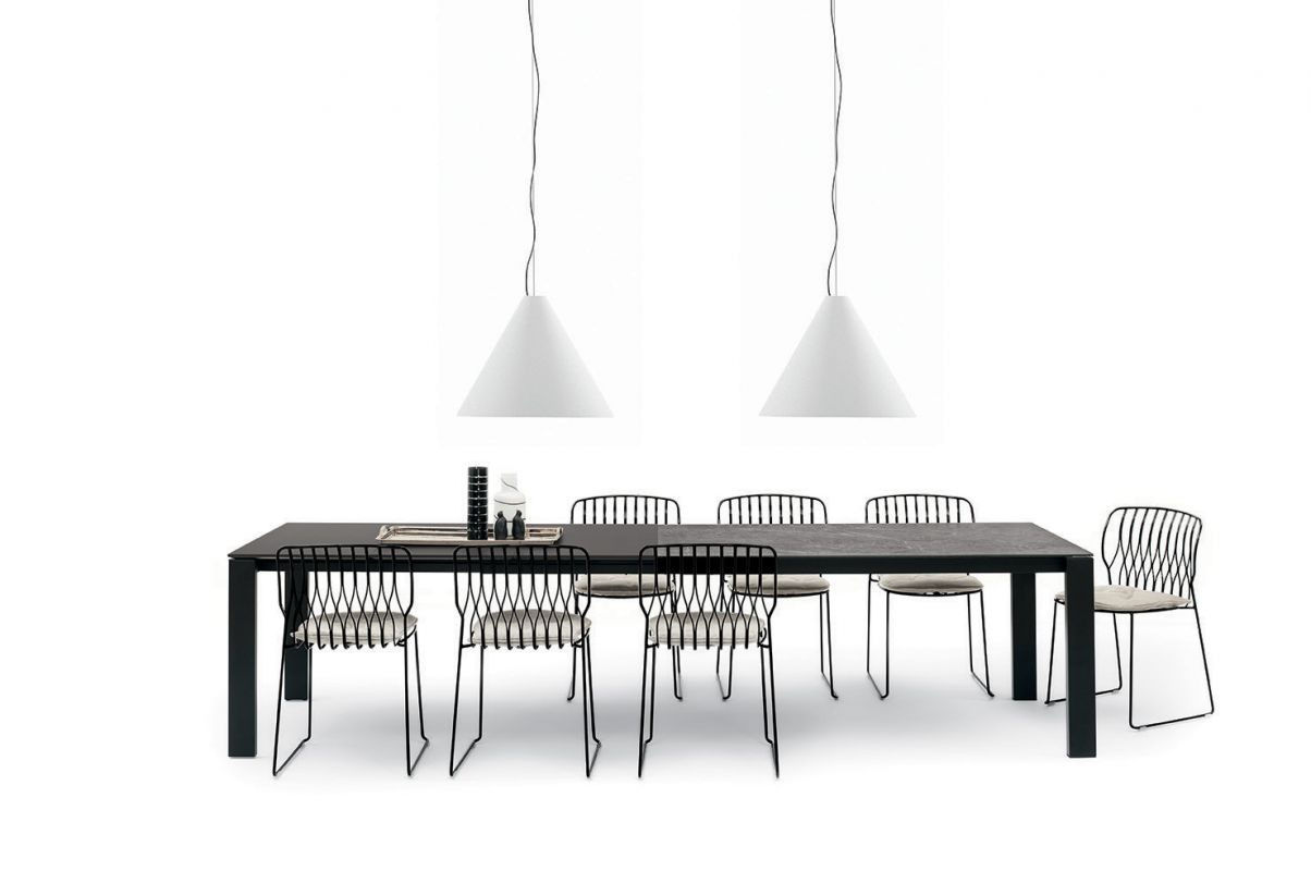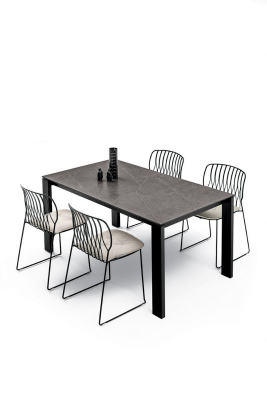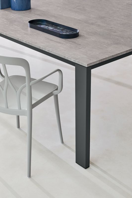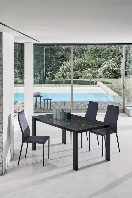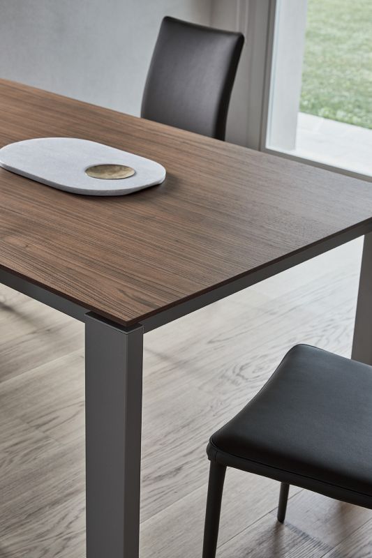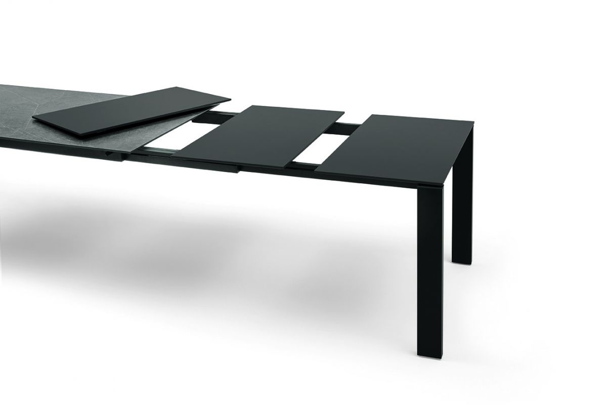 Extendible table with lacquered metal frame. Top in melamine, Wood veneer, glossy Glass, anti-scratch Glass, SuperCeramic and SuperMarble.