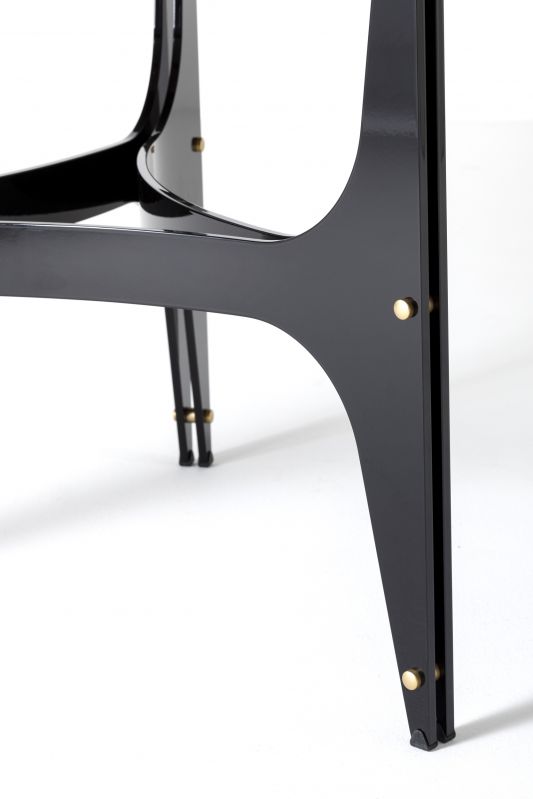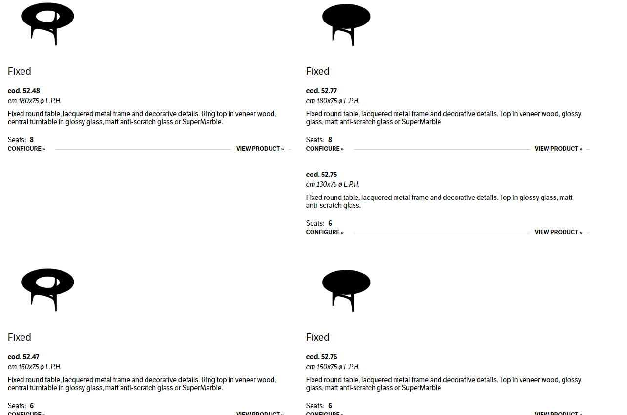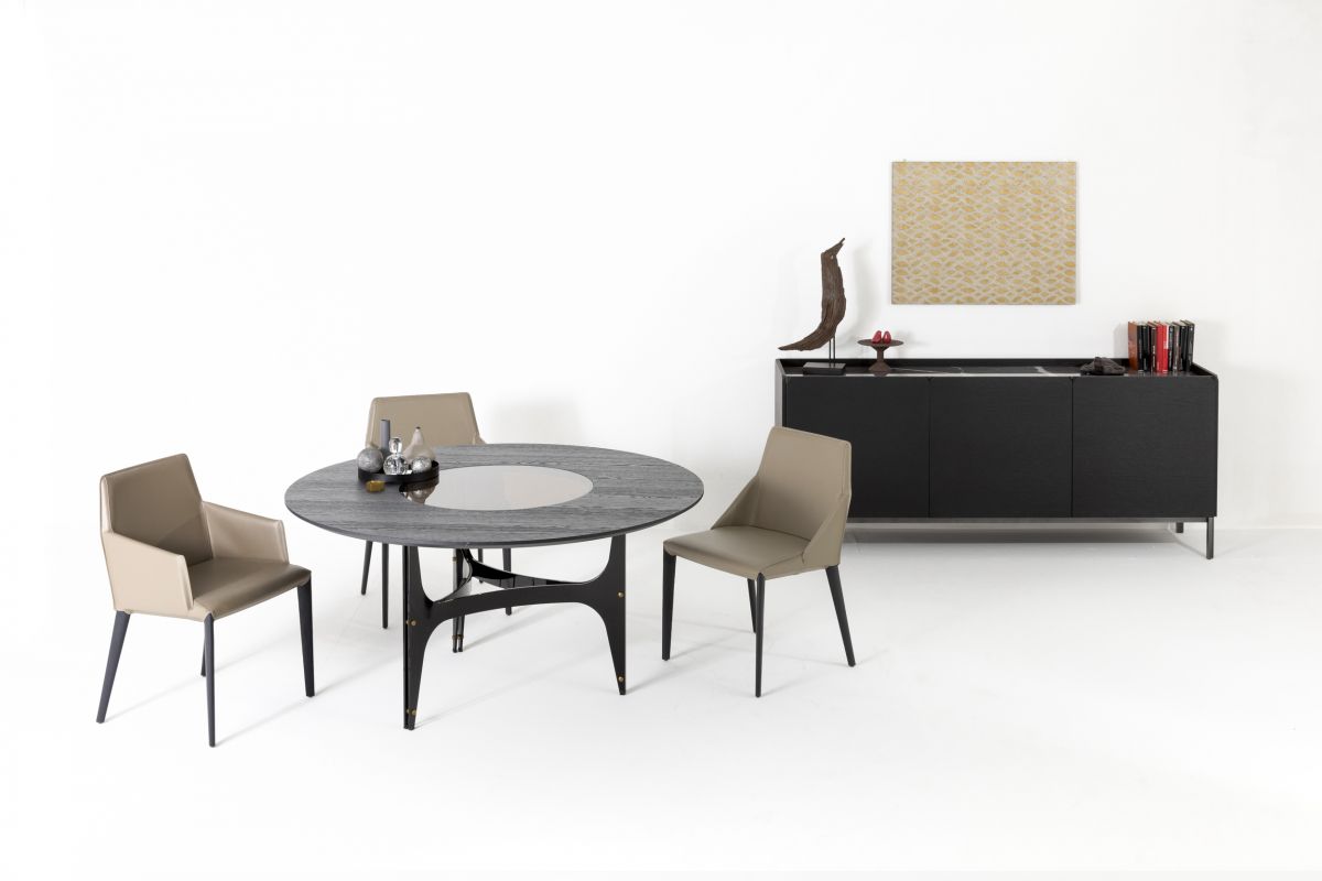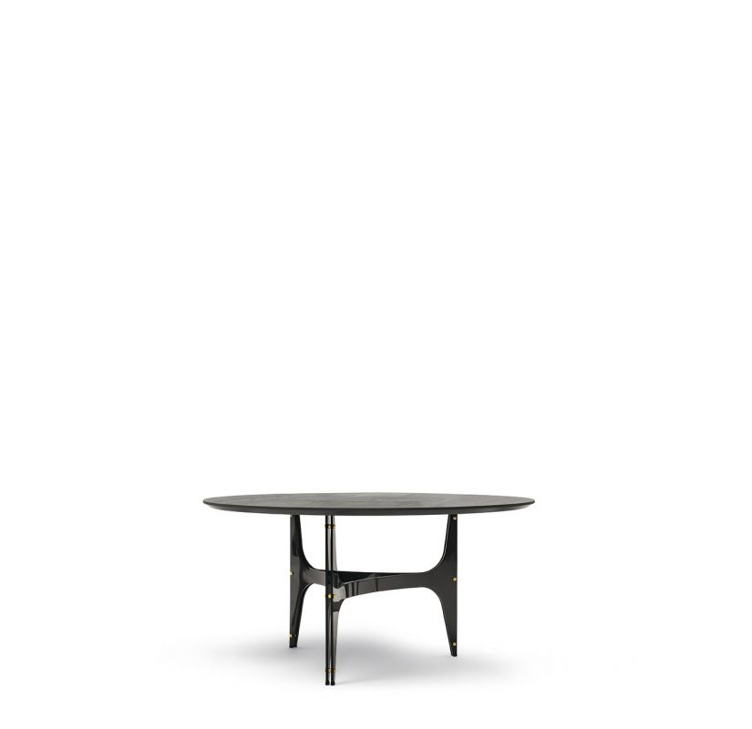 Fixed round table, lacquered metal frame and decorative details. Standard top in veneer wood, glossy glass, matt anti-scratch glass or ring top with central turntable in glossy glass, matt anti-scratch glass or SuperMarble.