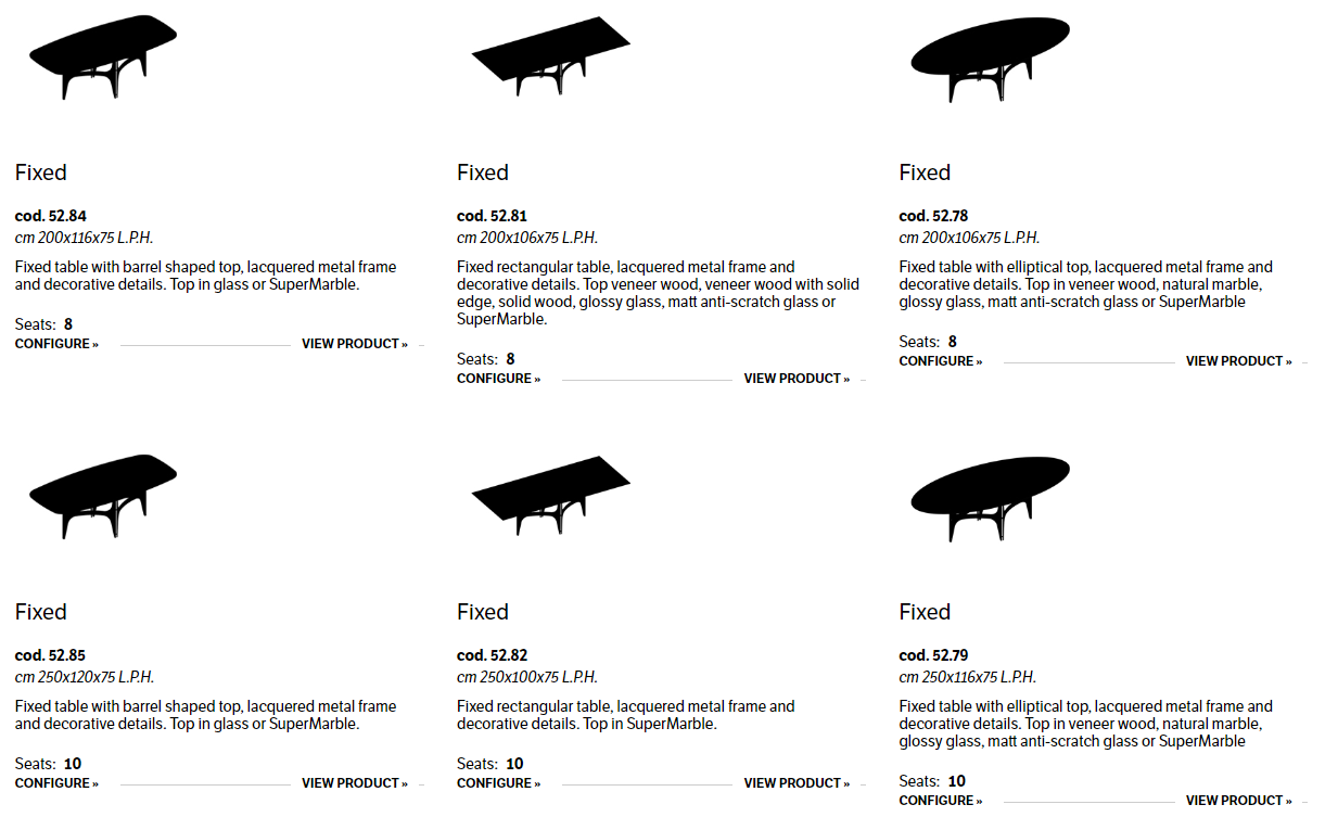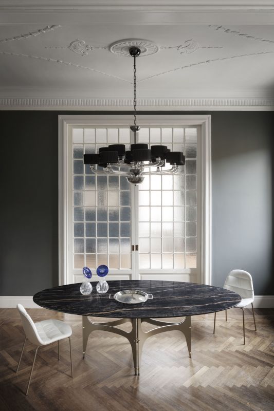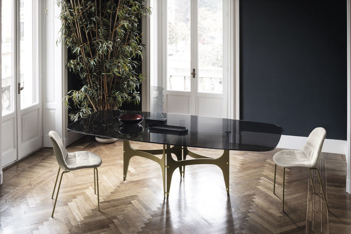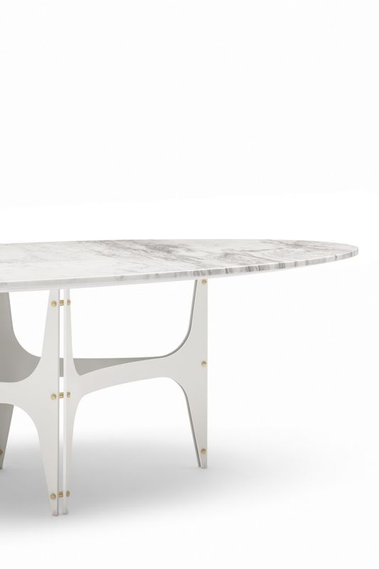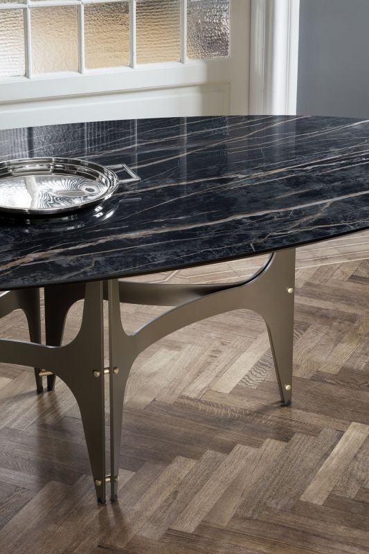 Fixed table, lacquered metal frame and decorative details. Top veneer wood, veneer wood with solid edge, solid wood, glossy glass, matt anti-scratch glass or SuperMarble.