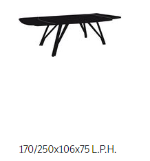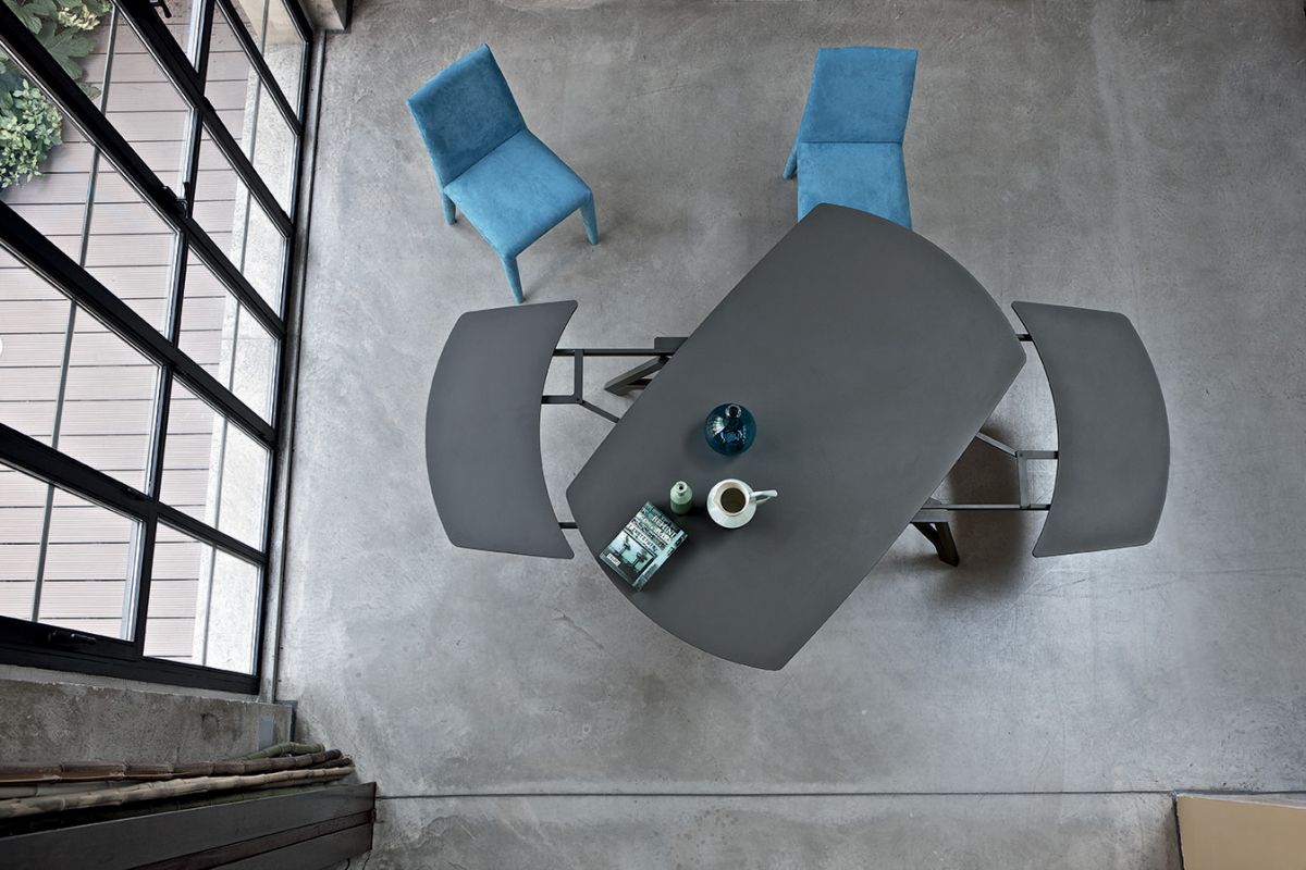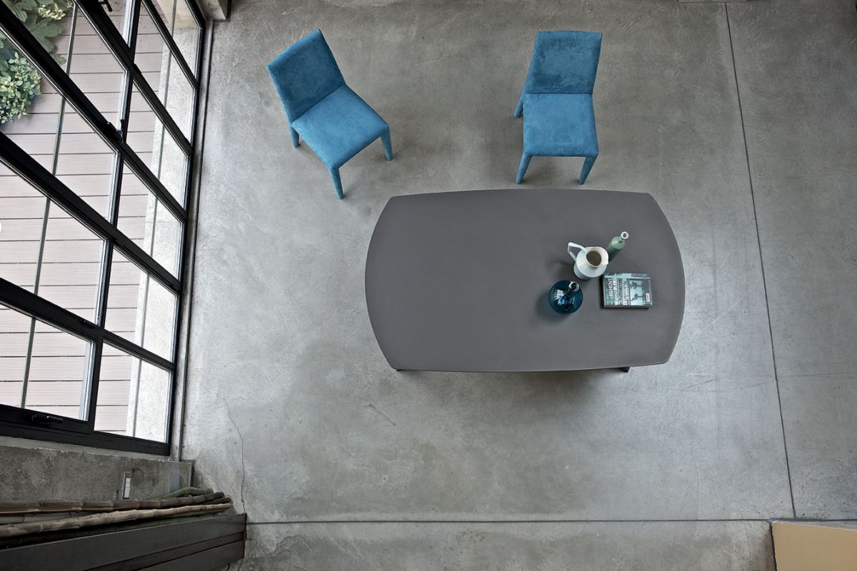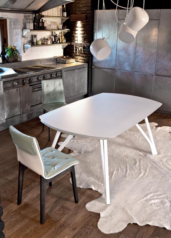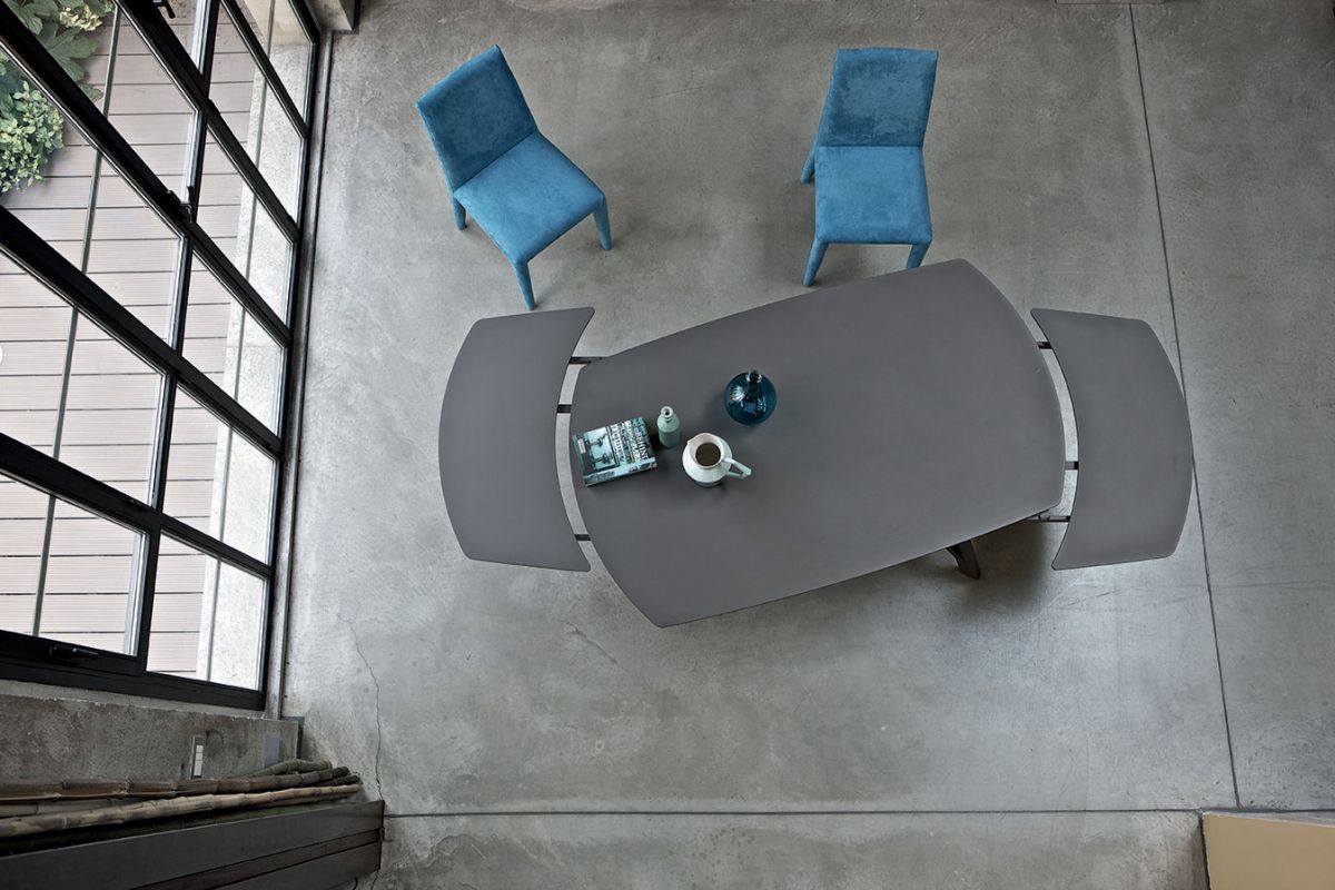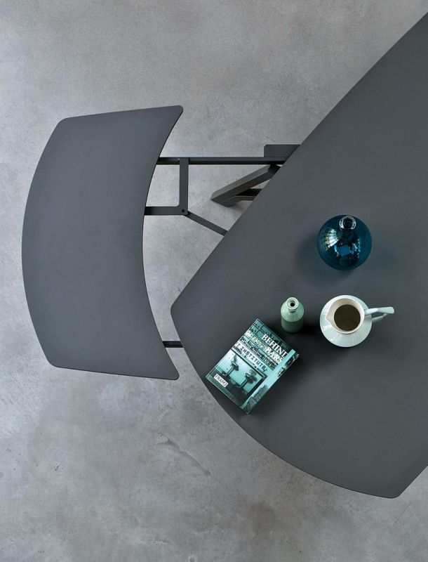 Elliptical table with lacquered metal frame and extensions with telescopic synchronised opening mechanism. Top in lacquered wood, glossy glass or velvet matt anti-scratch glass.