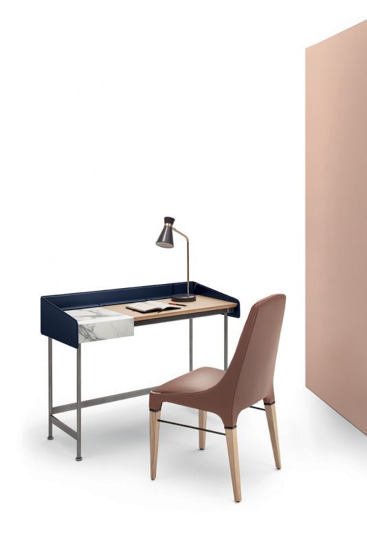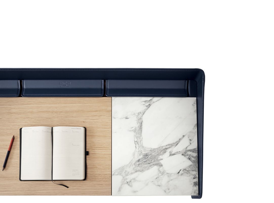 Desk with frame and outer edge in lacquered metal frame or outer edge in hideleather, with 3 small storages in hideleather matching with outer edge, wooden top, flap for Secret compartment in lacquered wood or Supermarble