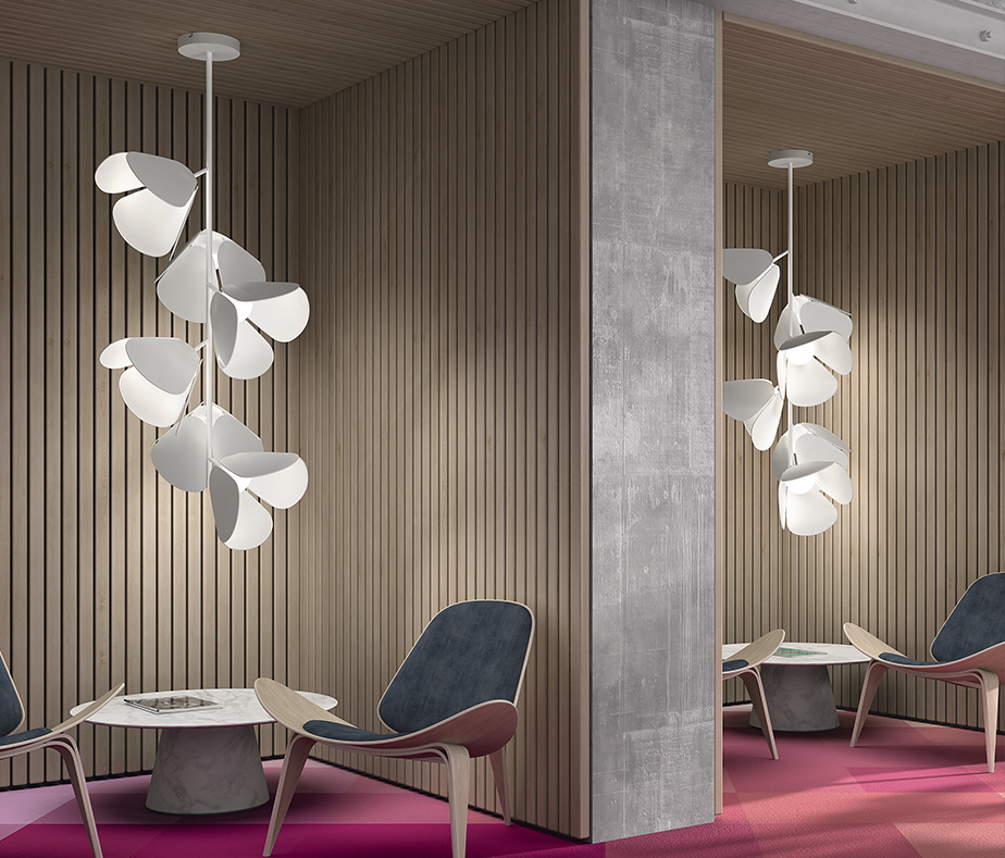The Mod seeks its inspiration in the flora kingdom, as it can be grouped to form a garden of possibilities through the finishes of the clusters of flowers. The petals of its flowers are customizable, being able to adapt to almost all types of materials; Plates smooth, perforated, deployed or drawn and laser cut according to the agenda you want to use. They also accept natural materials, such as wood panels or natural fibers such as raffia and if w