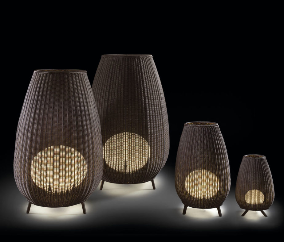 The AMPHORA collection has been designed to create a warm environment especially in outdoors. However, thanks to its highly decorative look, the Amphoras can equally be placed both in outdoor and indoor. The size and shape of this collection pay a subtle and discreet homage to the terracotta amphora formerly used for gardens and terraces decoration. In this collection we have used a synthetic wicker to make up big handmade baskets as shades with a tripod foot subjected to a cataphoresis treatment. The light source is located inside the polyethylene ellipse which grants its water tightness. The light emitted by the Amphora collection is full of nuances and shapes avoiding dazzling.
