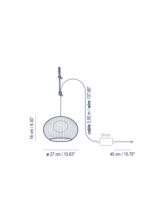 xThe Garota Hang is a lamp designed for terraces and gardens where typically there is not the ability for conventional outdoor lighting. You can hang from a tree or an arbor with the provided accessory allowing the ability to tie the lamp temporarily. The Hang accessory is rubber with and inner wire enabling excellent fastening while maintaining its form despite the inclement weather. It is resistant to UV rays and allows a long sun exposure. Use caution so as not to scratch or mark surfaces when fastening. The Garota Hang has 4 meters of neoprene cable with plug. With this same size there is a hard wired version with ceiling rose and IP -55 neoprene cable. In all cases the outdoor version of Garota incorporates a small elliptical polyethylene diffuser which allows us to maintain the airtight LED plate.