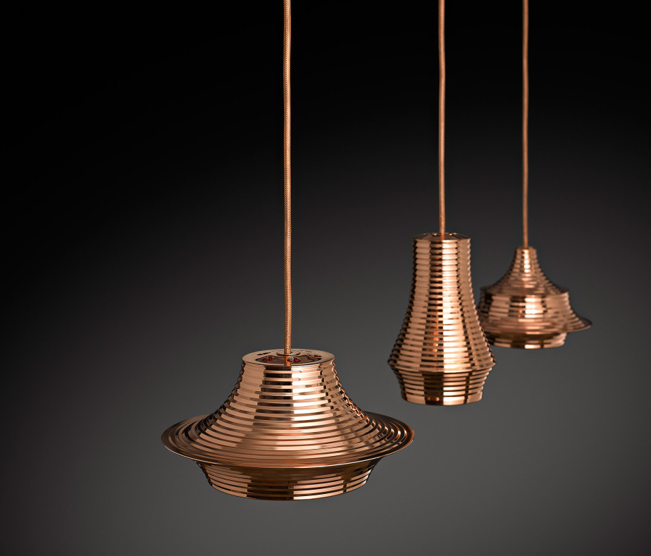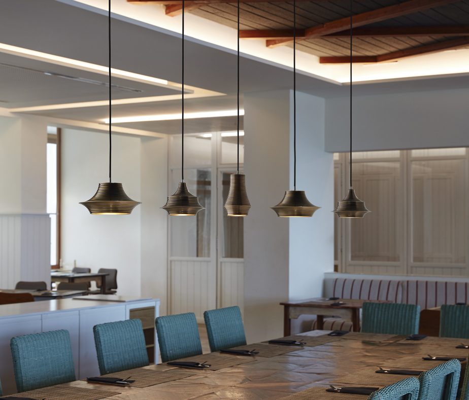 Skybell is an extensive system of light structures, designed to adapt to any type of application. Their main characteristic is the image they give off, they are subtle and cheerful. They breathe a point of fantasy and freedom in their applications because they can be combined in variations, mixing their 4 sizes, until they achieve a more personal and dynamic lamp concept or they can keep all the ‘bells’ in the same length, achieving a more traditional image.