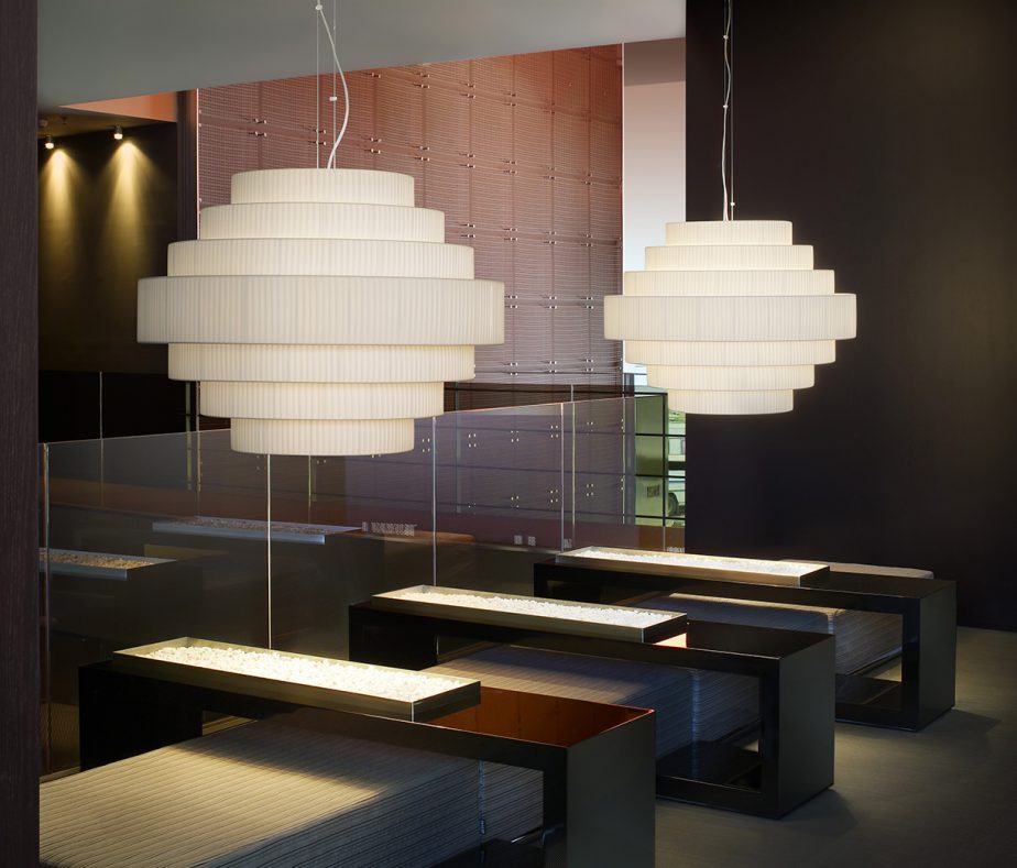 Lamps in big format, warm light, big balls with circular shape that fill the space and become high decorative elements with high light comfort. Due to its large measures, MOS are specifically indicated to contract market and indoor use. Its structure ends with an opal white glass diffuser that blends and directs bottom light. MOS has been manually manufacted with translucent ribbon.