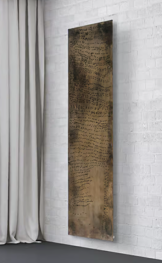 Steven Cavagna has rudely played around with the material, using the Plasma cutting technique to manually drill a steel plate. The result is a series of irregularities in the metal created by these holes and the burn marks, giving it its significant and unmistakable character.