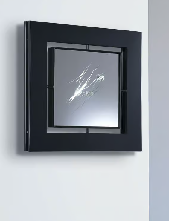 A large crystal mirror is crossed by a flash of red light. The black crystal is framed by the radiator. The artist proposes the radiator in black 9005.