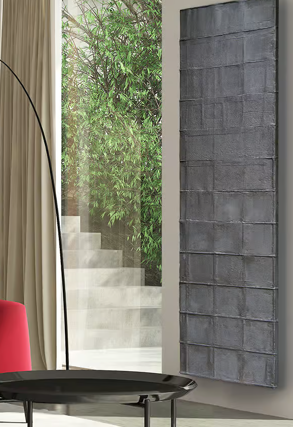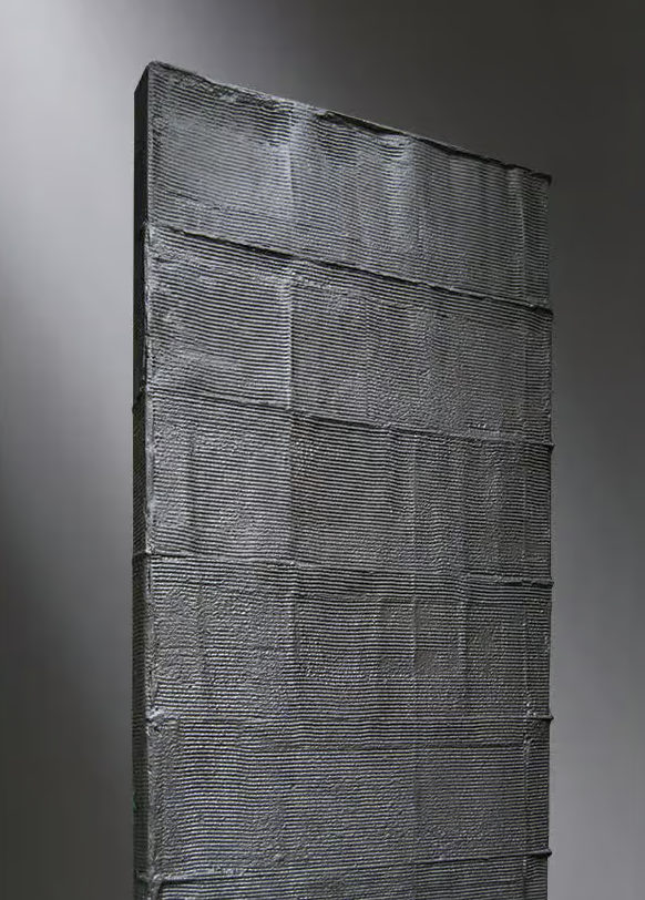 The texture of a square mesh grid shines through under the surface treated with a smoothing of resin-based mixes. Each piece is hand-made, than unique.