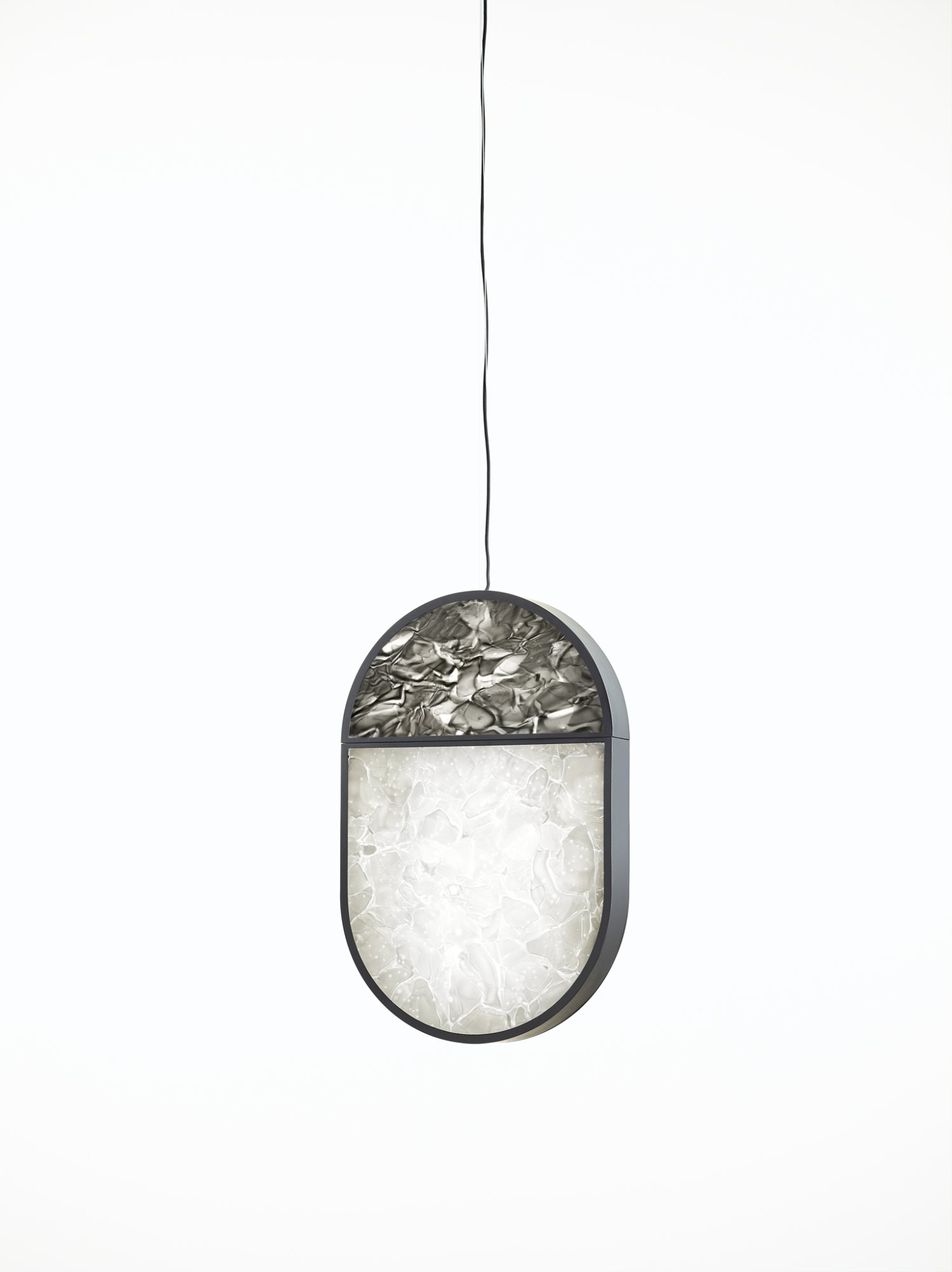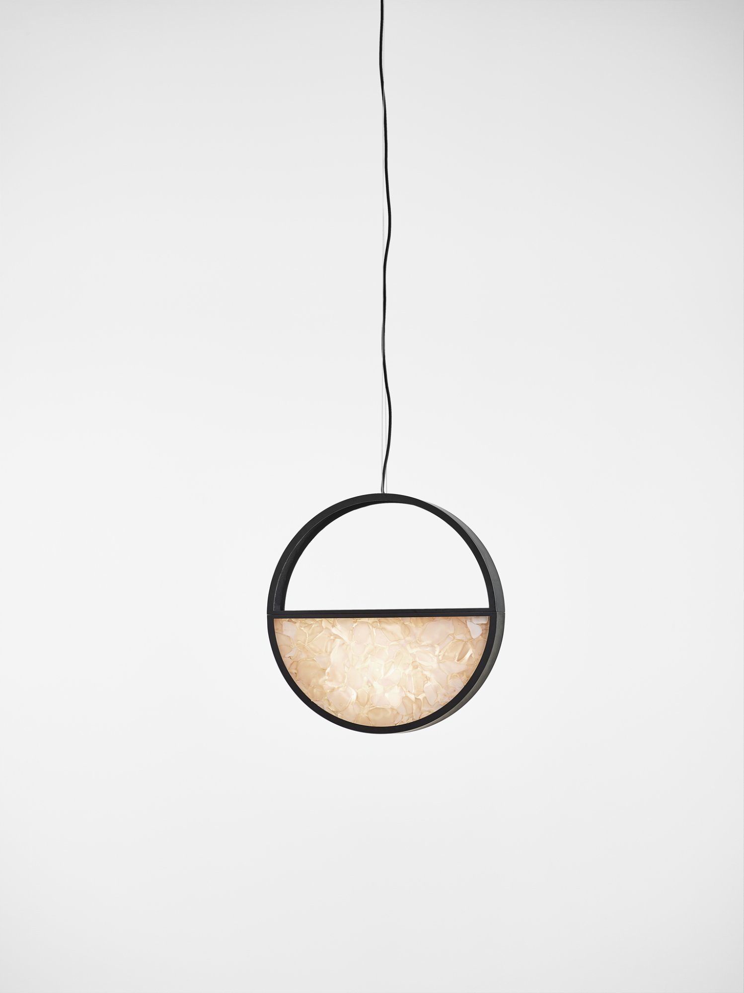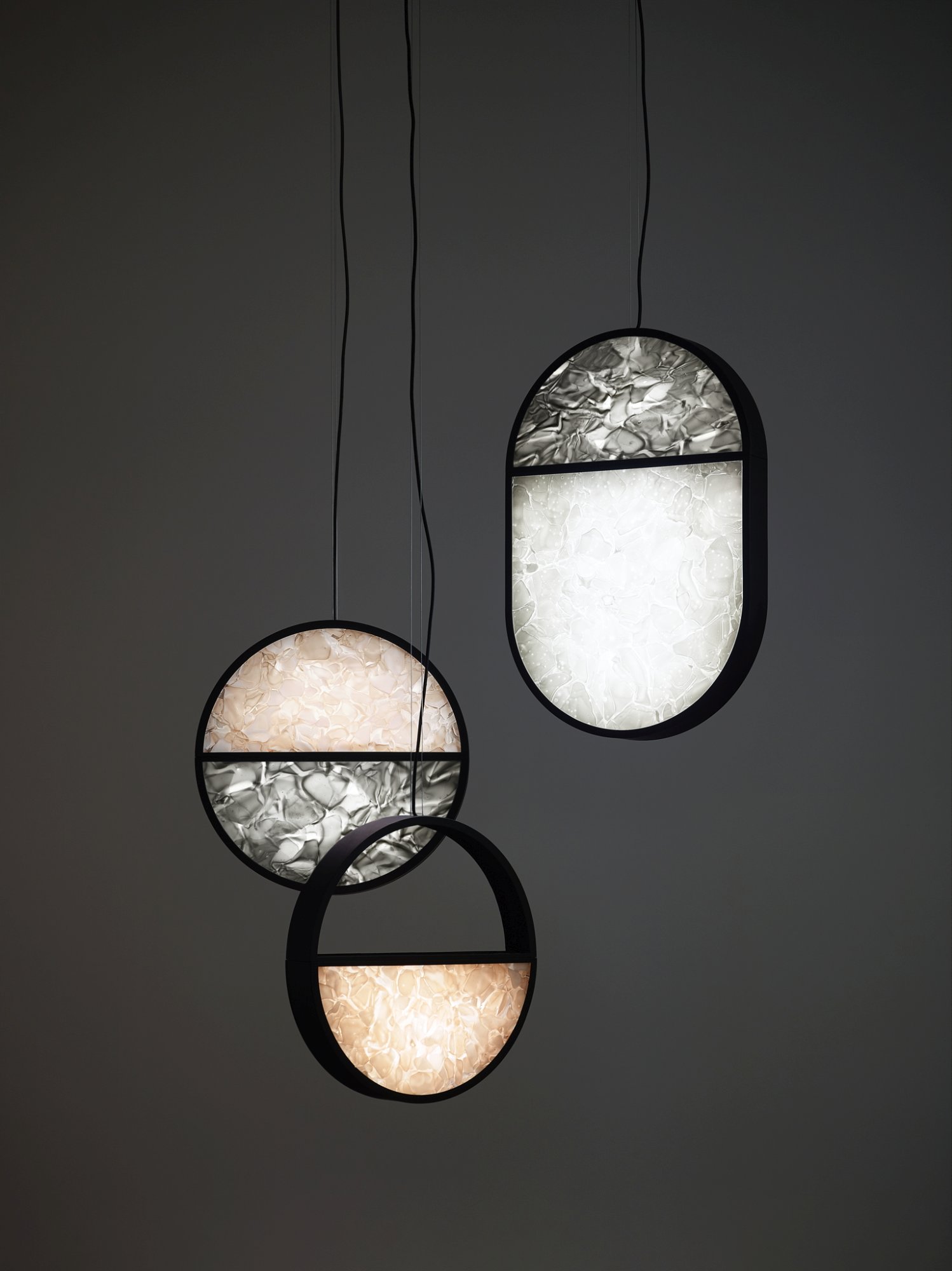 Geometric accentuates the aesthetic expression and structure of BROKISGLASS, which itself is remarkably distinctive. The collection is defined by basic geometric shapes that characterize the overall contours of the lights and instil them with a singular graphic element to achieve a striking contrast with the animate, almost sculptural makeup of the glass. The suspension components make up the glass geometric shapes, their edges rendered in black profiles.
