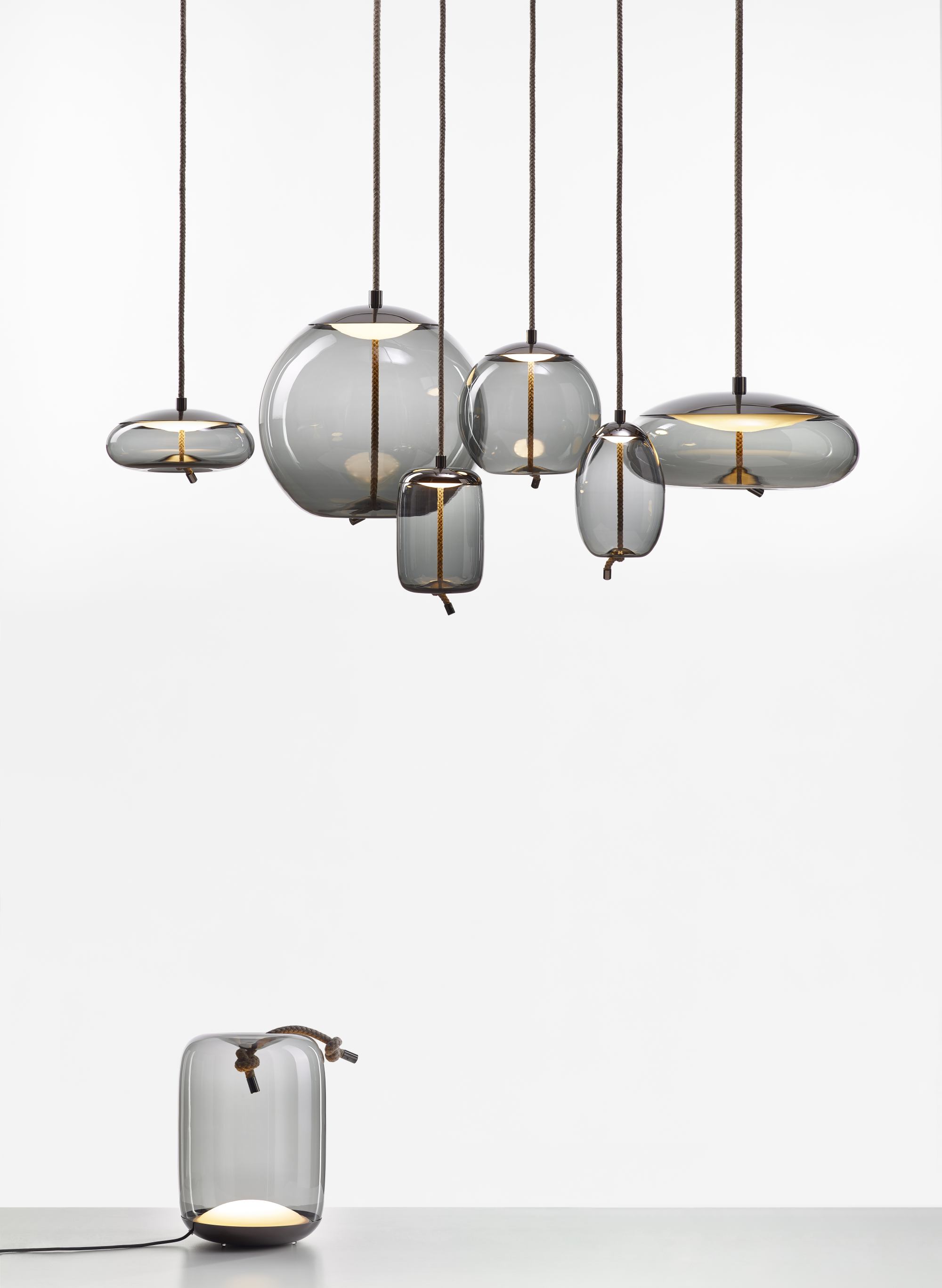 Knot is a collection of stately pendant lights that appose two dramatically dissimilar materials. The design combines coarse natural fibre with smooth, transparent blown glass to arouse a contrast as striking as it is dignified.