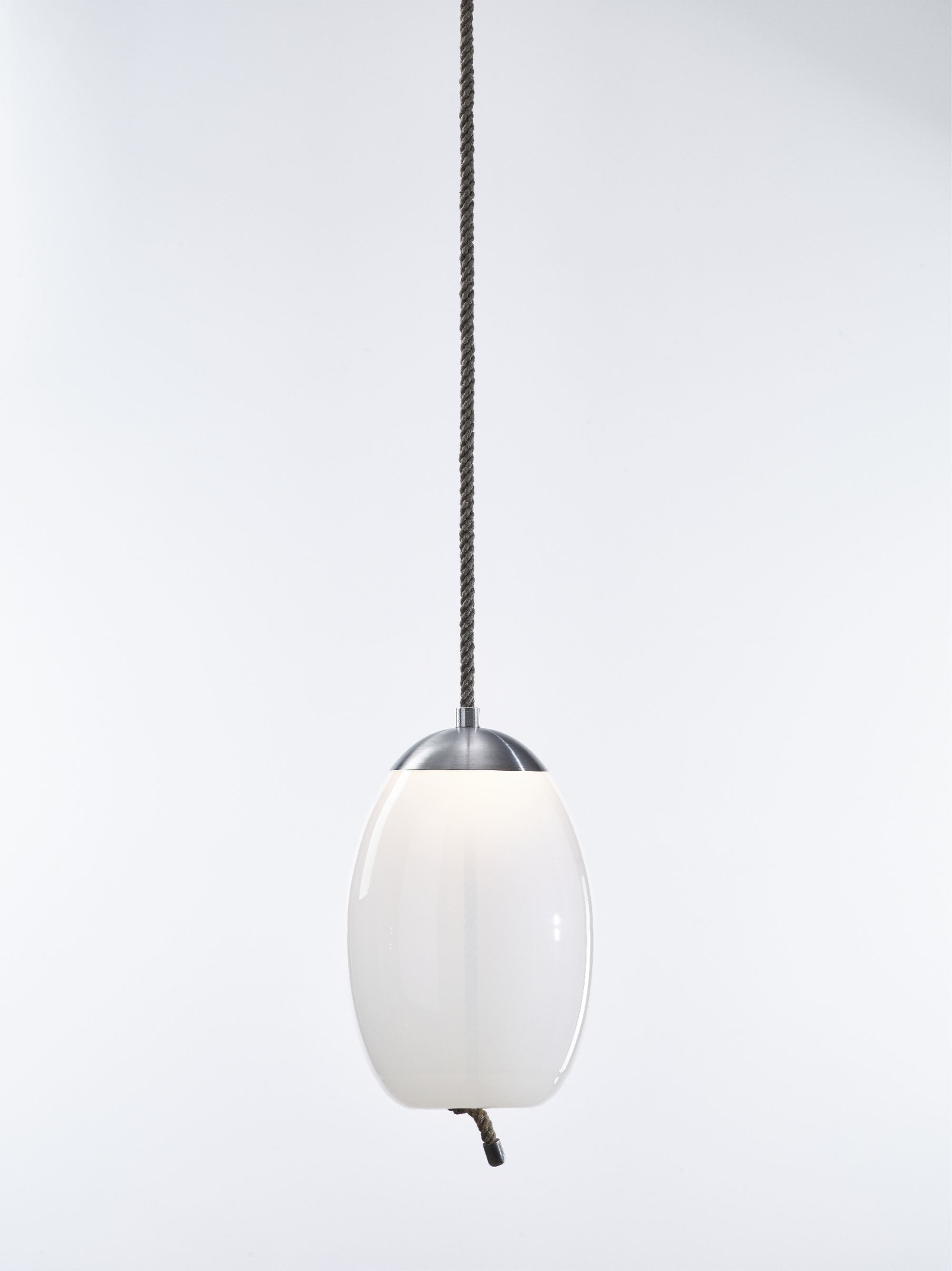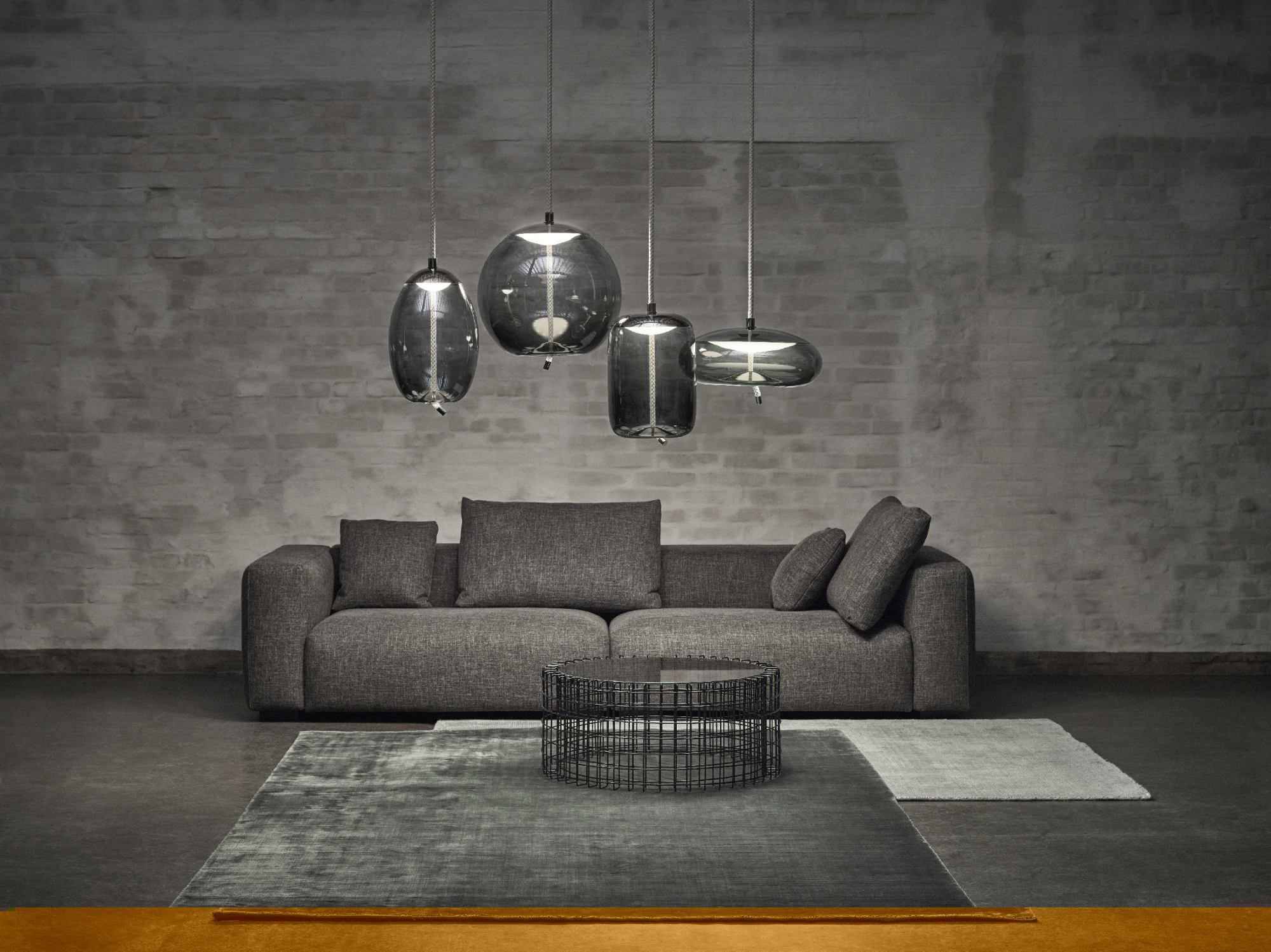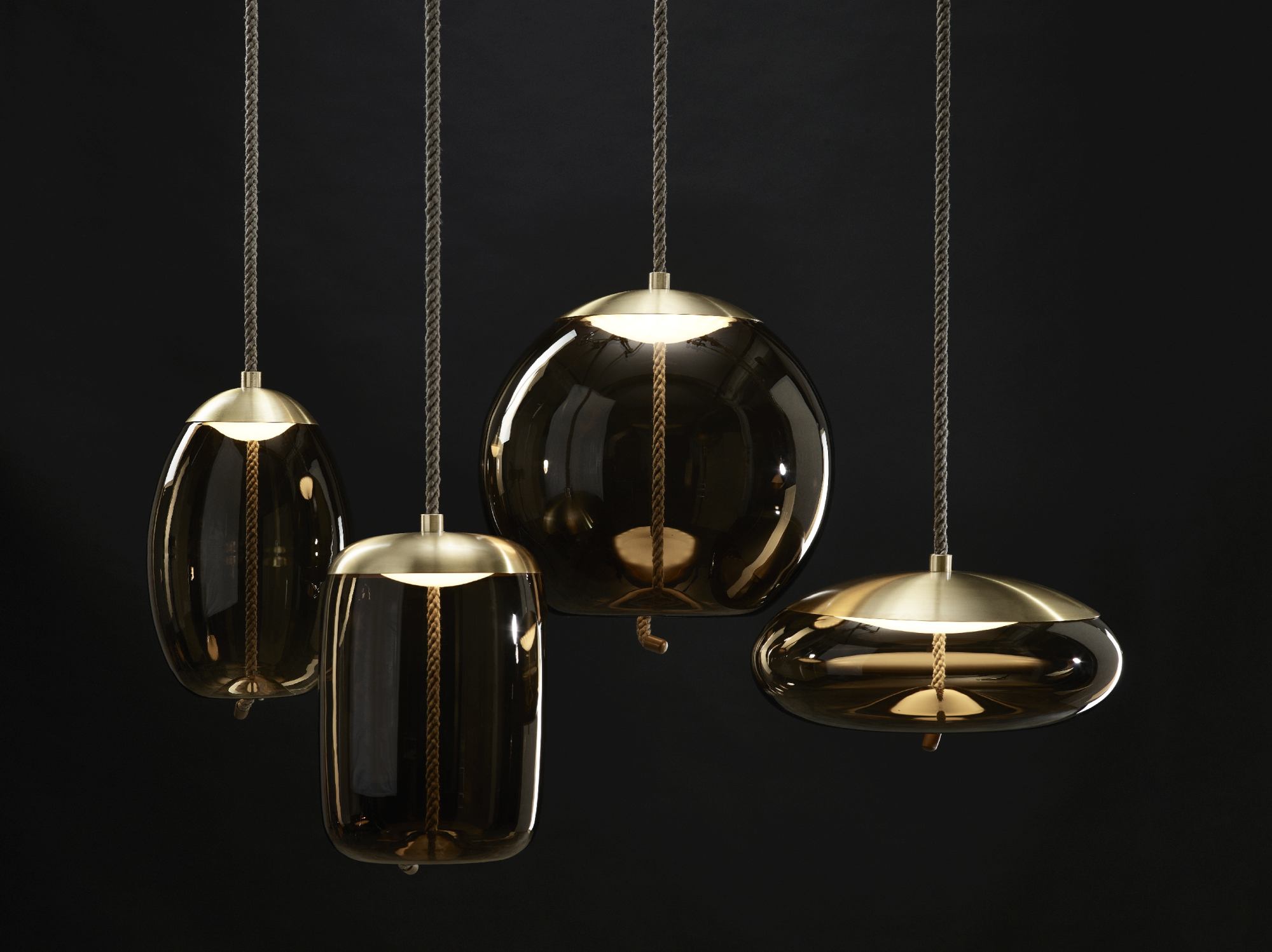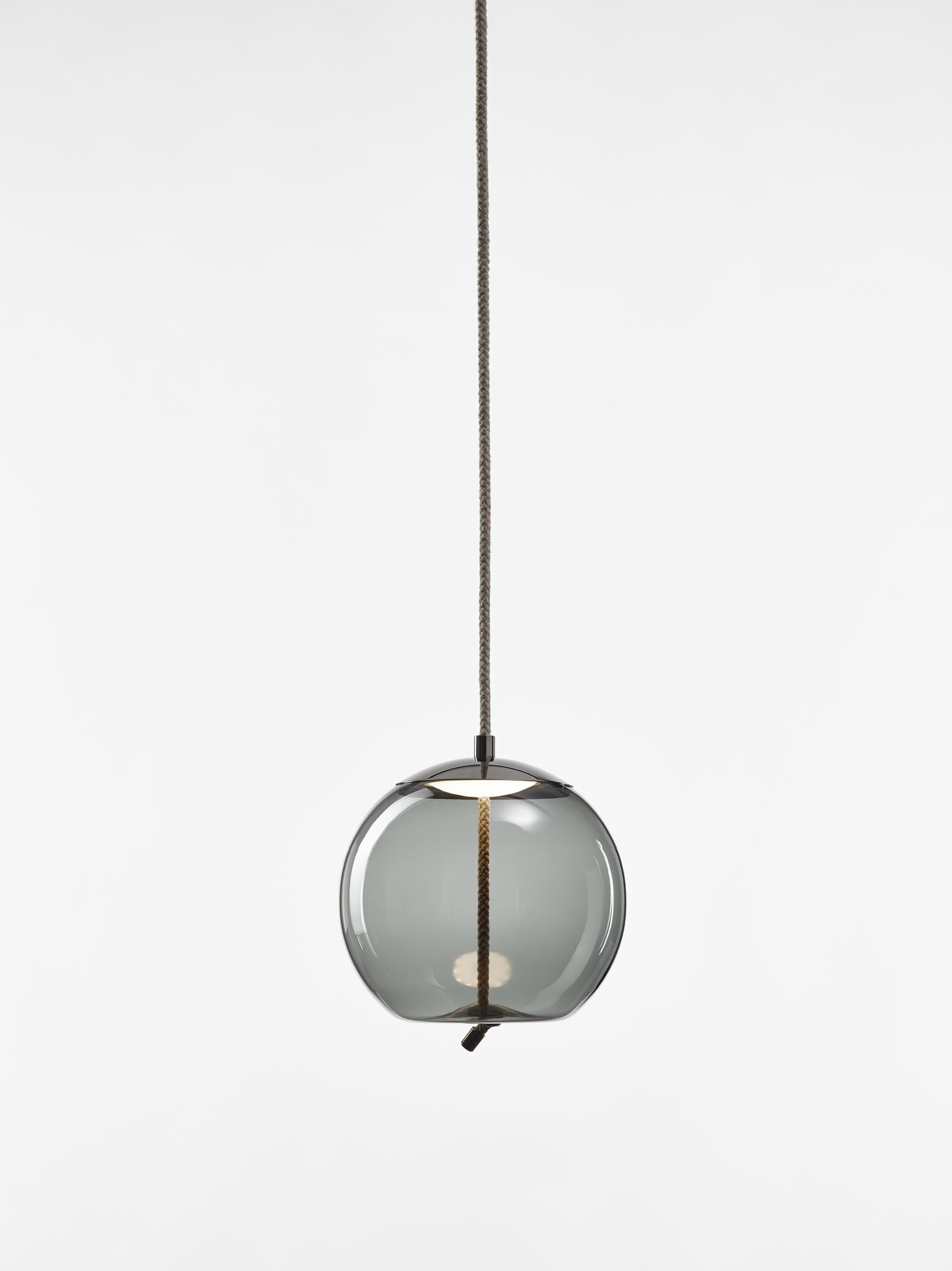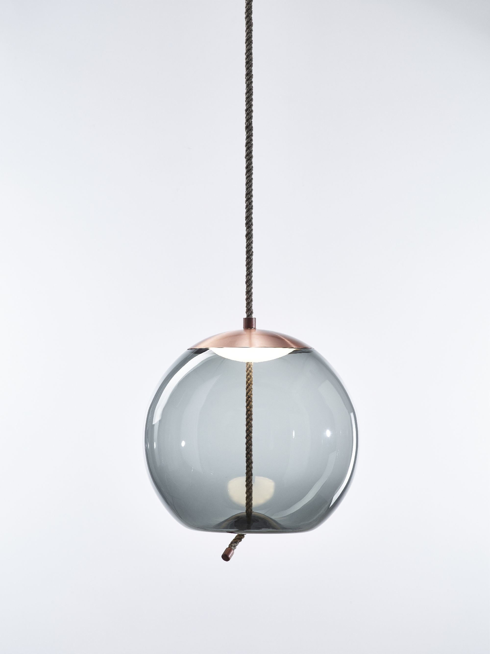 Full-bodied globes of varying shapes and sizes are penetrated by robust cords that seemingly pull the bottom of the glass inward for a bemusing plastic effect. The LED light source is housed in a handsome top hood, which, like the cord end cap, is fashioned in refined metal. The collection comprises four pendant lights of different shapes available in two sizes.