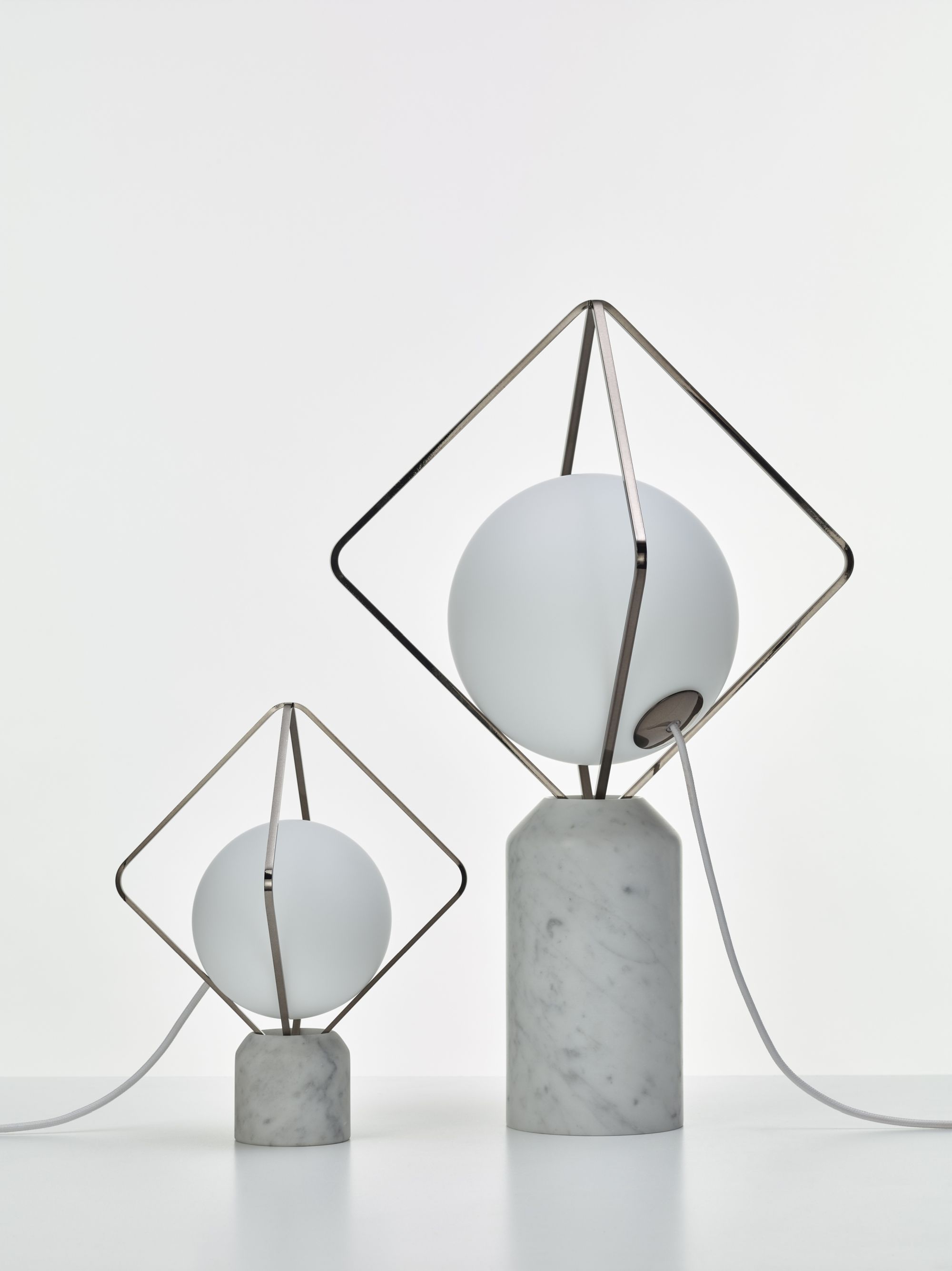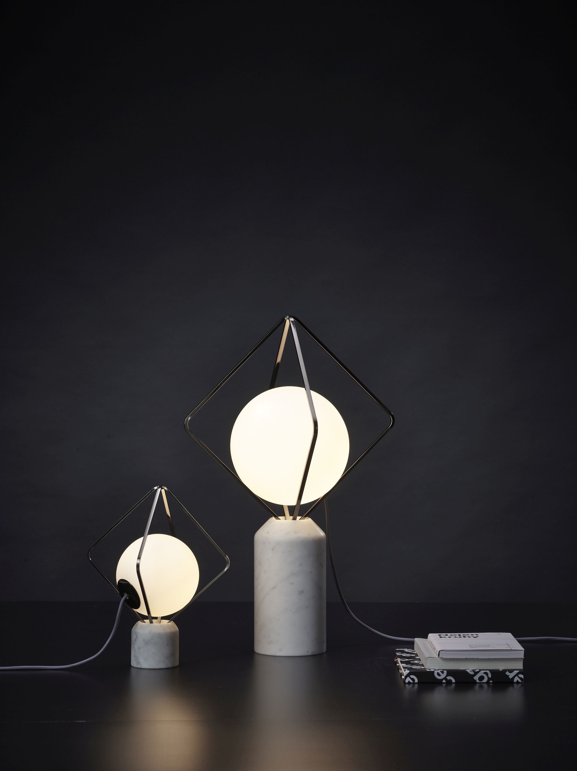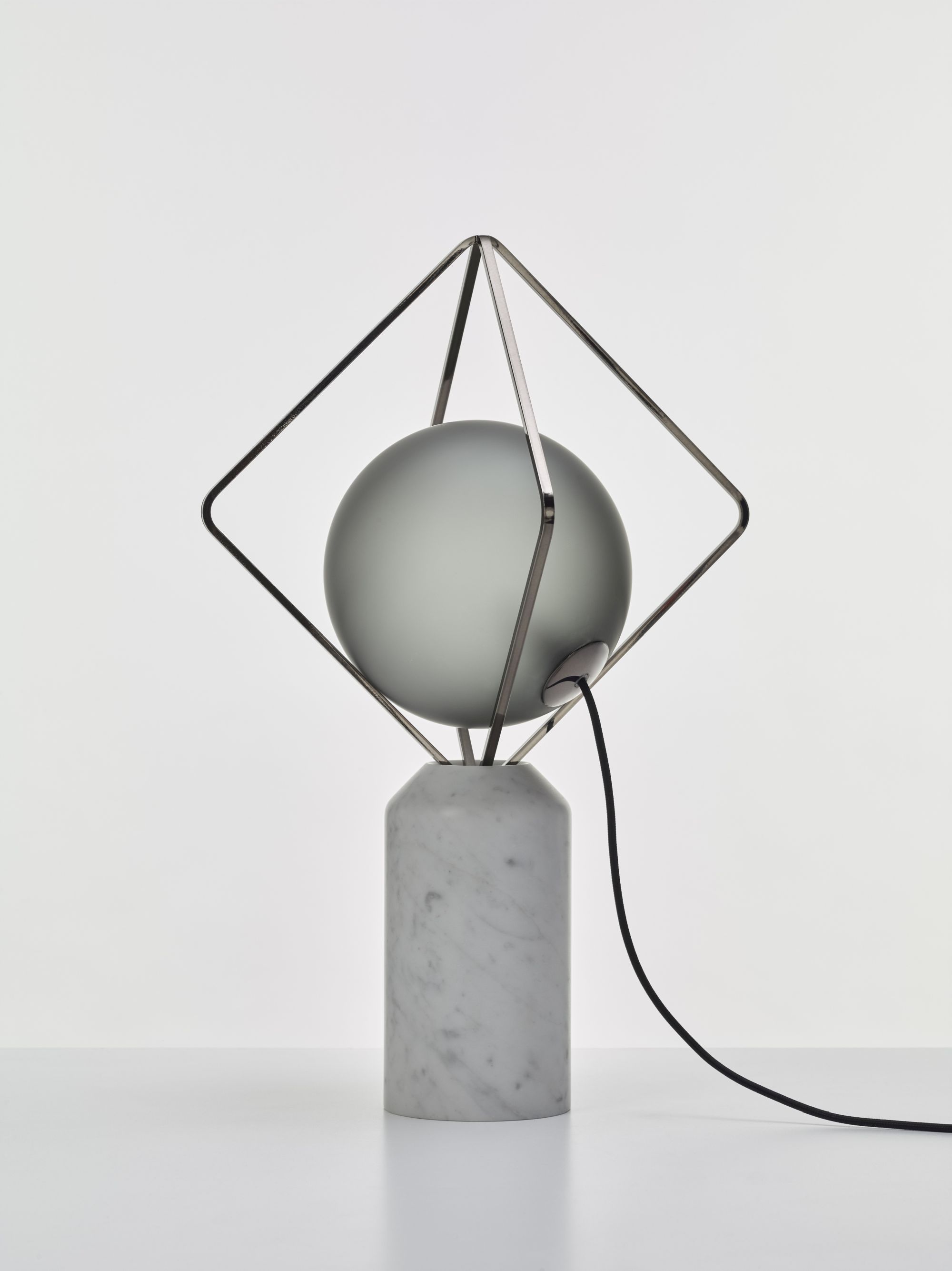 This modern lighting element with marble base, metal frames and a “pearl” placed inside, designed by Lucie Koldova, rounds out the variable Jack O’Lantern family. The new table version combines the beauty of handblown acid etched glass in smoke grey, light pink or triplex opal colours with marble base Carrara or Satinated nero marquinia, in frames with copper, chrome or chrome black liquid metal coating.