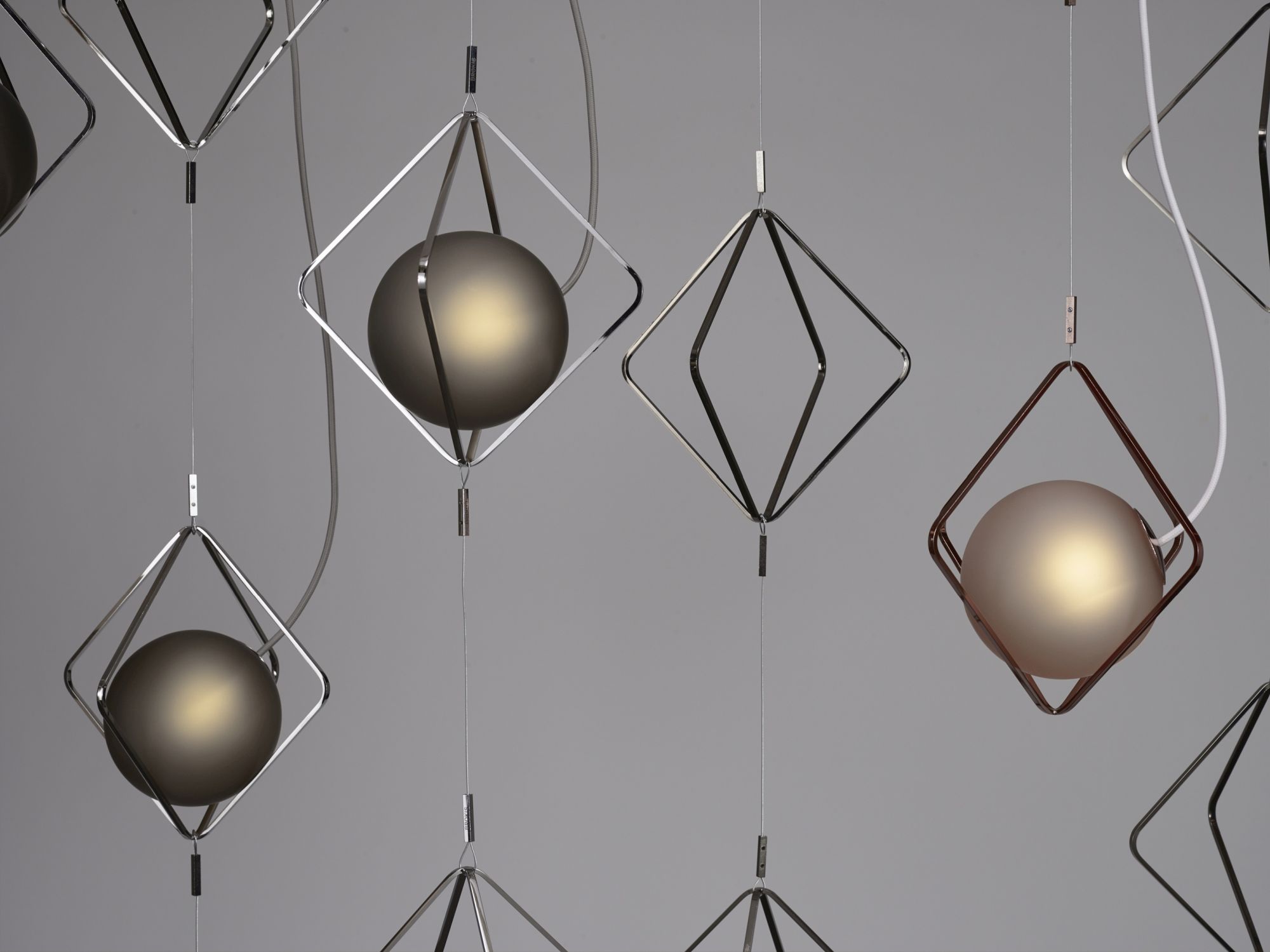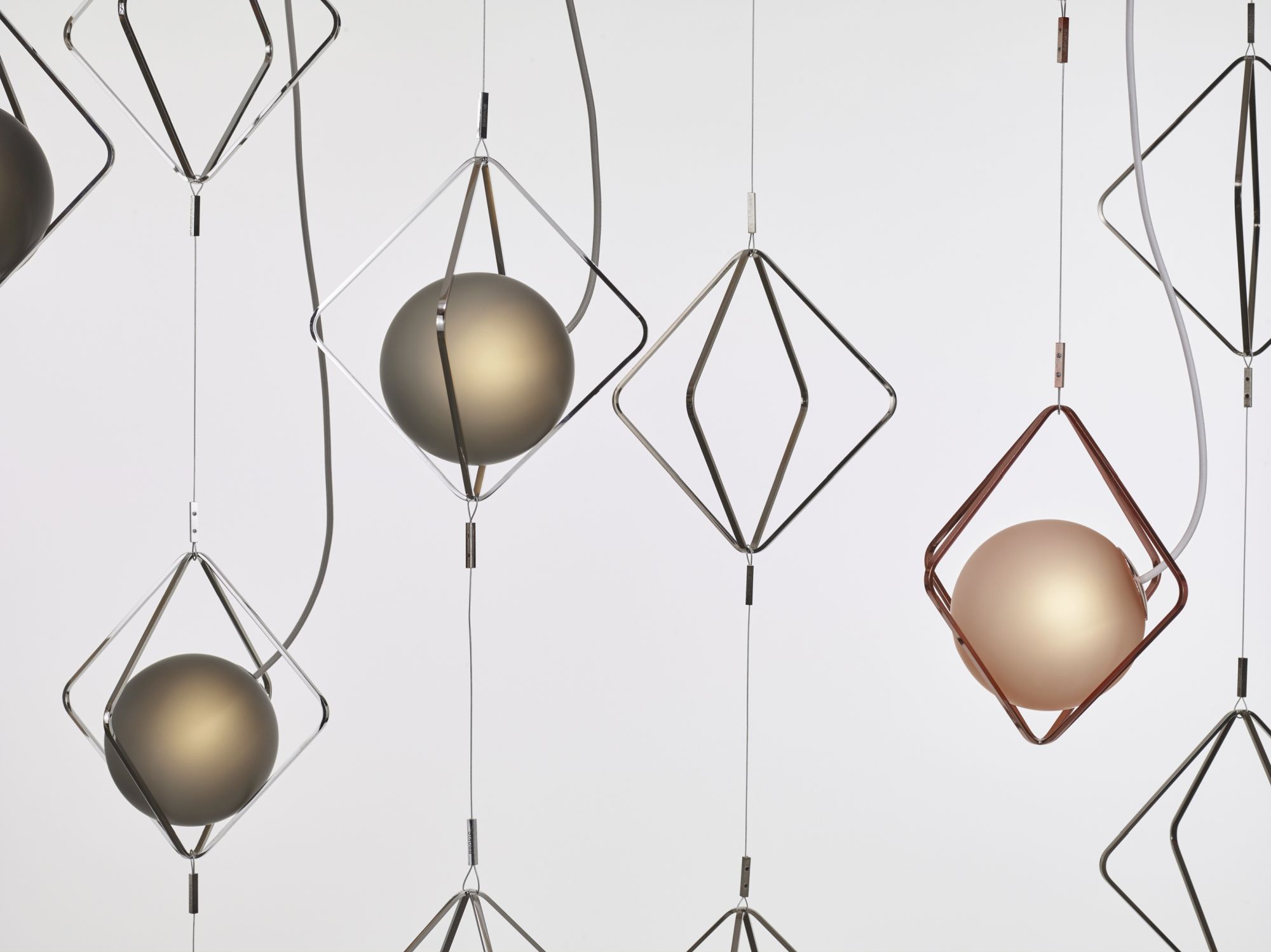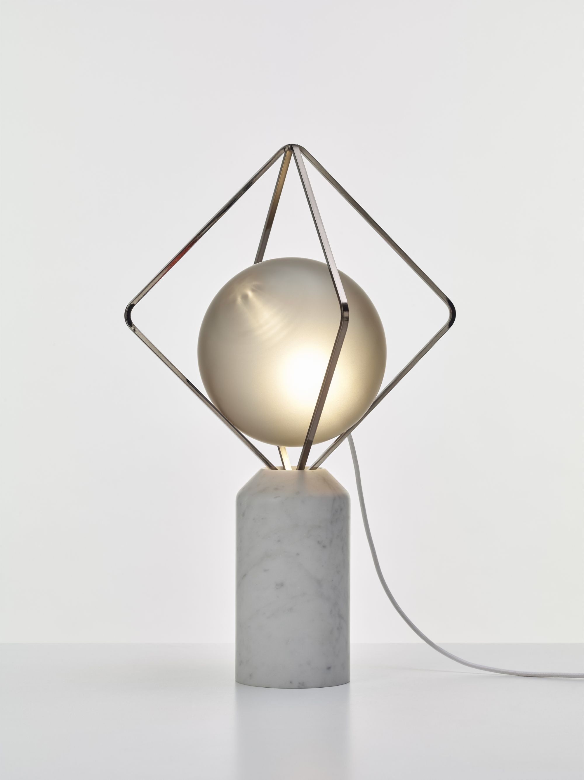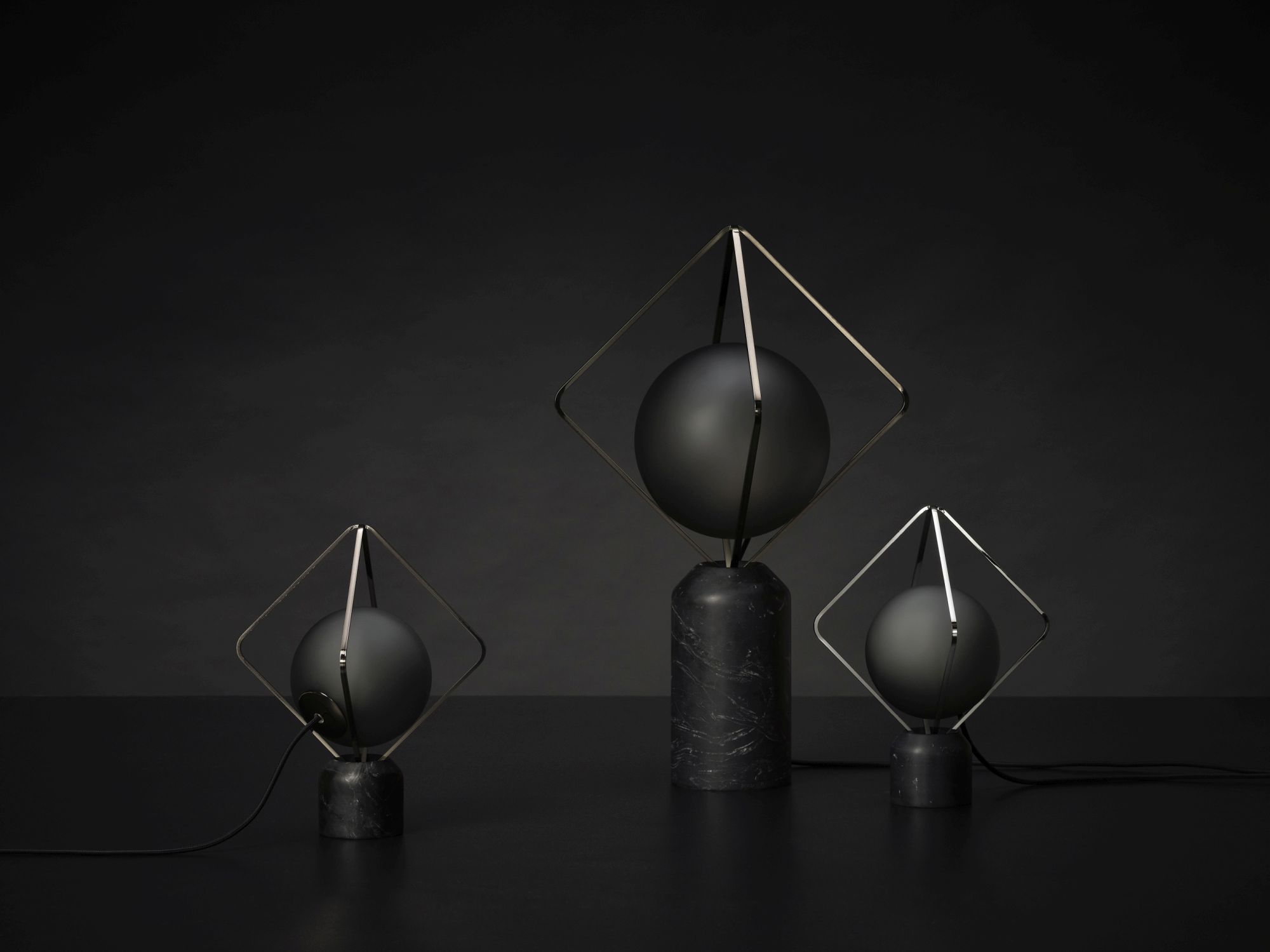 This modern lighting element with marble base, metal frames and a “pearl” placed inside, designed by Lucie Koldova, rounds out the variable Jack O’Lantern family. The new table version combines the beauty of handblown acid etched glass in smoke grey, light pink or triplex opal colours with marble base Carrara or Satinated nero marquinia, in frames with copper, chrome or chrome black liquid metal coating.