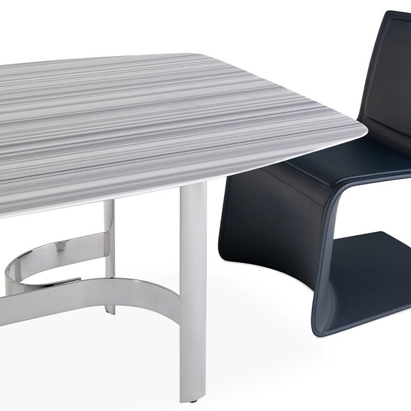 Clean and geometric shapes, the Monaco table embodies a steel structure, top comes in matt lacquered wood Steel Blue or Titanium Silver. Also available with Olympic Striato marble.