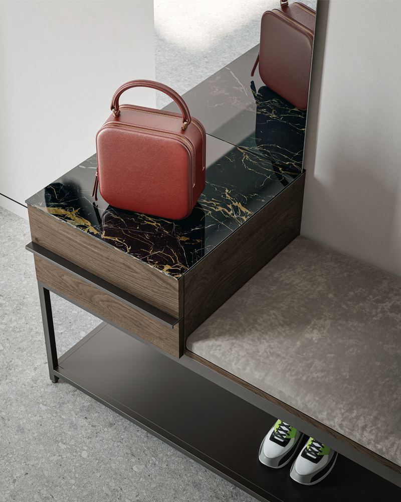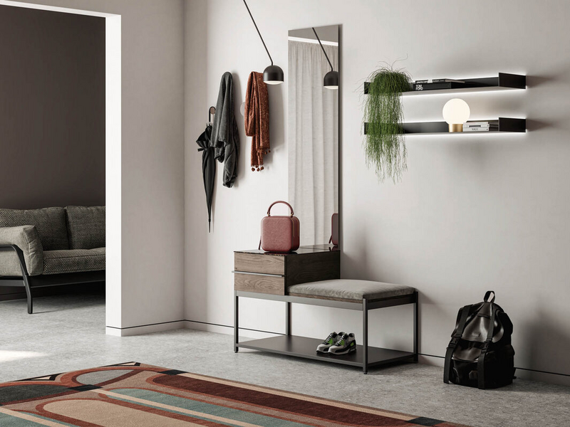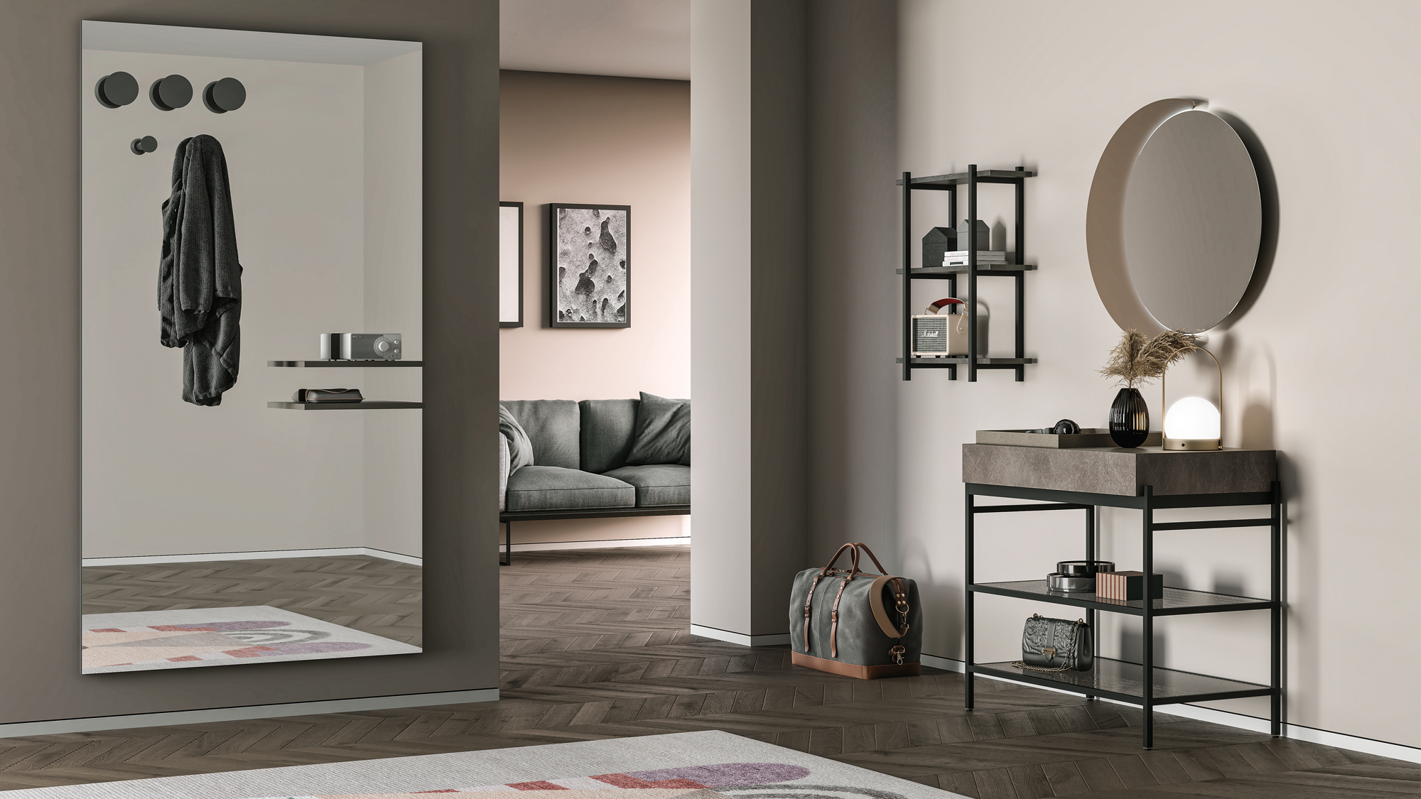 It's the minimalist entrance furniture you don't expect. Inspired by a metal tube with a refined square cross-section, it develops infinite number of possibilities: rational, light, rigorous, airy, elegant, practical and modern. Everyone has his own entrance, equipped to meet his own needs.