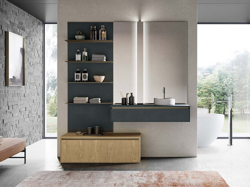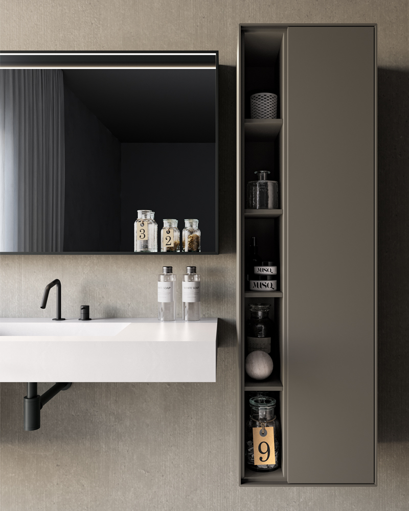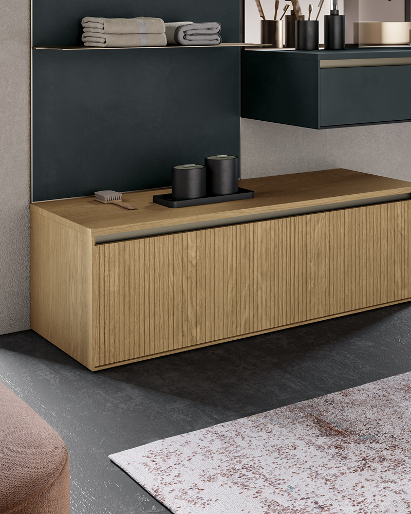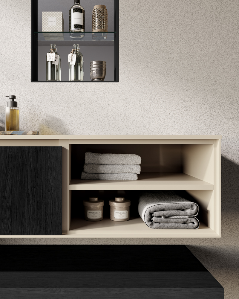 For bathroom furniture with open units, a solution that comes from an important graphic frame: a geometric decoration that enhances the material effect of the surfaces, surrounds the open units and emphasises the volume of the containers. A bathroom furniture with an exclusive design and strong character.