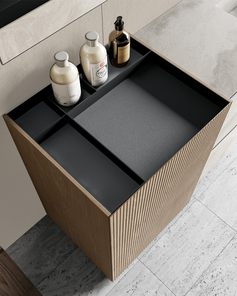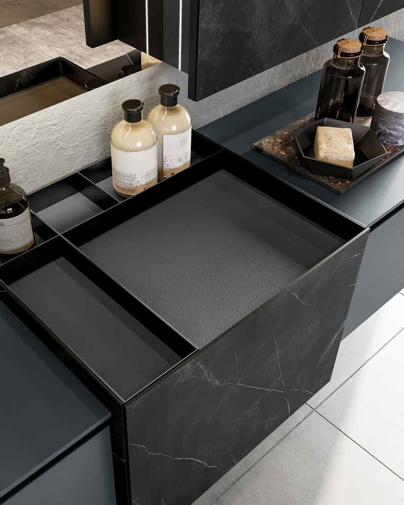 Birex modern bathroom furniture with a strong visual impact. Organisation and rationality are guaranteed by the one-piece element, which stands as the true protagonist of the entire collection. A combination of aesthetics and functionality that plays with modularity and volumes.