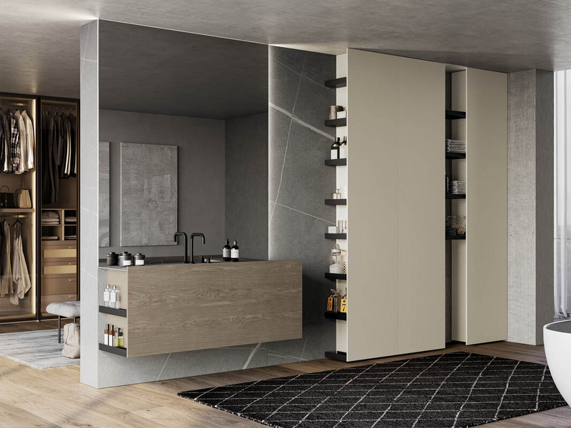 Essential refinement concentrated in a winning combination of storage and aesthetic elegance. The contemporary design bathroom furniture Sail stands out for its unconventional use of geometry, thanks to the projecting doors that draw new functional volumes.