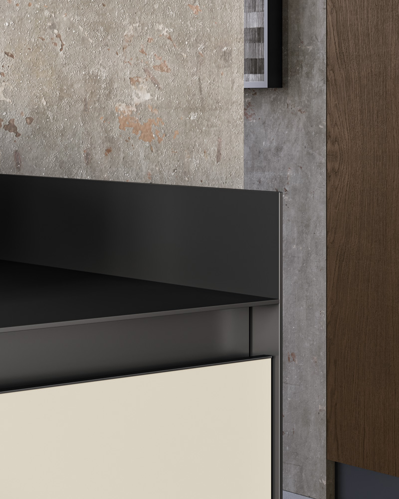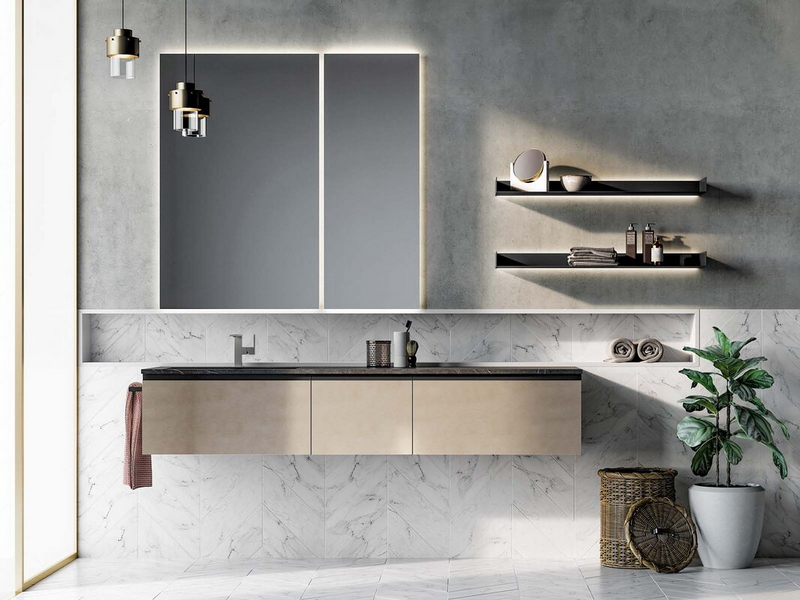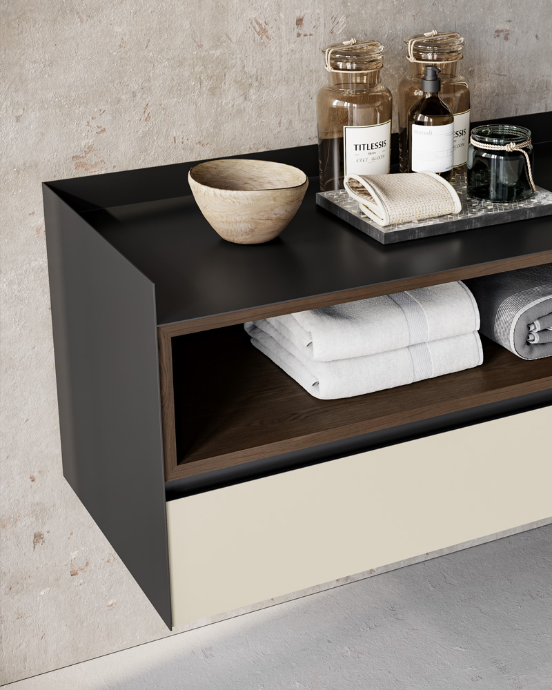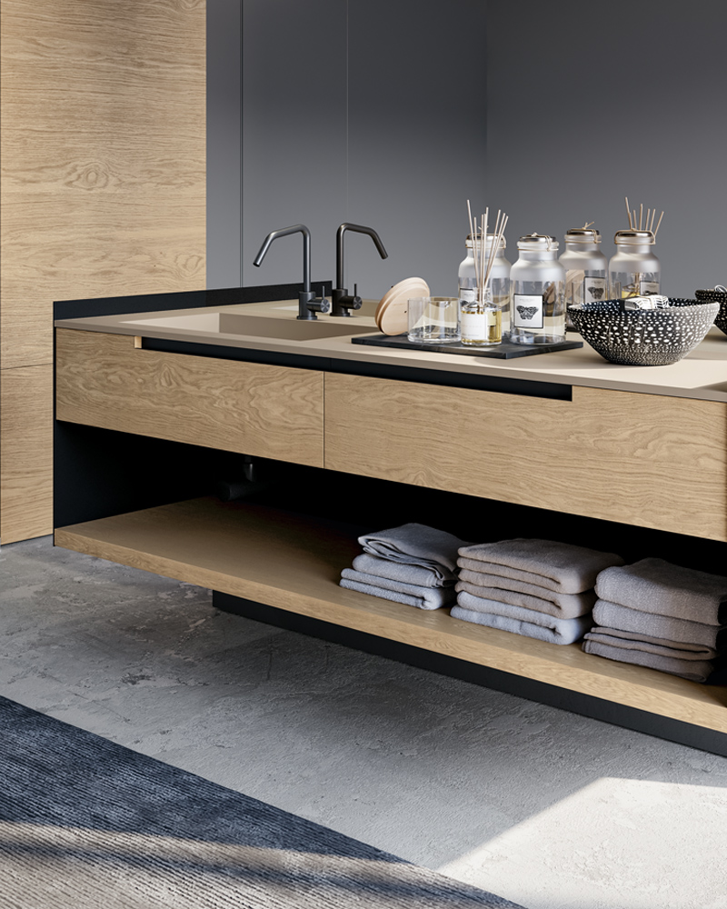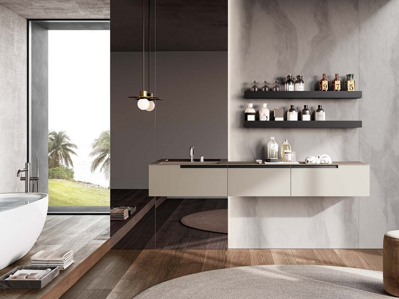 A bathroom furniture range with an essential shapes and clean lines groove opening, in which the research of continuity is realised in the total or partial groove. This creates a distinctive element, which transforms the functionality of the aperture into a decoration for the entire collection.