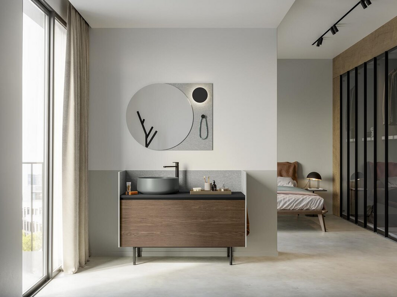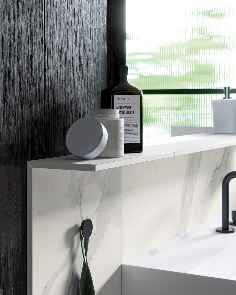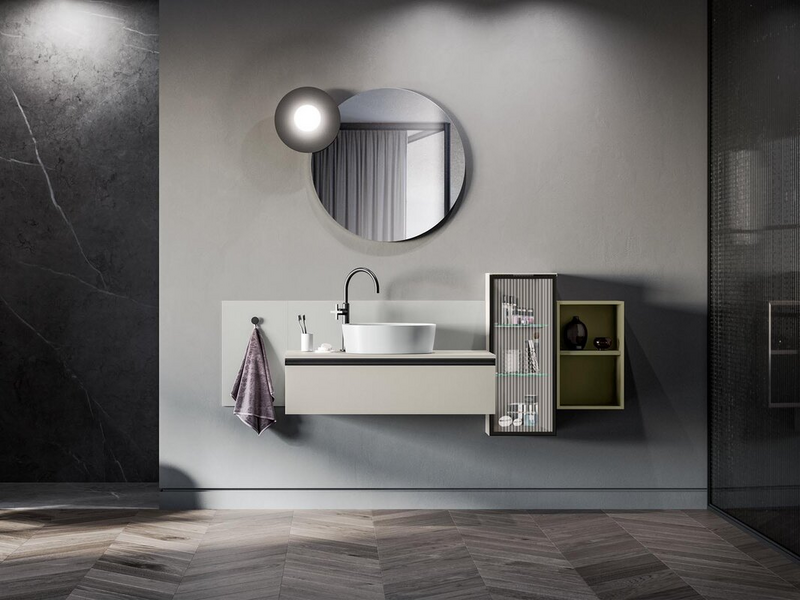 Perfect as a suspended bathroom furniture, which can be designed in a wide range of options, but is also remarkable when mounted on a metal base. Its compositional flexibility is unique, developed around three different depths and a magnificent range of finishes.