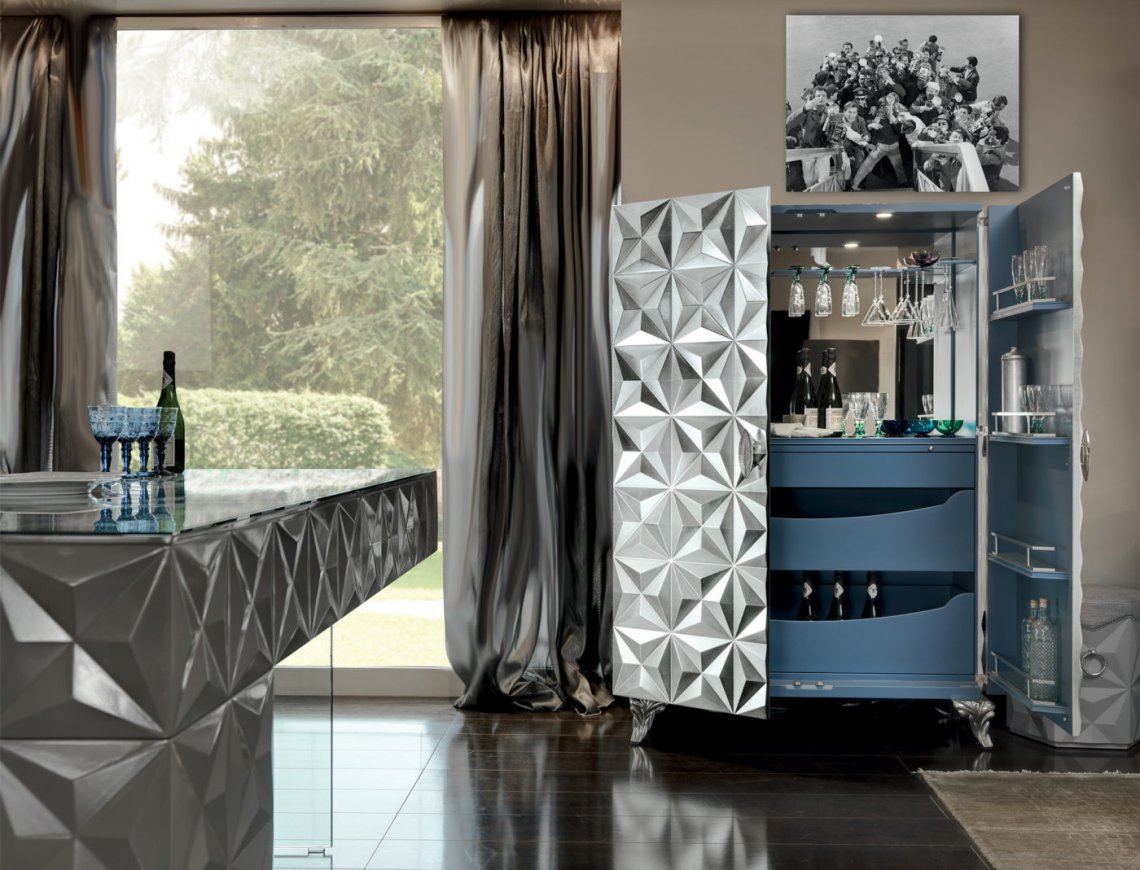 Il pattern Diamond, richiamo architettonico al bugnato, diviene l’elemento chiave che si trasforma in rivestimento per proposte d’arredo dal carattere deciso e di forte impatto visivo.